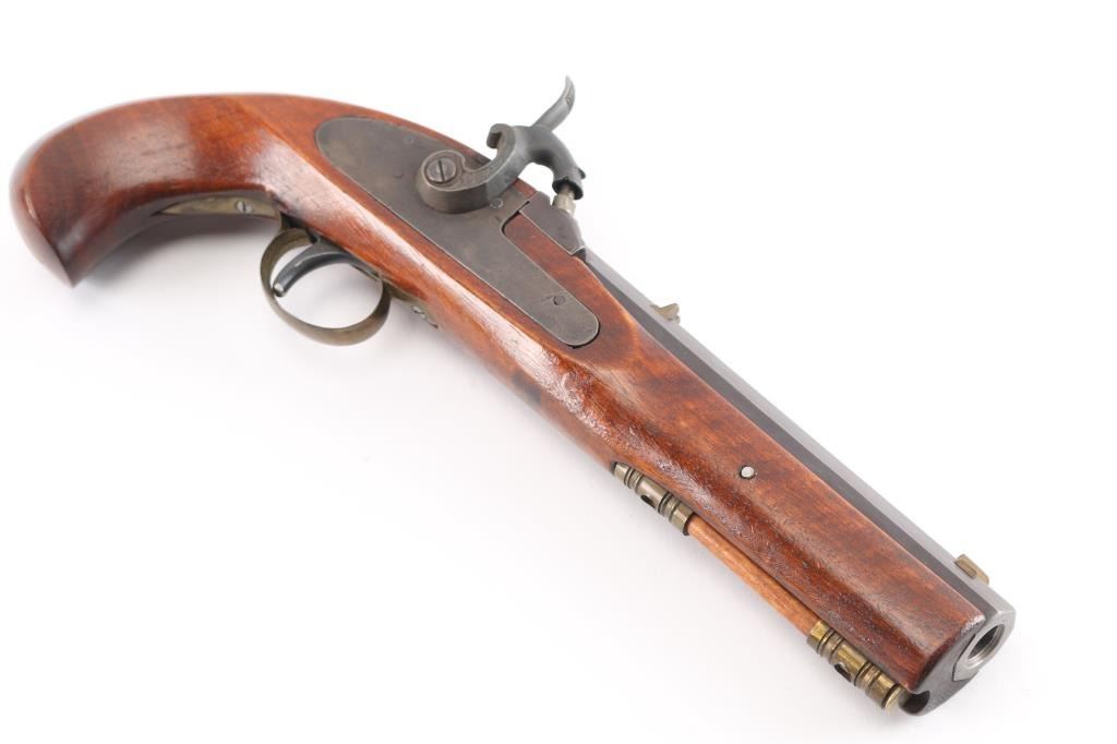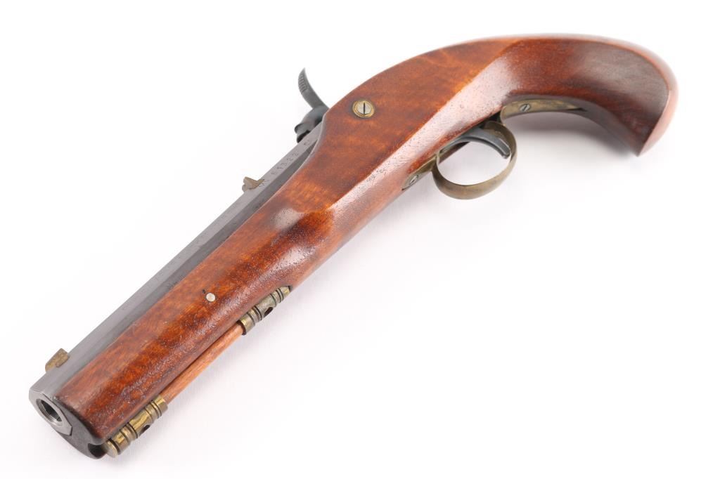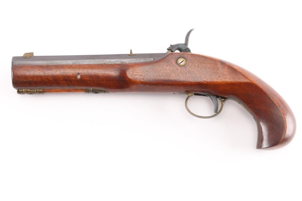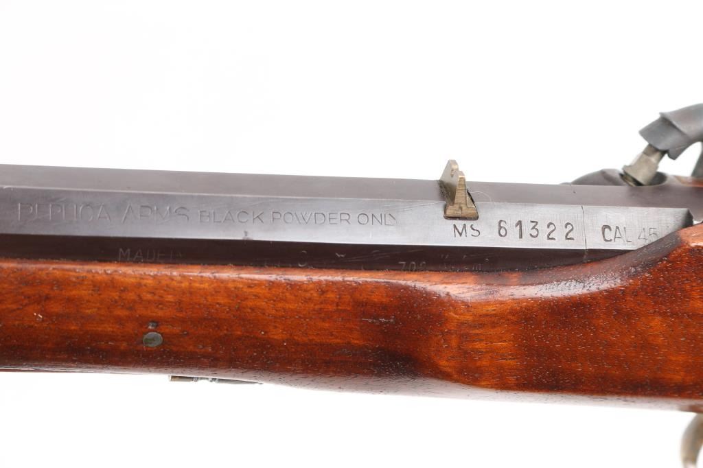 Sn: 61322. Single shot black powder percussion pistol. Italian copy of the Kentucky pistol Imported by the Replica Arms co. El Paso TX. 6 3/4" octagonal barrel, fixed sights, wooden ramrod, brass ramrod thimbles, 1/8 twist. Two cock action is smooth, bore is very good, strong rifling, wood stock is very good/sound. Grayish metal finish. Comes with a heavy duty tool/range bag with 3 tins of No.11 caps, tools, extra nipples,box of 100 Hornady .440 lead balls, packet of lubed patches, 2 bullet seaters , tube of grease patch, powder measure, copper toned powder flask, two brass powder flasks with 30 grain spout, CVA and Traditions and a container of Hodgdon Pyrodex. Everything you need.NRA Condition-Very Good+. Antique Firearm.