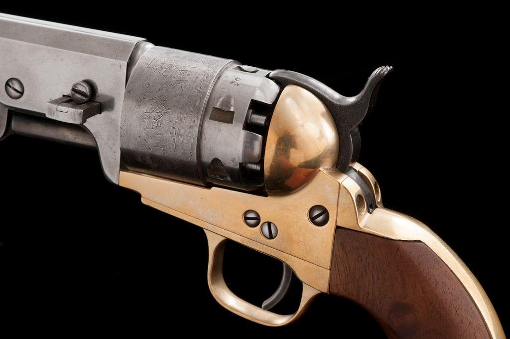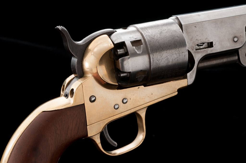 Reproduction Colt Navy Type Percussion Revolver, #75115, .44 cal., unmarked 5'' octagonal barrel, round rebated cylinder with roll-engraved scene of a naval battle, brass frame with various proofmarks on underside at serial number, plain one-piece walnut grips. All visible serial numbers match. Condition is fine as apparently left unfinished from the factory, having clean metal surfaces, sharp edges and clear cylinder engraving. Action is smooth and crisp; bore appears clean with sharp rifling. Est.: $250-$450. (Antique)