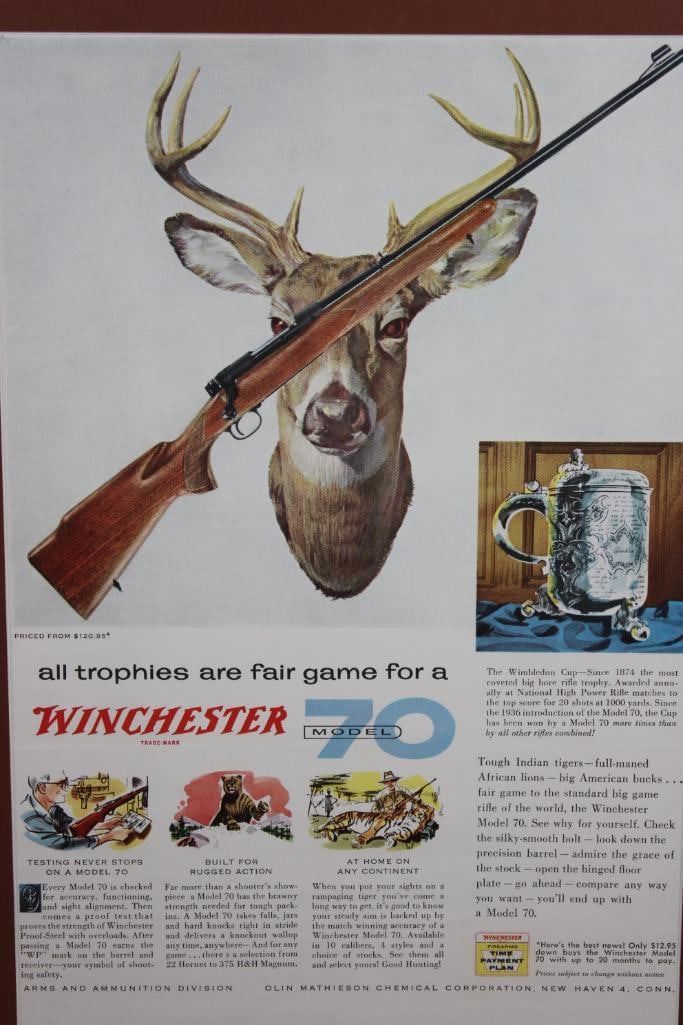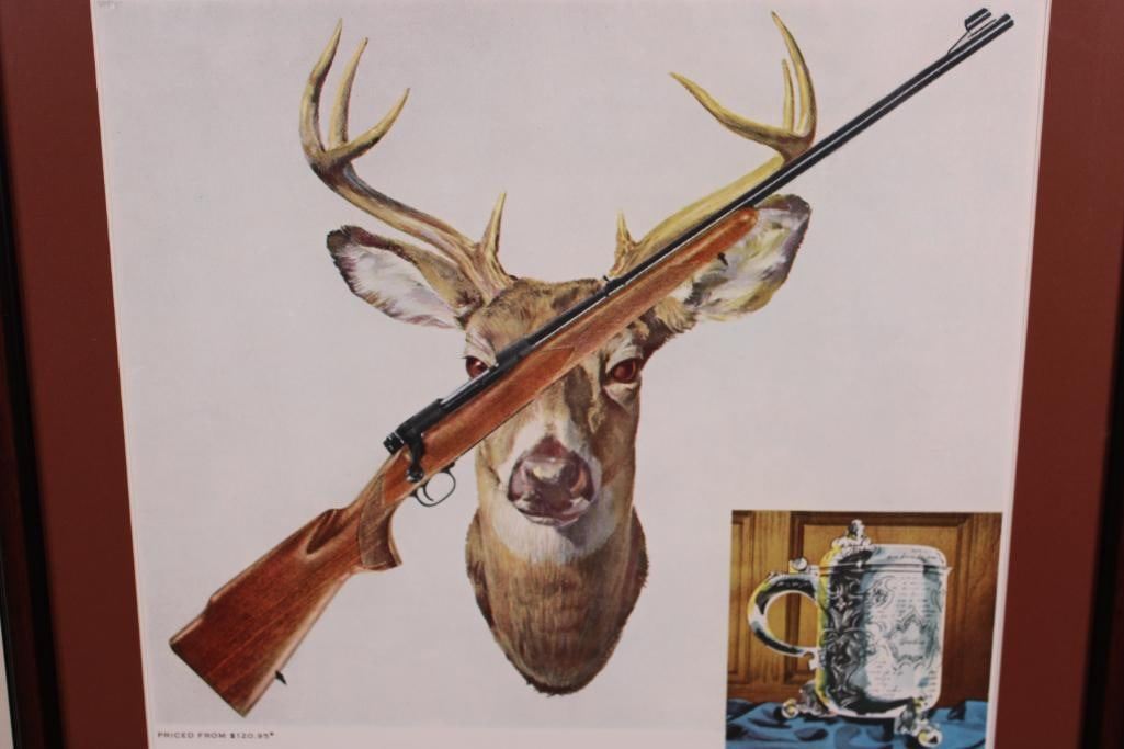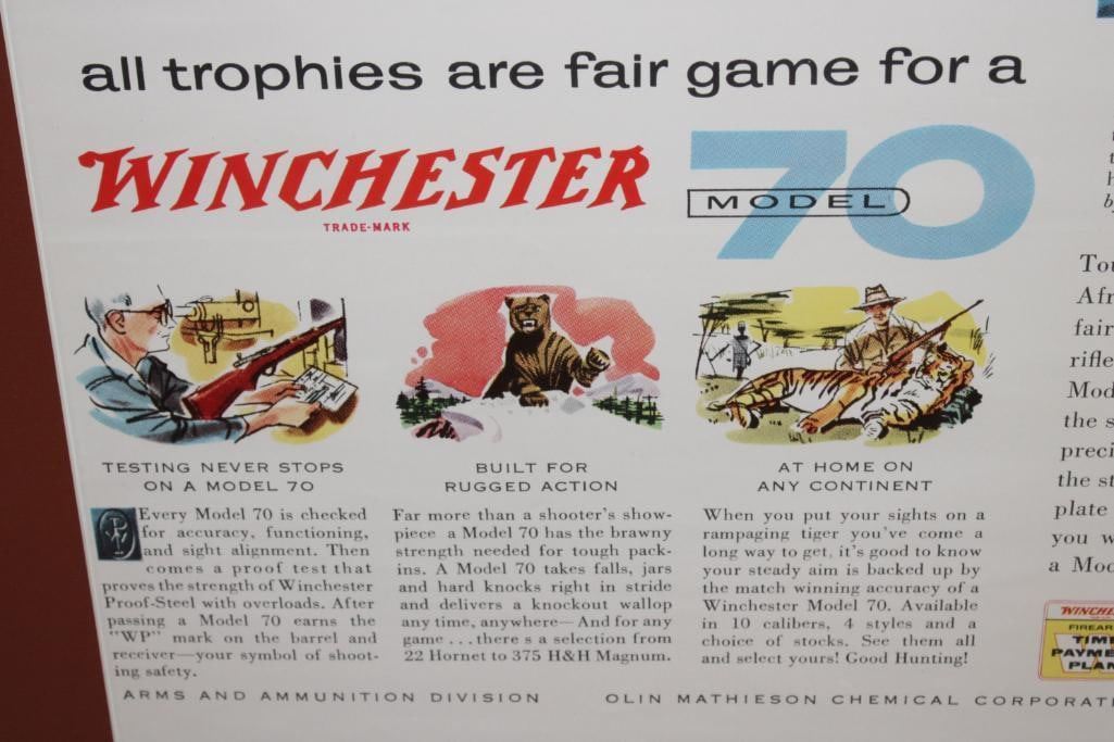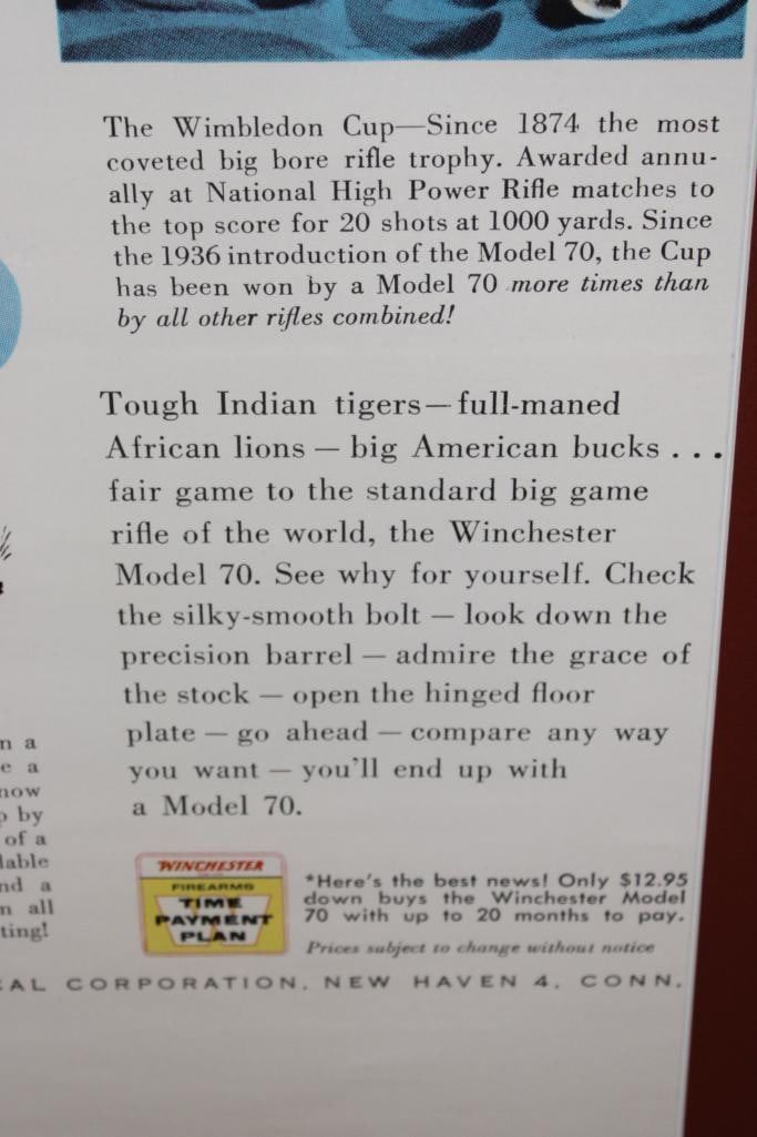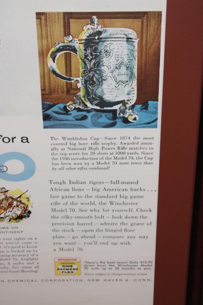 Reproduction (The image has been enlarged) framed Winchester Model 70 Rifle Advertisement from True Magazine 1965. It is in a nice 40.75" Long x 28.75" Wide wood and glass frame. COLLECTIBLE HUNTING ADVERTISEMENT