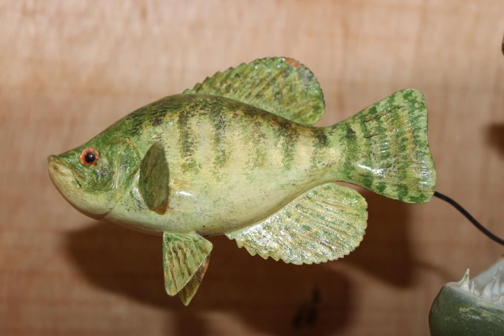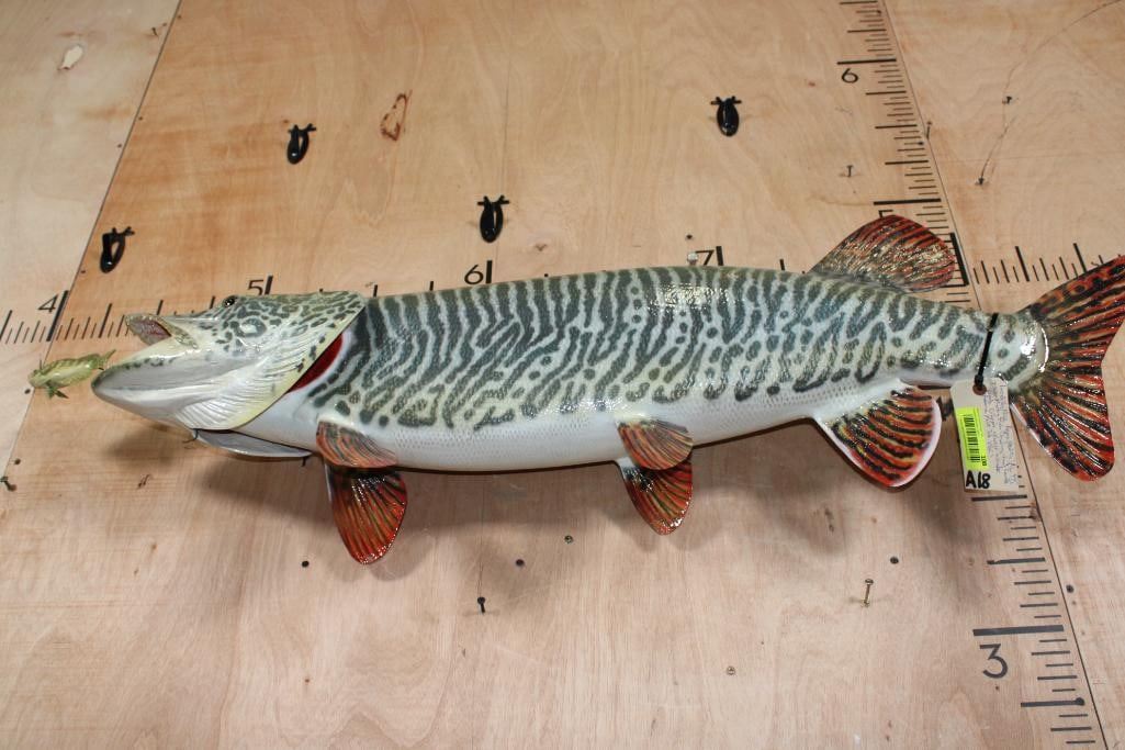 Incredibly Nice Reproduction XL TIGER MUSKY Fish Mount. It measures 44" Long and looks very realistic. He is chasing a Hand-carved Wood Crappie with an awesome paint job and the artist's initials (on the bottom). These are in Very Good Condition. TAXIDERMY FISH
