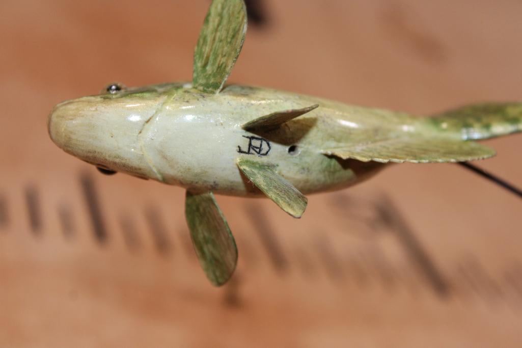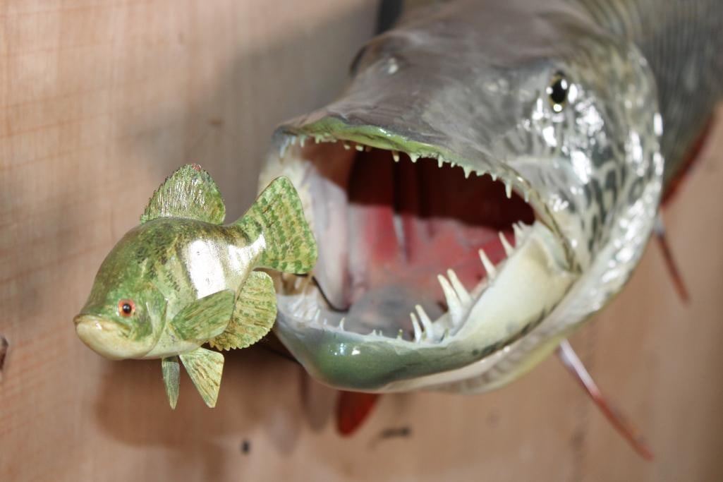 Reproduction XL TIGER MUSKY Fish Chasing a Hand-carved Wood Crappie