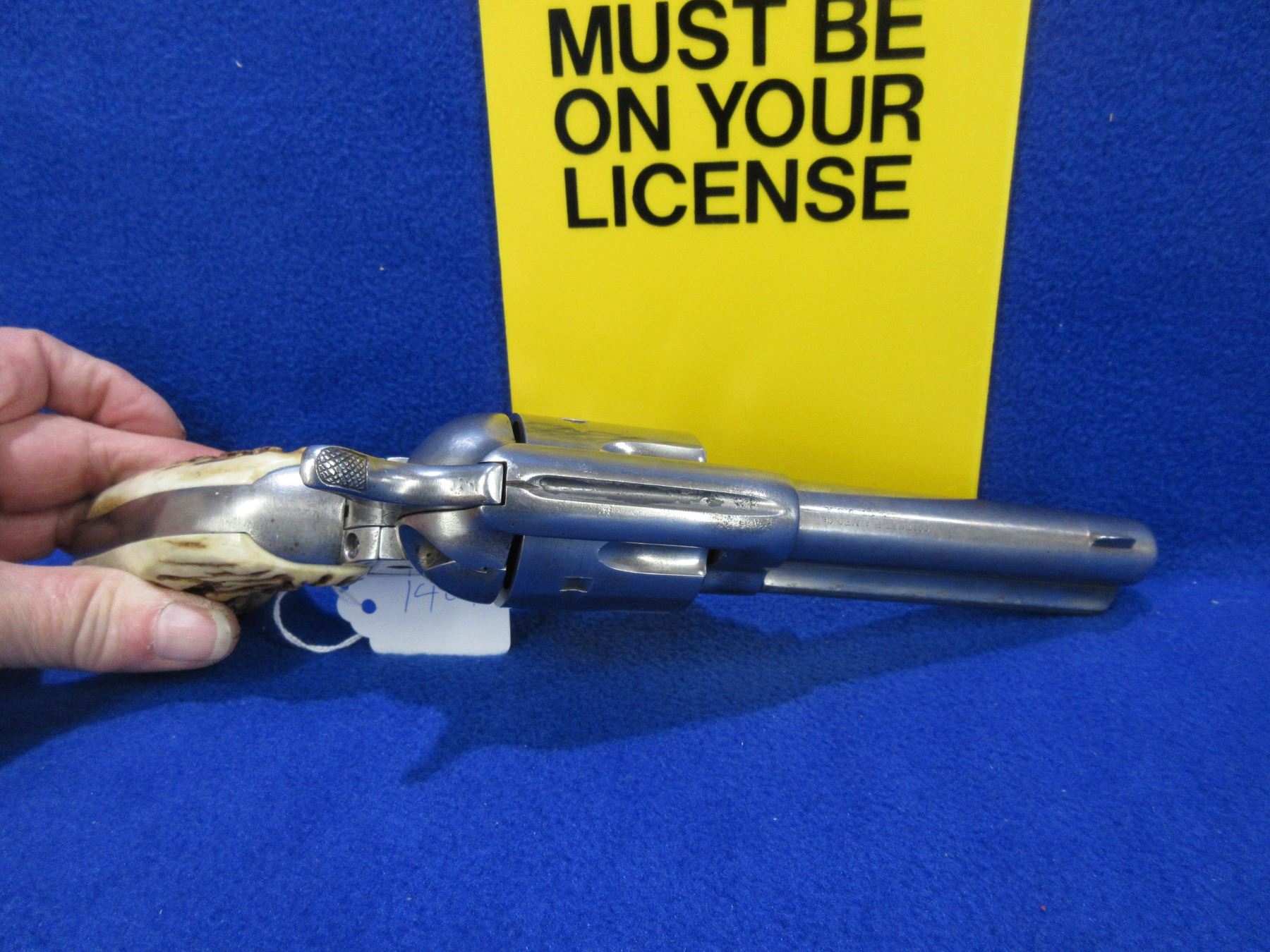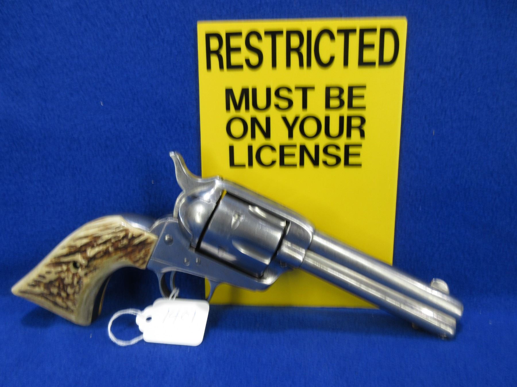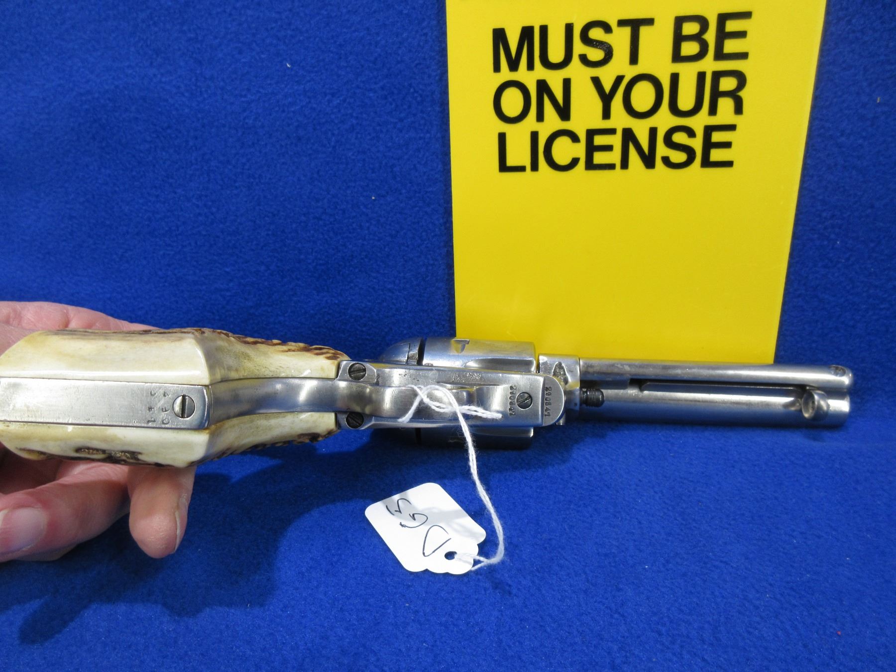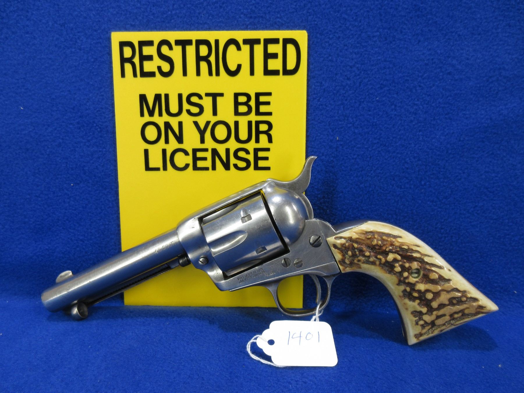 Restricted - Colt 1873 SAA in 45 Colt - Made in 1907 - This 6 shot revolver appears to be in good to very good working order. Barrel is 120MM, rifling good with some pitting, nickel finish good, has fixed sights, stag horn grips are very good, Ser # 290847