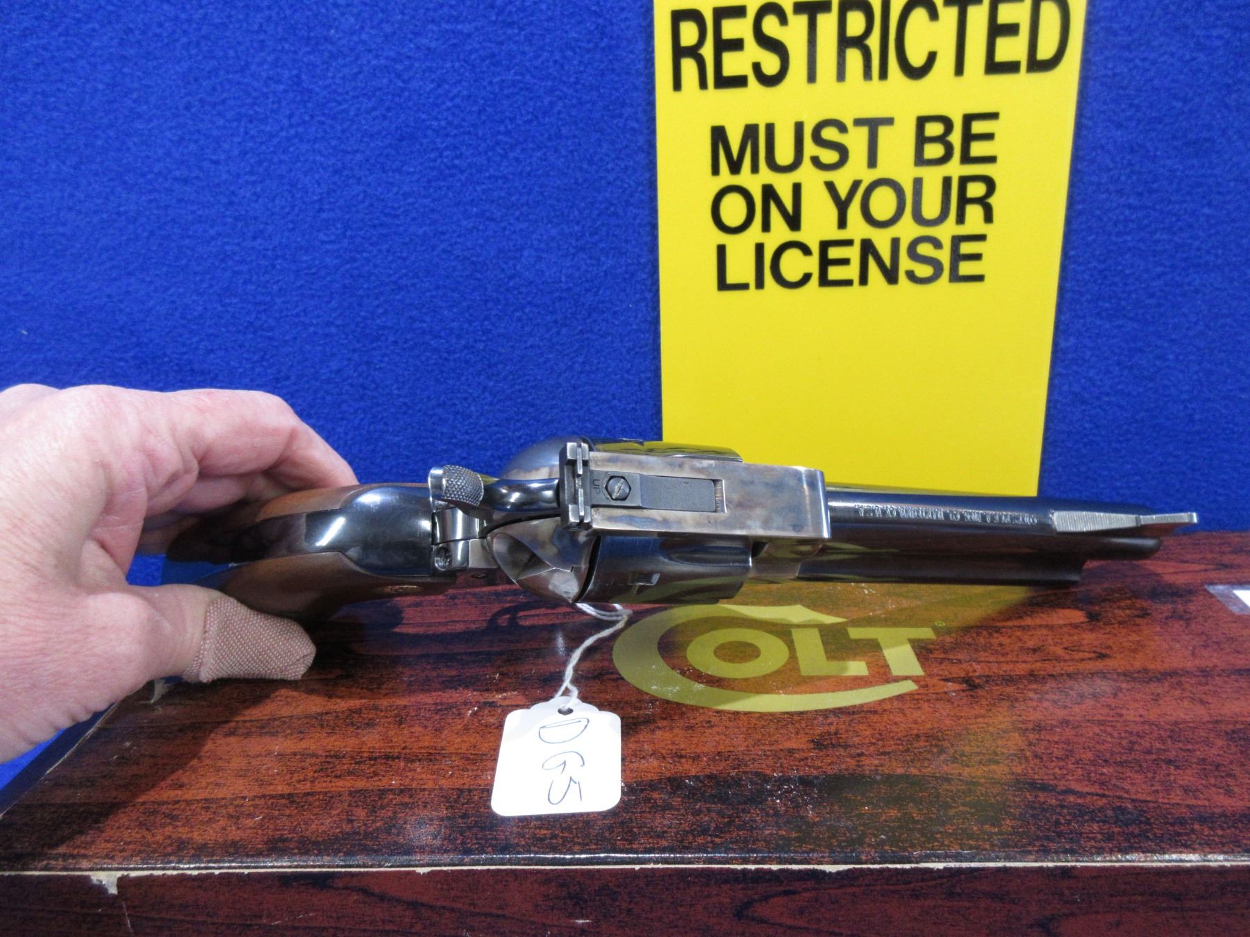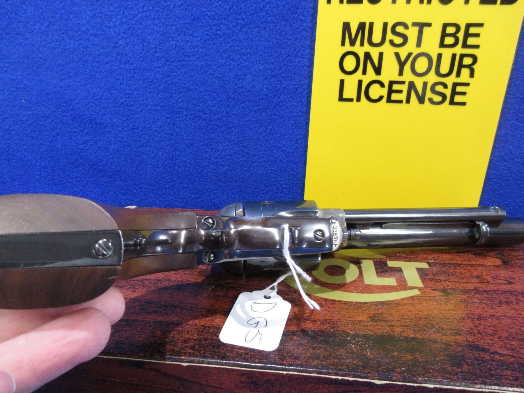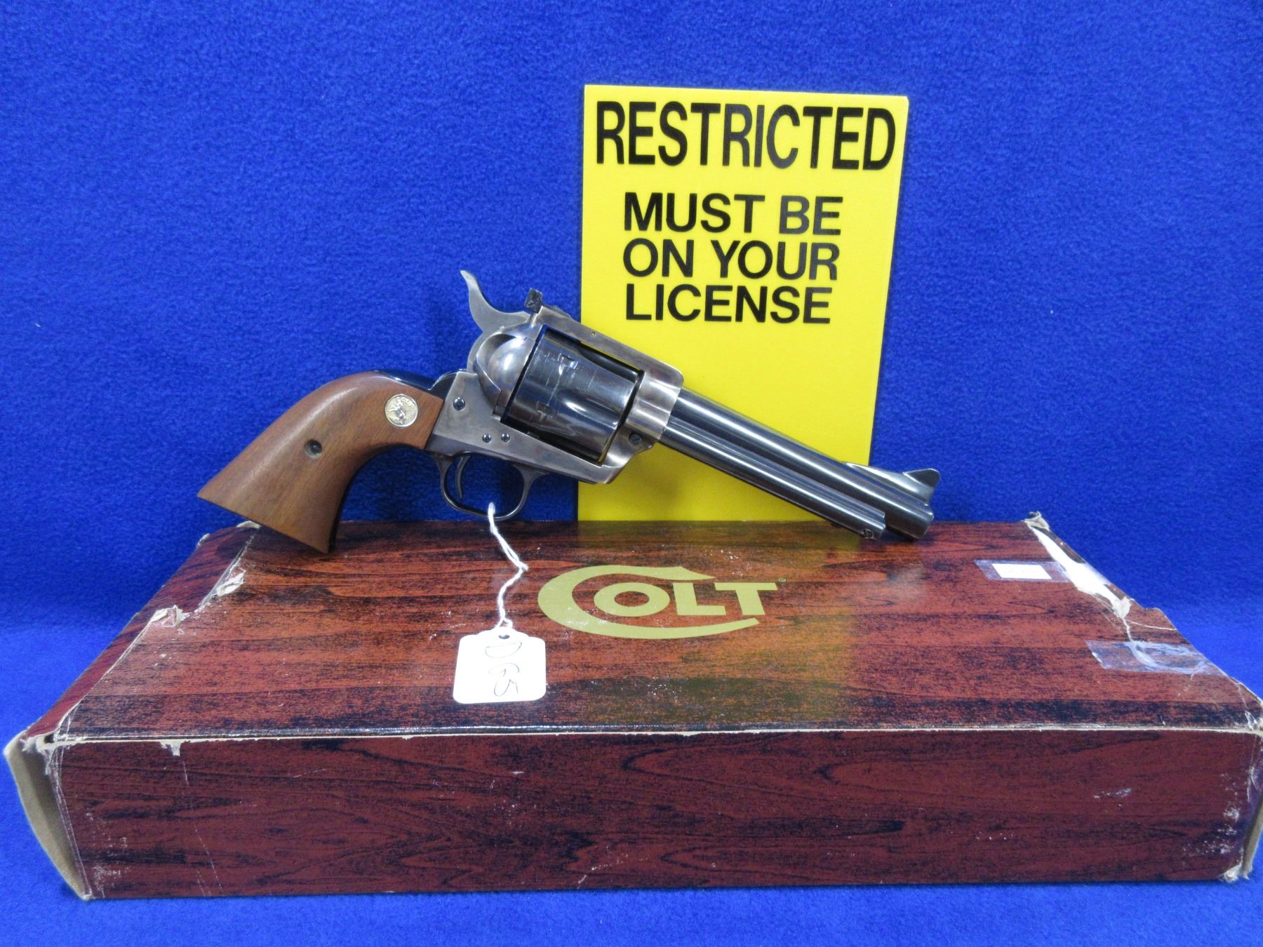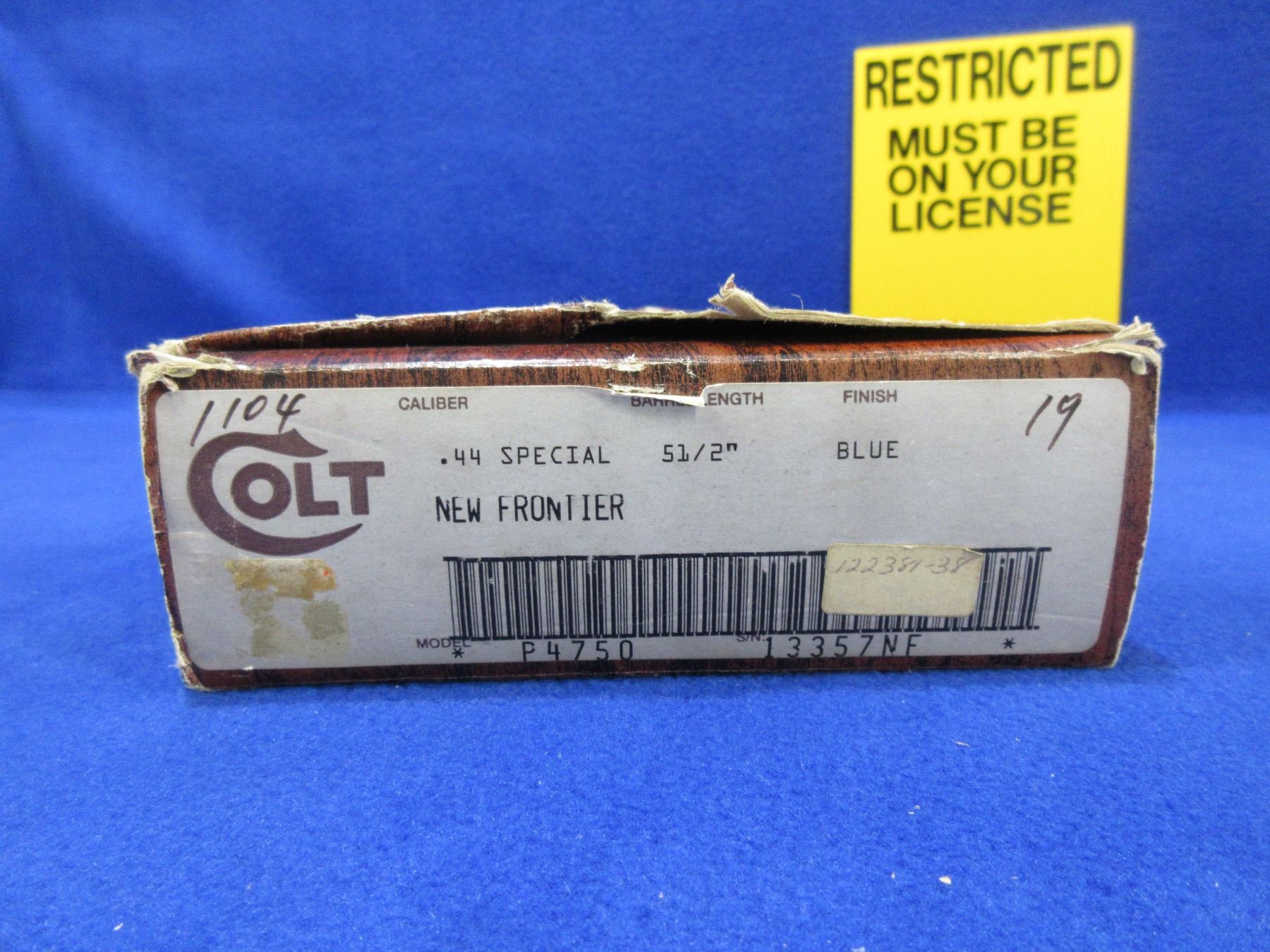 Restricted - Colt SAA New Frontier in 44 Special - Made 1961 to 1975 - This 6 Shot Revolver appears to be in very good working order. Barrel is 140MM, rifling very good, bluing good to very good, case hardened finish very good, has fixed front sight, adjustable rear sight, wood grips are very good but have very small chip on bottom of both grips, comes with original box, Ser # 13357NF