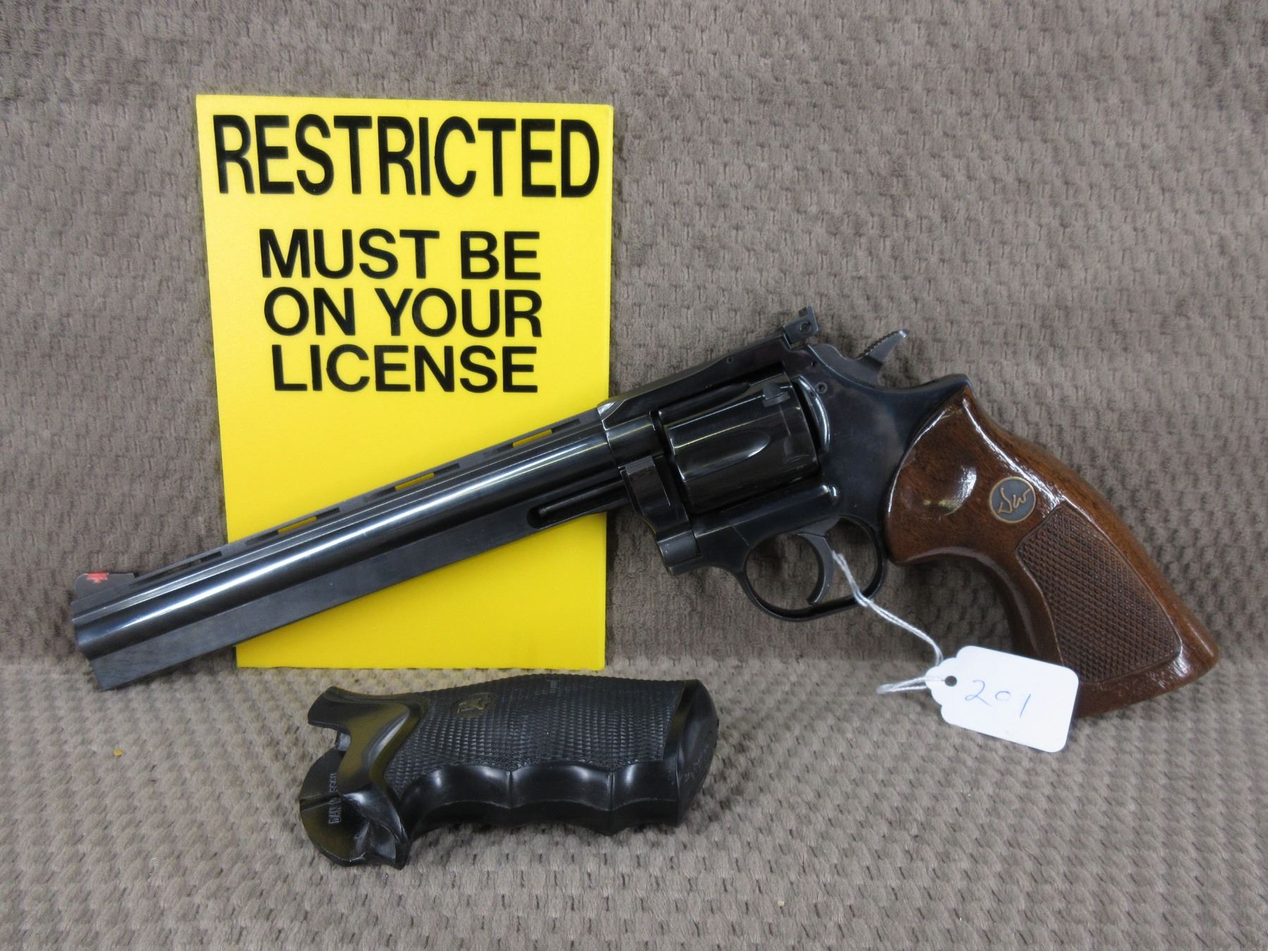 Restricted - Dan Wesson Model 15 in 357 Magnum - This double action, 6 shot revolver appears to be in very good working condition. Barrel is 203MM, rifling very good, bluing is very good with 2 marks on bottom, has both sights rear is adjustable, wood grips are very good and comes with a Pachmayr Gripper, Ser # 248930