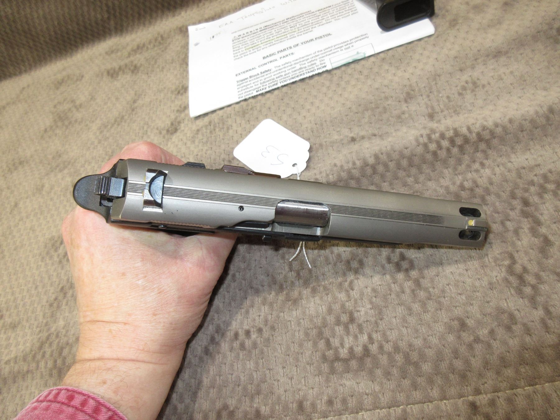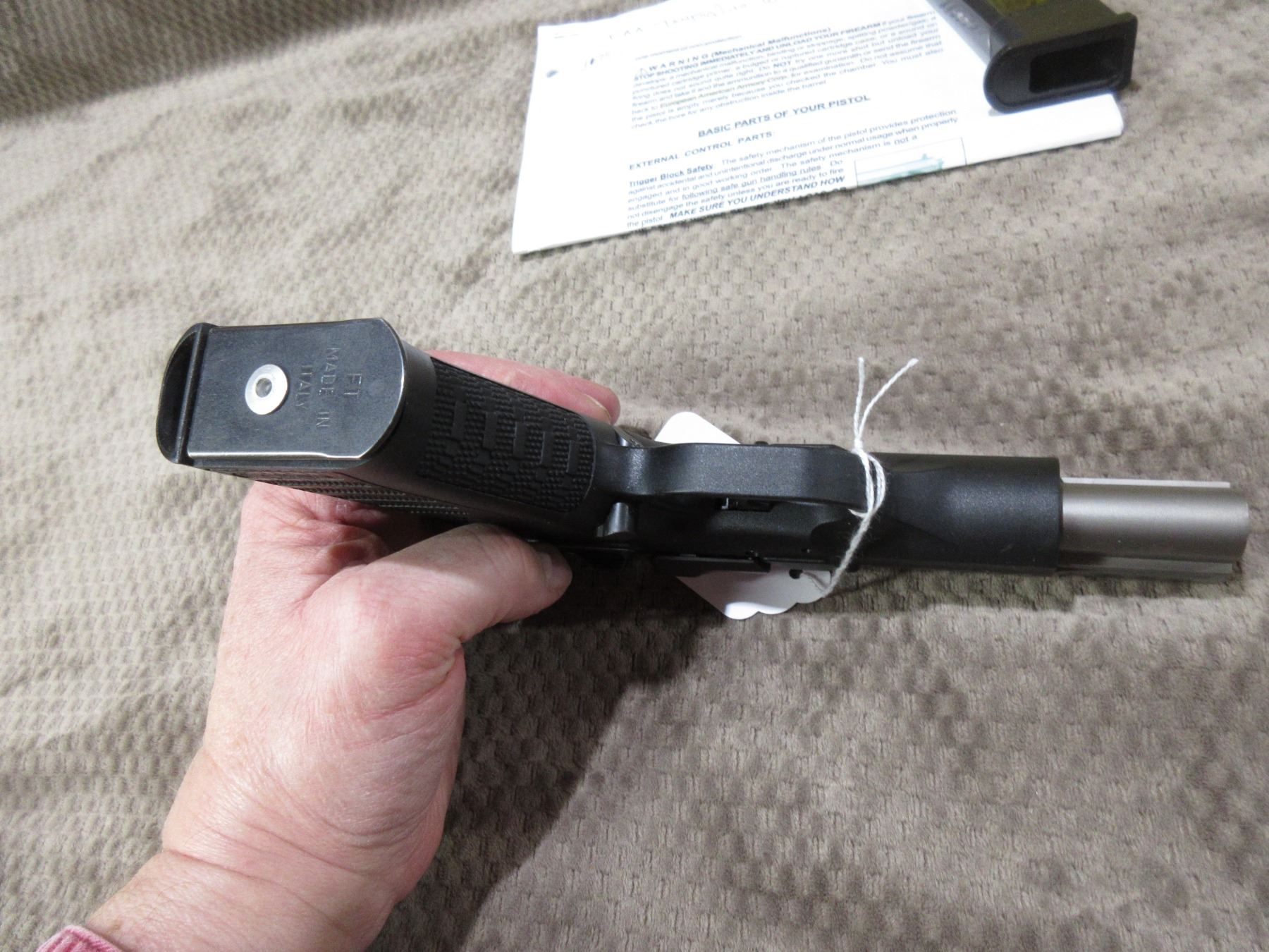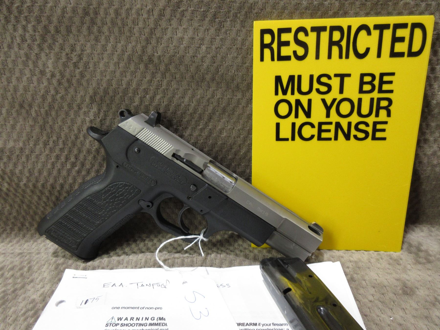 Restricted - EAA Model Witness P-S in 9MM Luger - This semi-auto, magazine feed pistol appears to be in good to very good working order. Barrel is 114MM, rifling is good to very good, finish is good to very good with minor usage marks, has fixed front sight adjustable rear sight, grips assembly good to very good. Gun was made by Tanfoglio, comes with extra magazine and printed instructions. Serial # AE97717