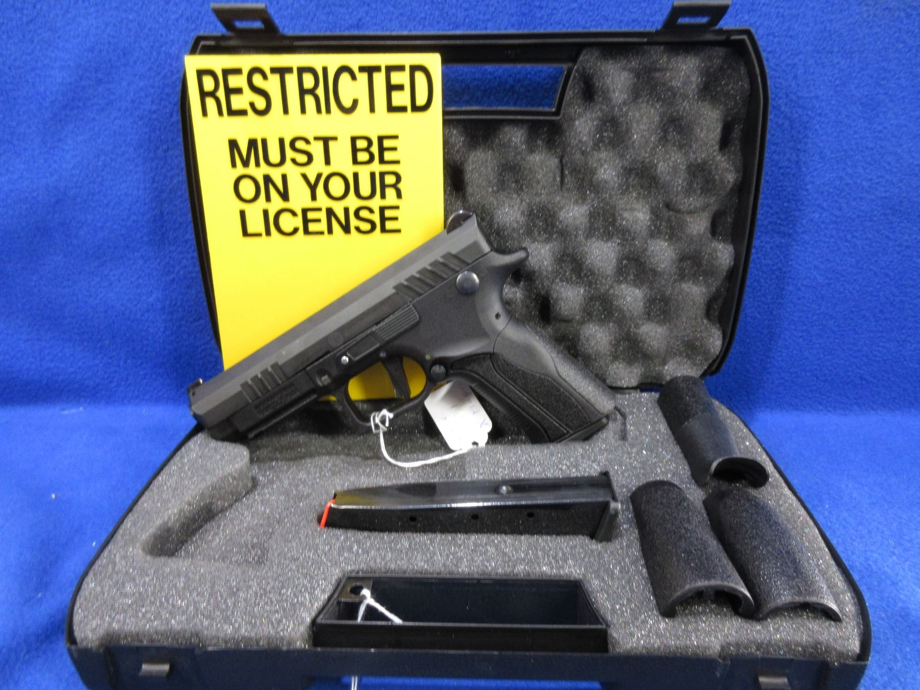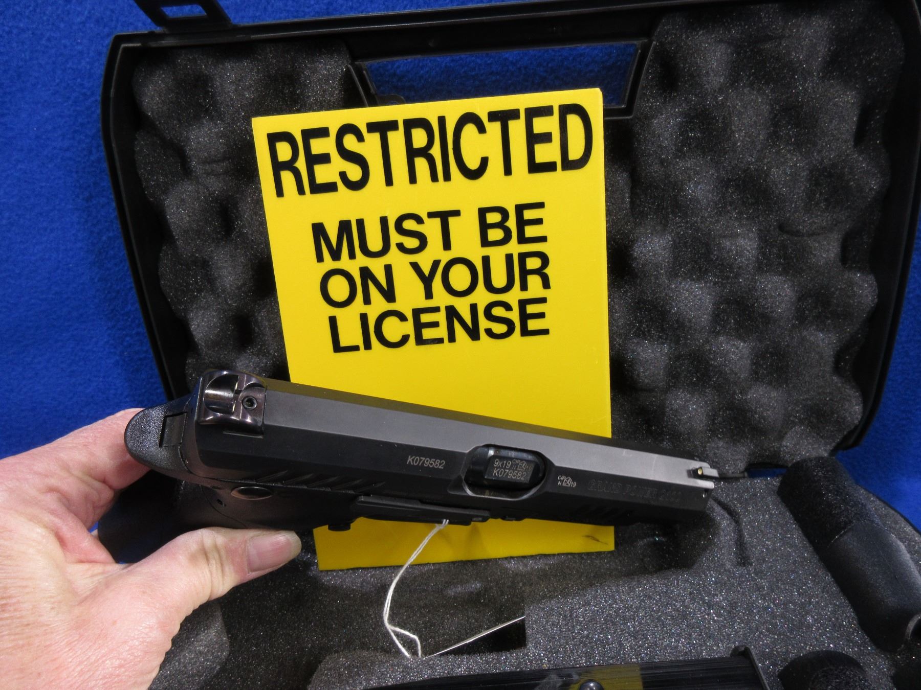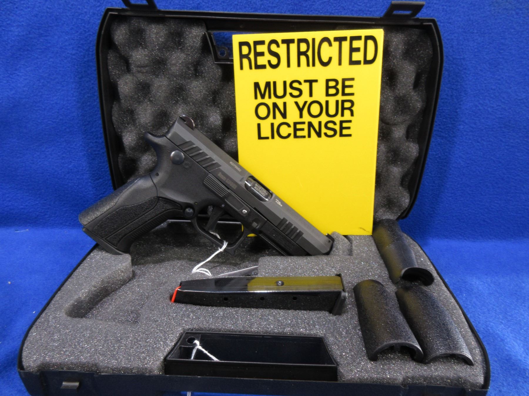 Restricted - Grand Power Model Q100 in 9MM - This semi-auto pistol with 2 magazines appears to be in like new condition. Barrel is 108MM, rifling very good, black finish very good, fixed front sight, adjustable rear sight, synthetic grips are very good, comes with original case, manual, cleaning brush, 2 extra sights and interchangeable grips. Ser # K079582