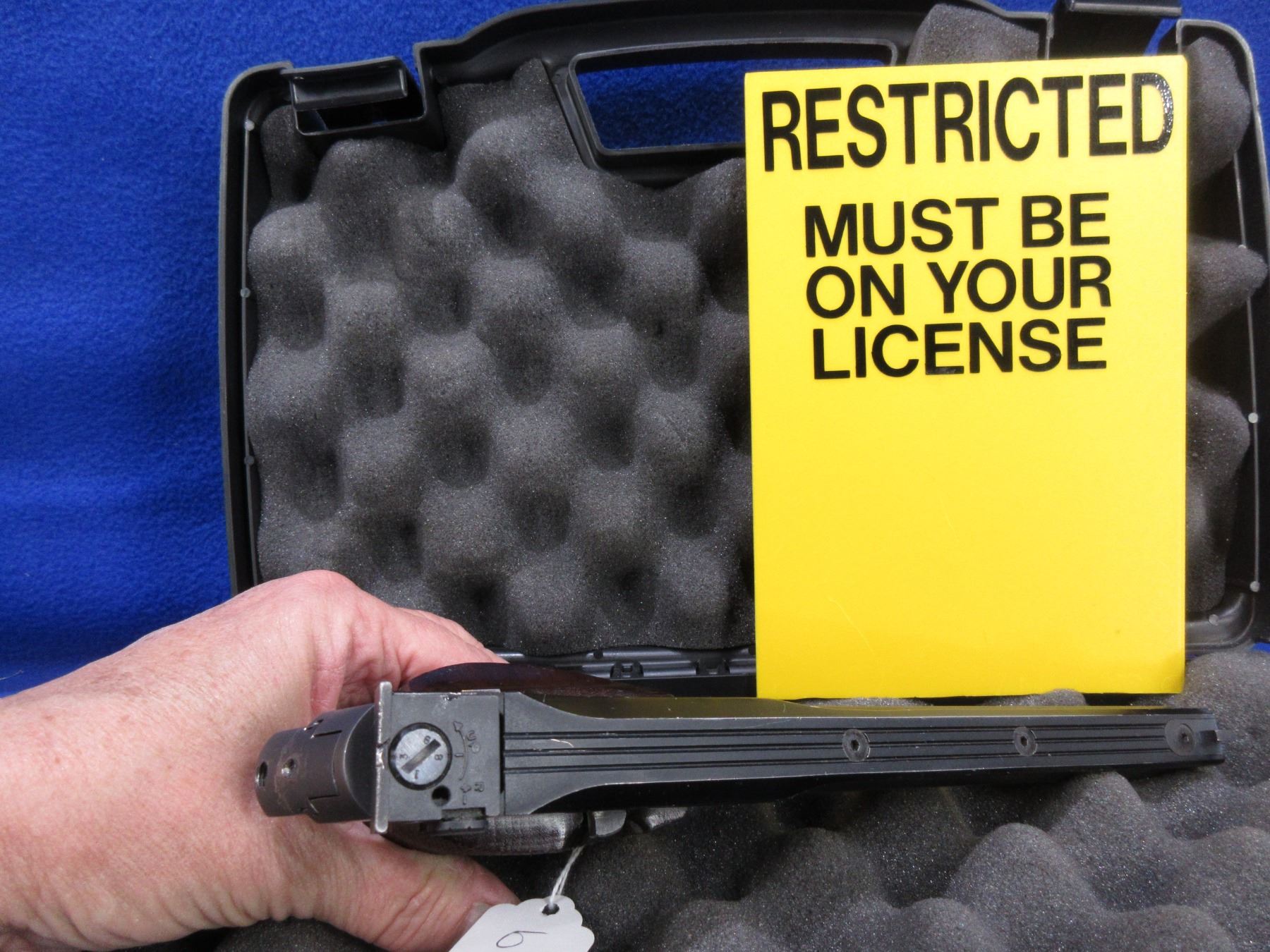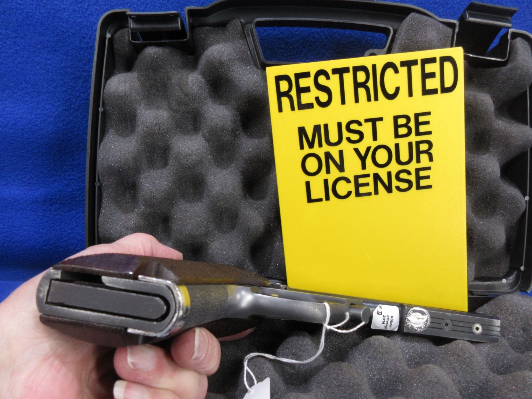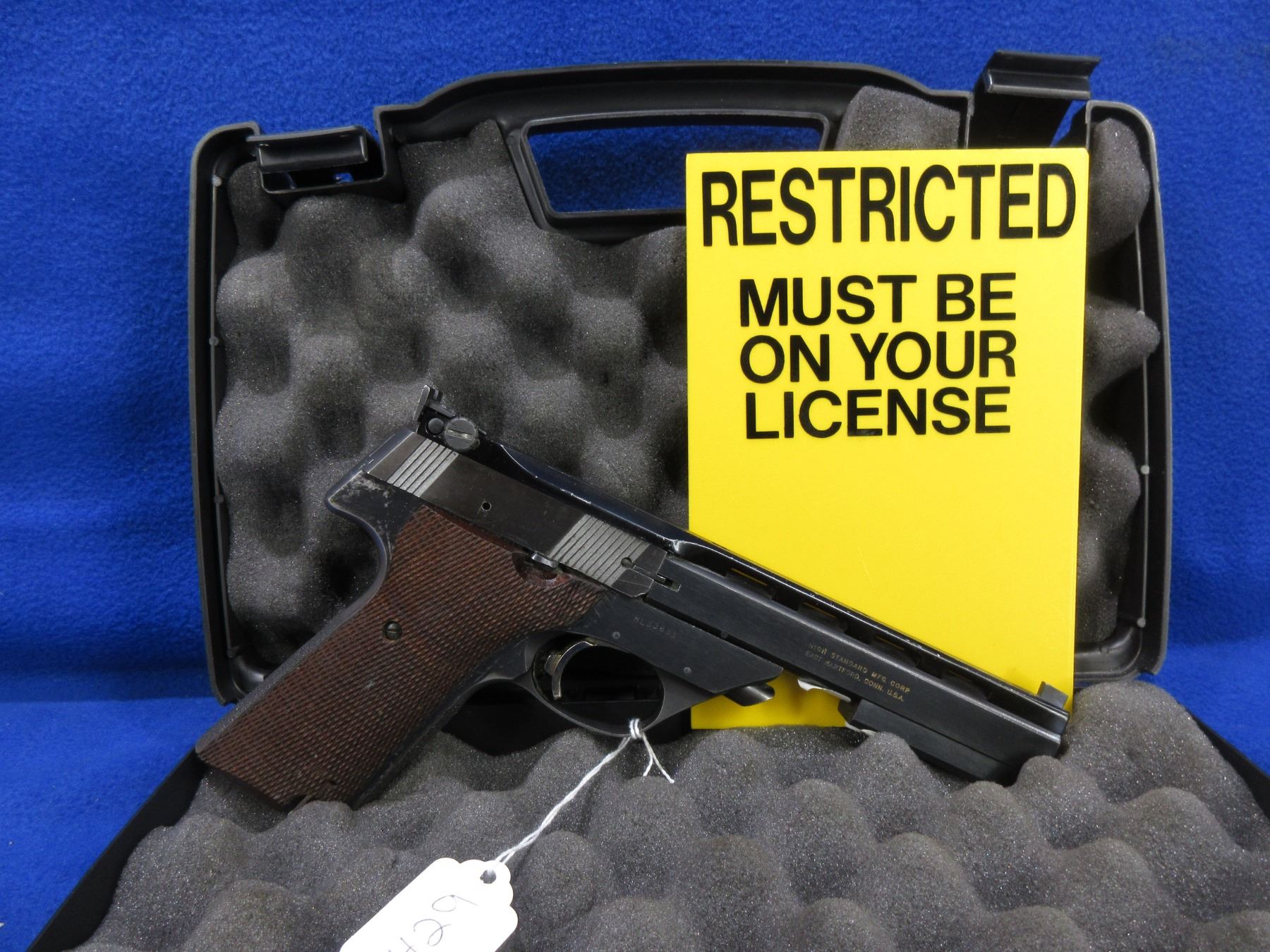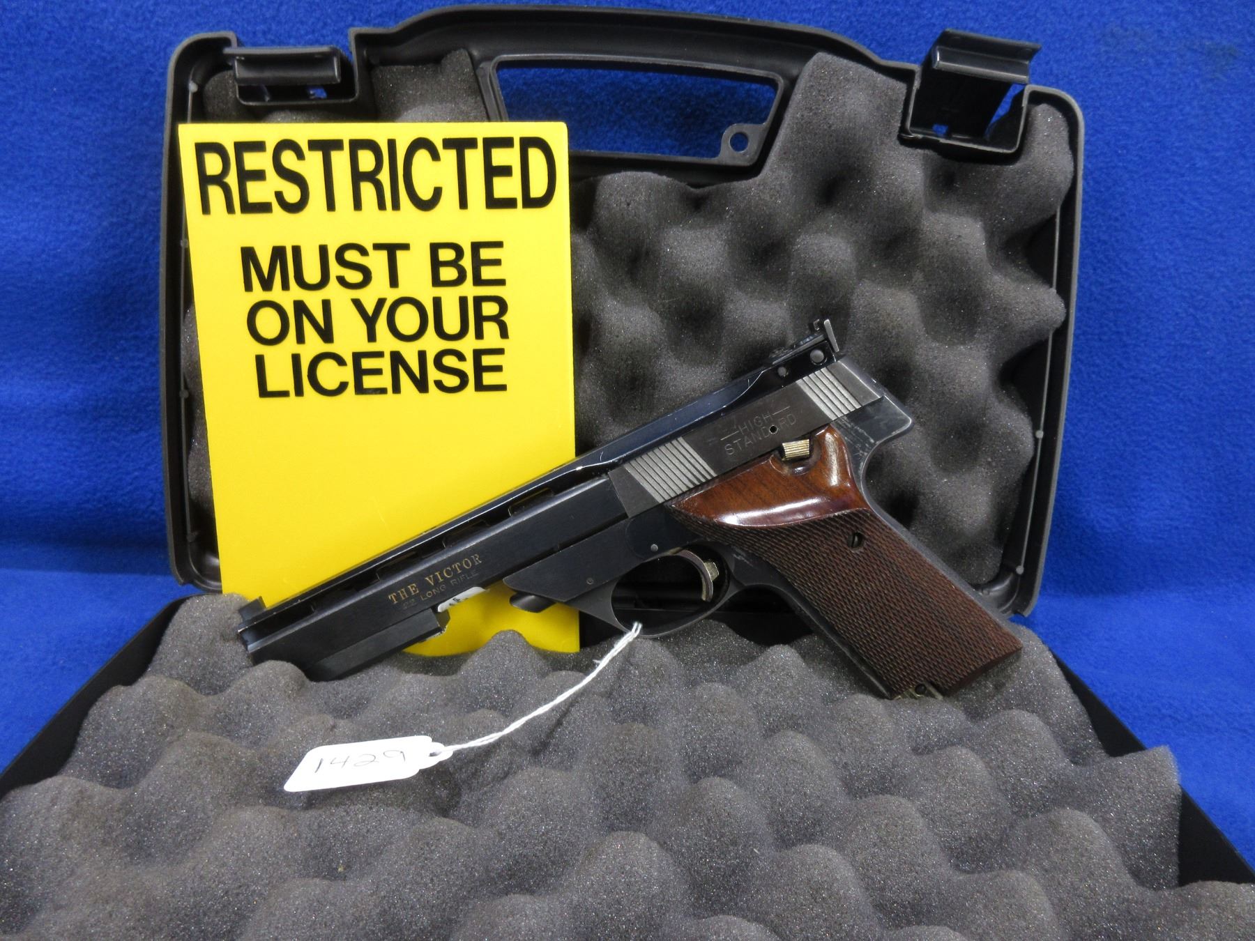 Restricted - High Standard The Victor in 22 LR - This semi-auto pistol with magazine appears to be in good working order as action is stiff (may need cleaning). Barrel is 140MM, rifling good to very good, bluing good with usage marks, fixed front sight, adjustable rear sight, wood grips are good to very good, comes with a case. Ser # ML33831