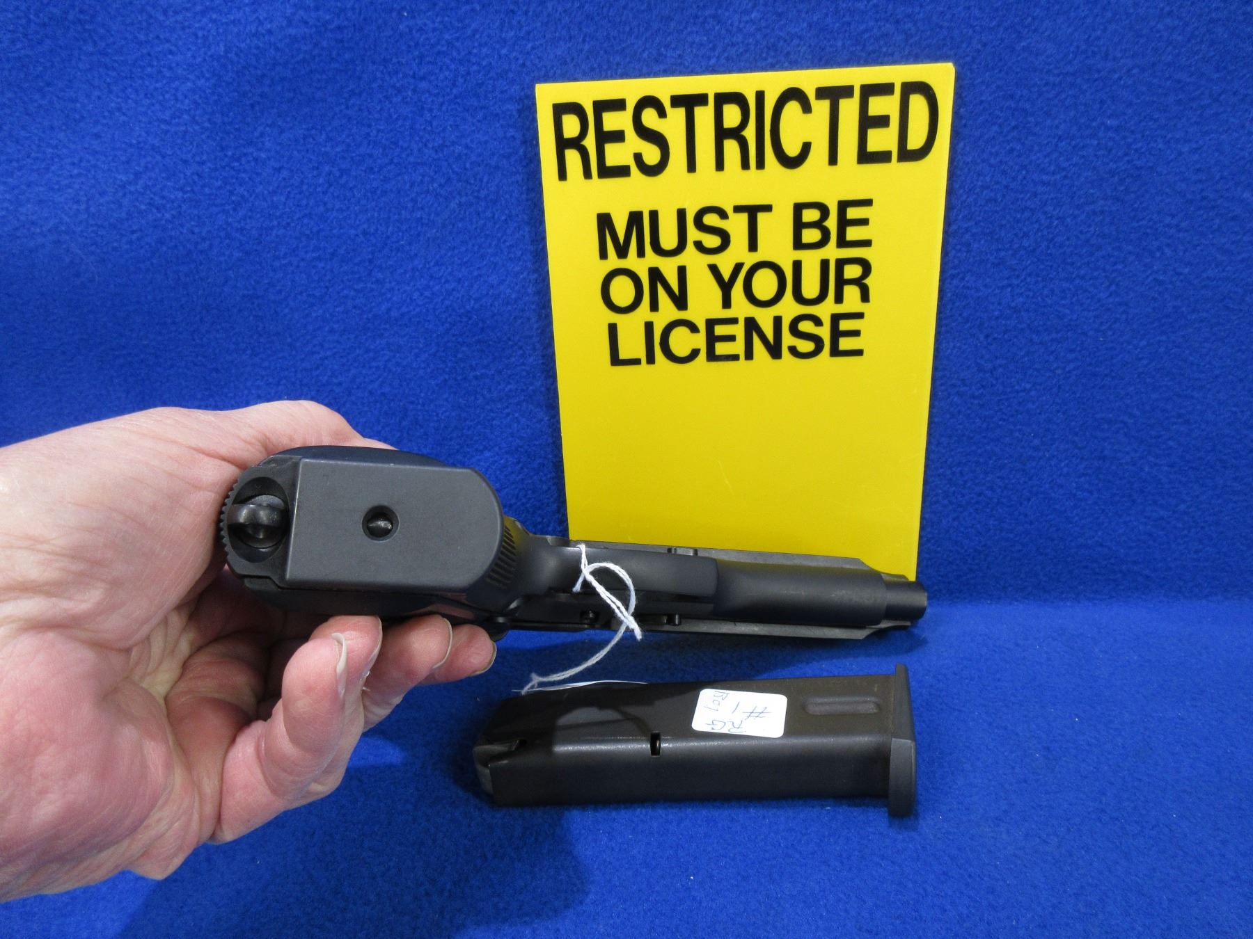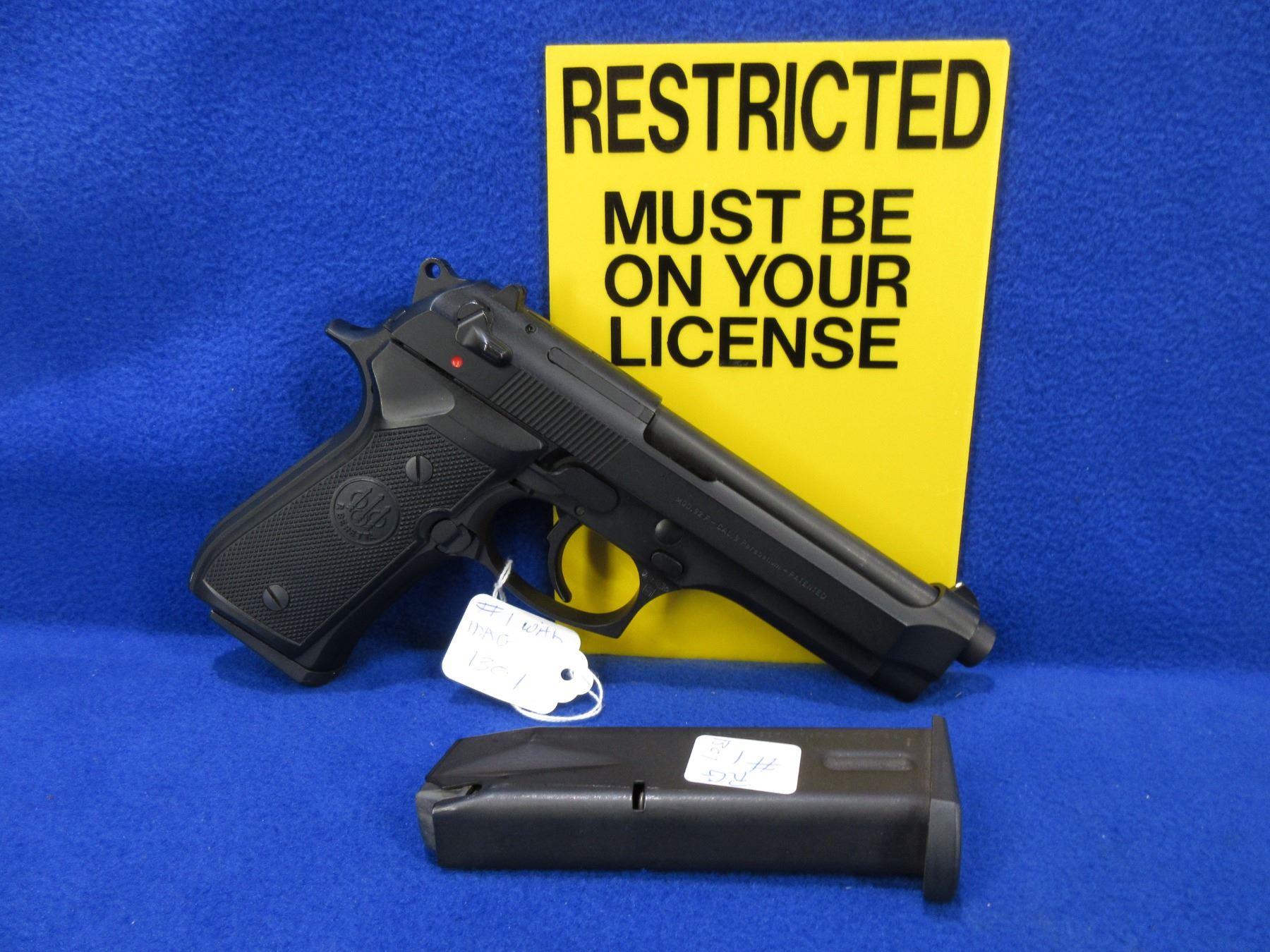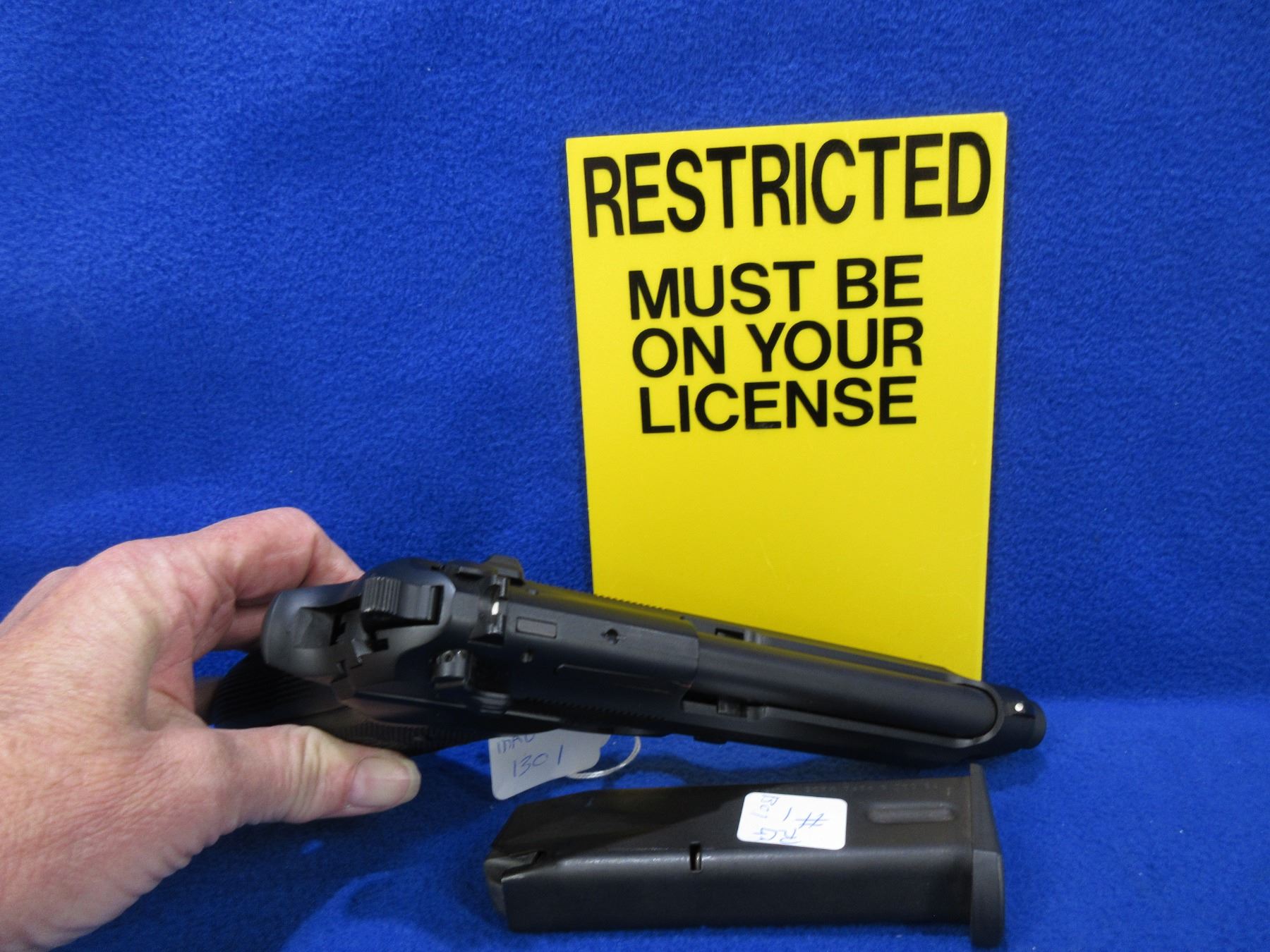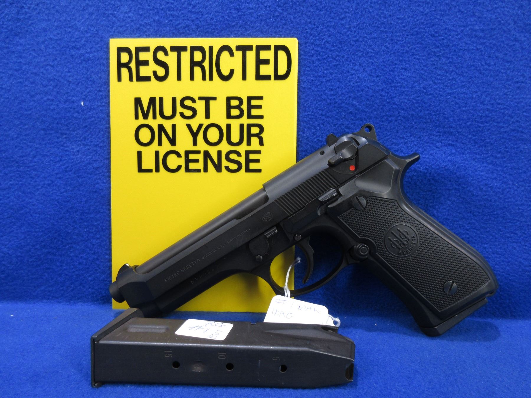 Restricted - P. Beretta Model 92F in 9MM - Made in Italy - This semi-auto pistol with 2 magazines appears to be in very good working order, appears in like new condition. Barrel is 125MM, rifling very good, black finish very good, fixed front sight, adjustable rear sight, synthetic grips are very good, comes with original case. Ser # D58234Z
