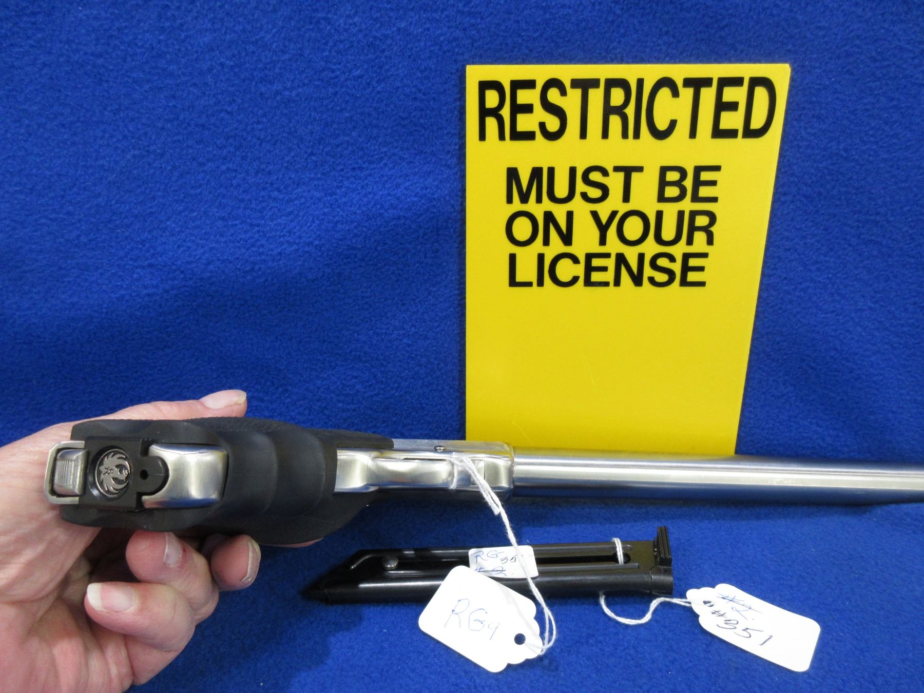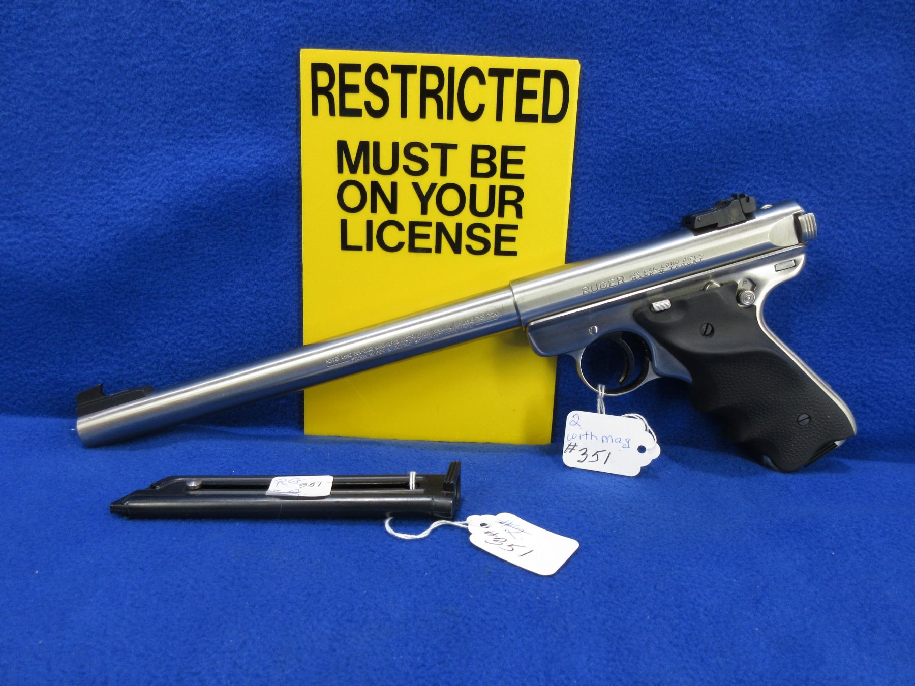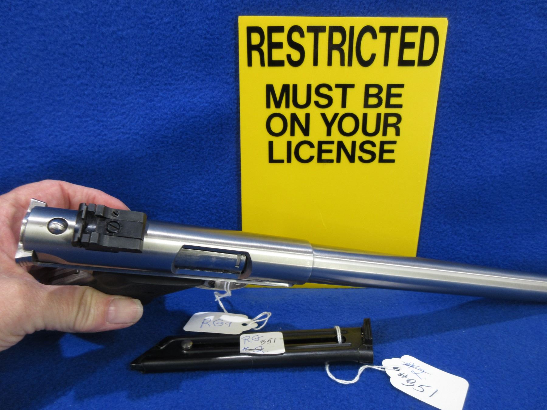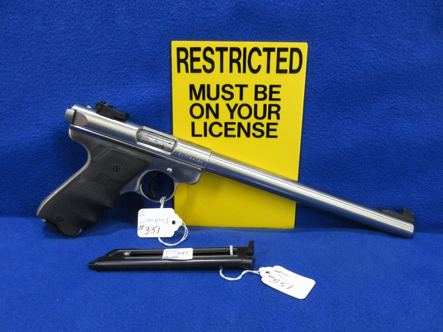 Restricted - Ruger Mark II Target in 22 LR - This semi-auto pistol with 2 magazines appears to be in good to very good working order, appears in like new condition. Bull barrel is 254MM, rifling very good, stainless finish very good, fixed front sight, adjustable rear sight, synthetic rubber grips are very good, comes with original grips. Ser # 21754060