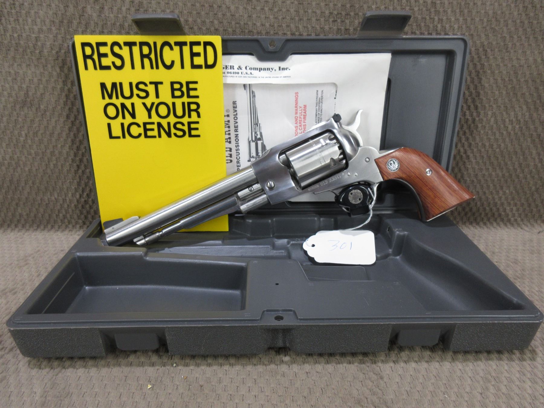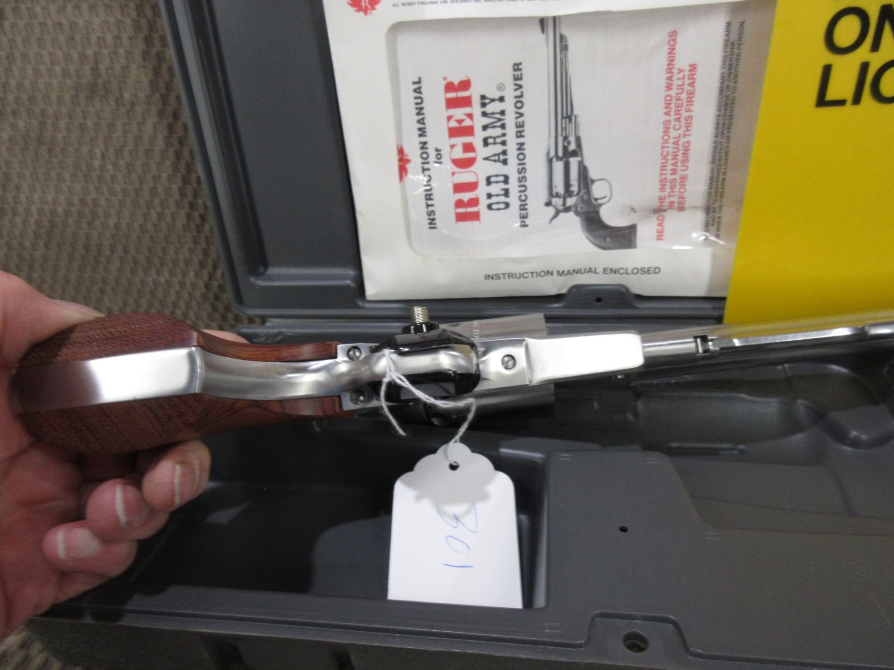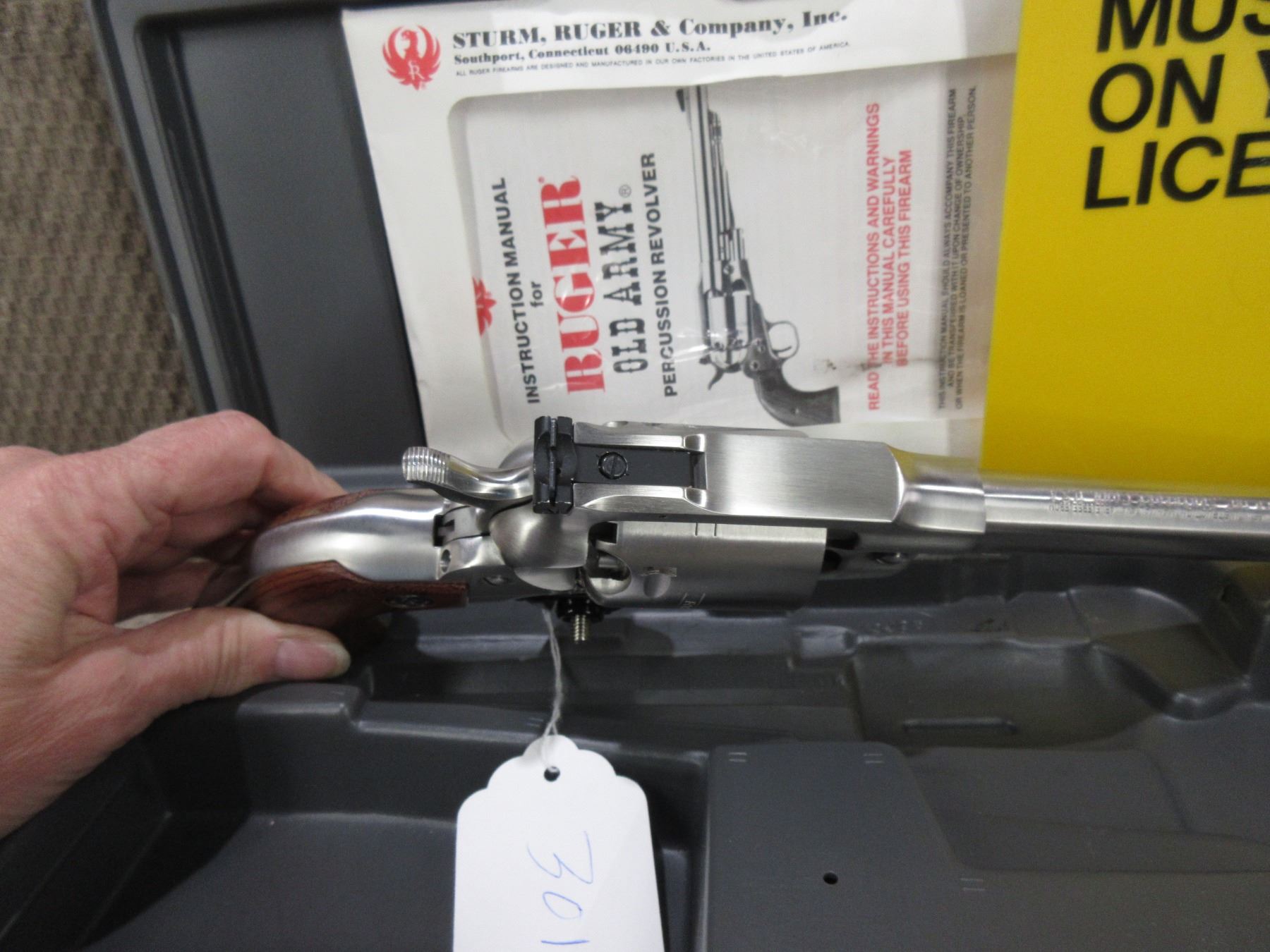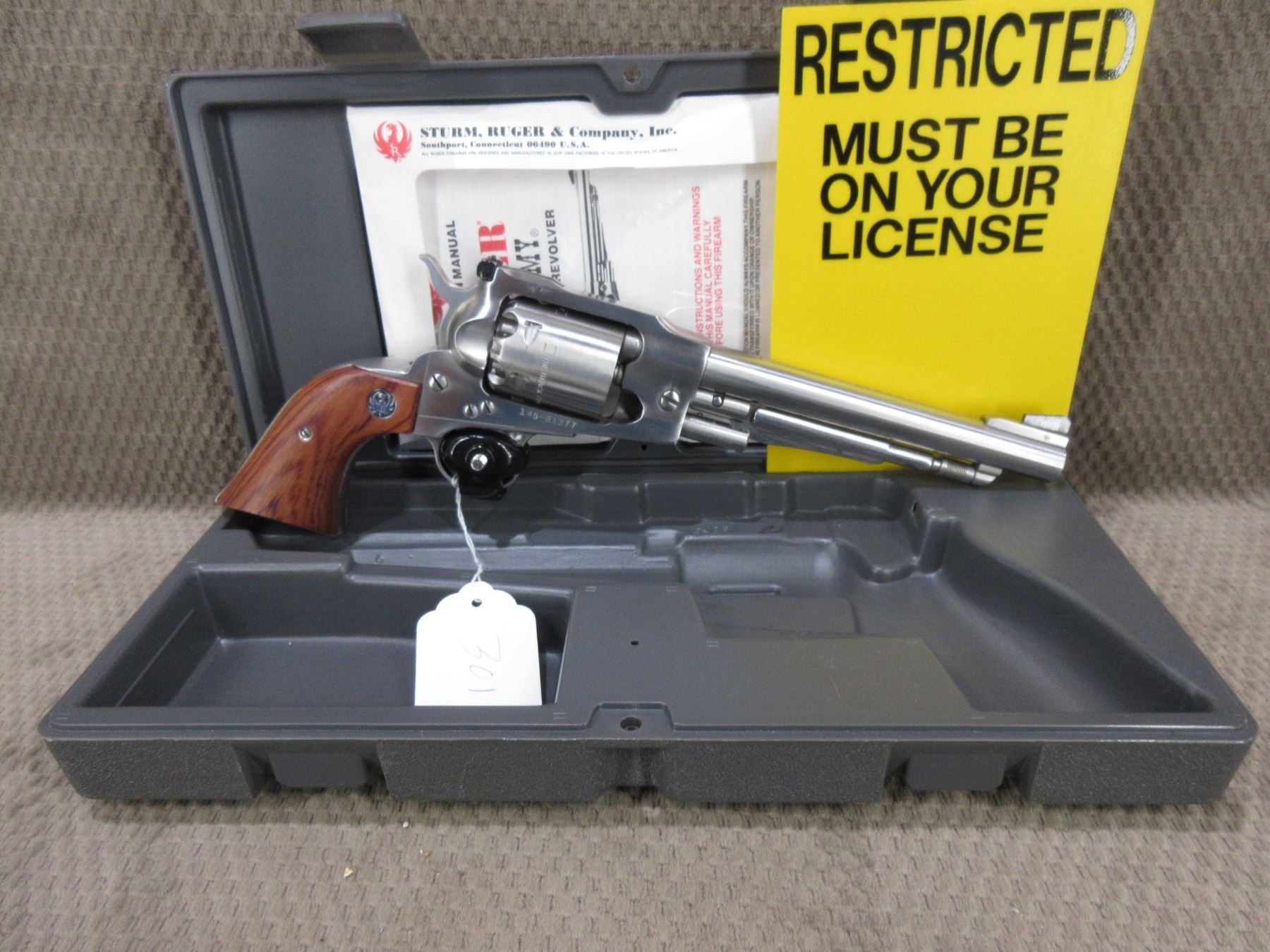 Restricted - Ruger Model Old Army in .44 Cal. Cap & Ball - This 6 shot revolver appears to be in new unfired condition. Barrel is 191MM, stainless finish, has fixed front sight, adjustable rear sight, wood grips, comes with case, Ser # 145-81377
