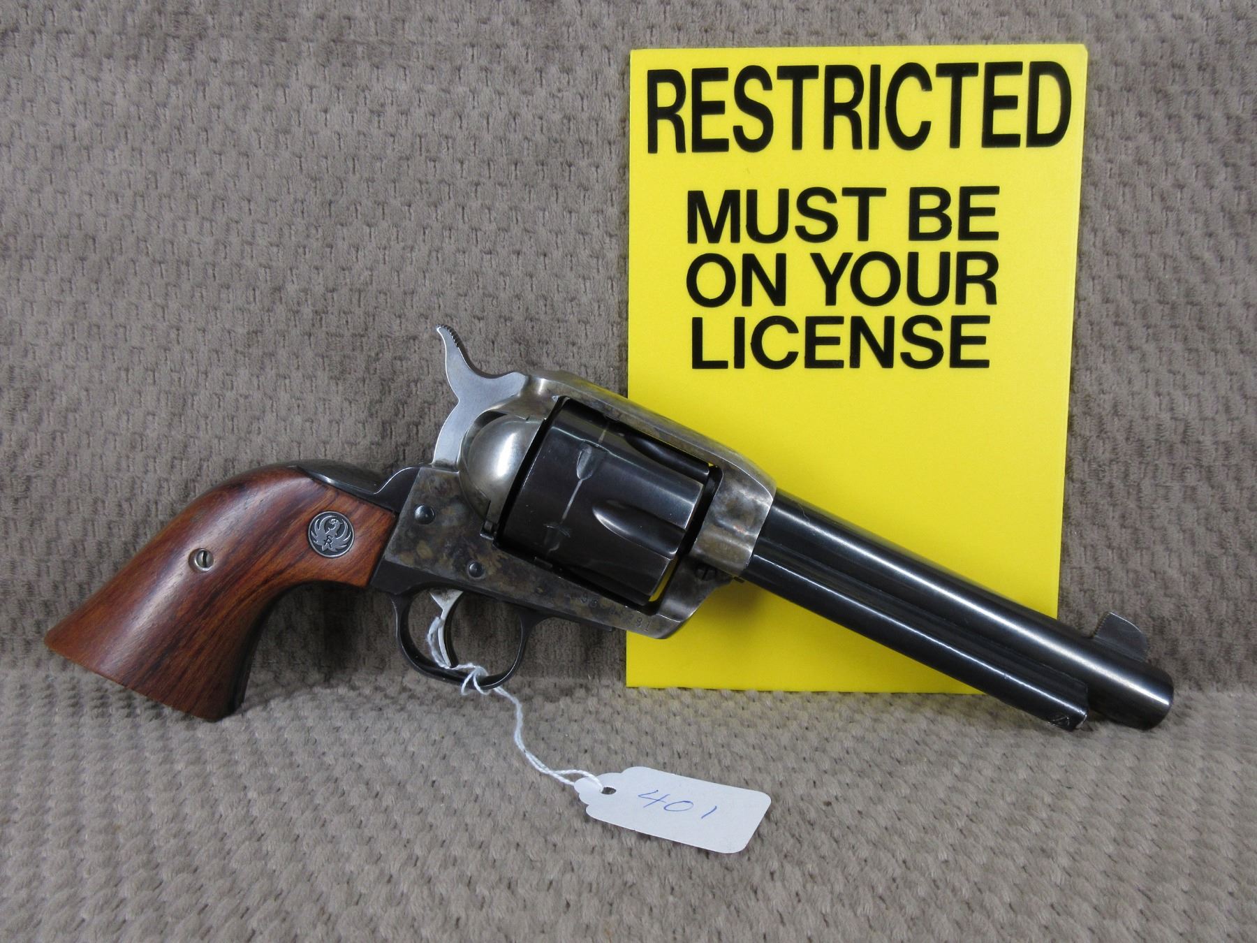 Restricted - Ruger Old Vaquero in 45 Long Colt - This single action, 6 shot revolver appears to be in very good working condition and has been tuned for cowboy action. Barrel is 140MM, rifling very good, bluing & case hardening is good to very good with some small handling marks, has fixed sights, wood grips are good to very good, Ser # 56-05281