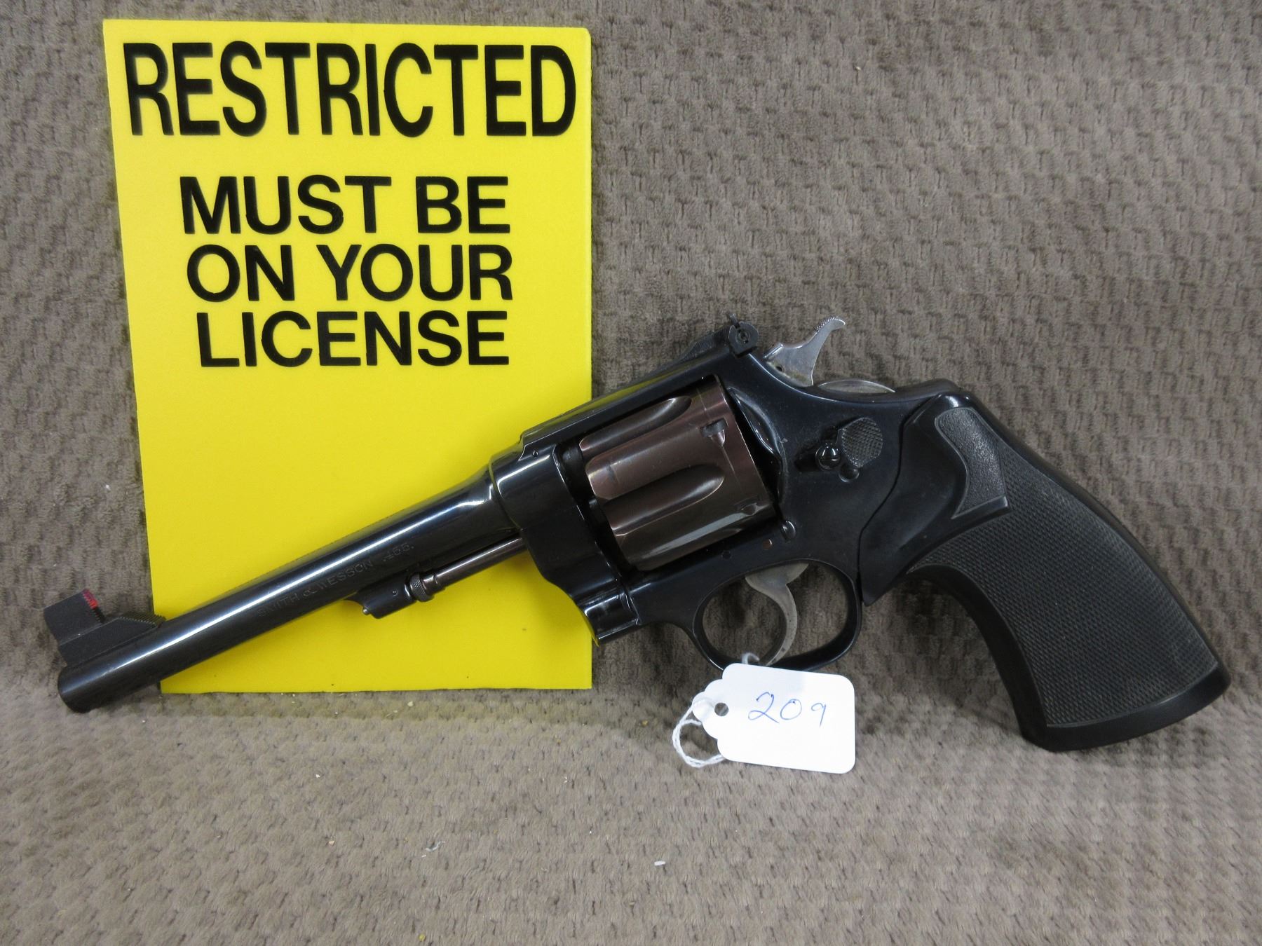 Restricted - Smith & Wesson 455, Hand Ejector, Second Model in 45 Long Colt - This double action six shot revolver appears to be in very good working order. Barrel is 165MM, gun has been reblued and cylinder was browned and both are excellent, rifling is very good, has target sights added, grips are Presentation Grip by Pachmayer. Serial # 47744