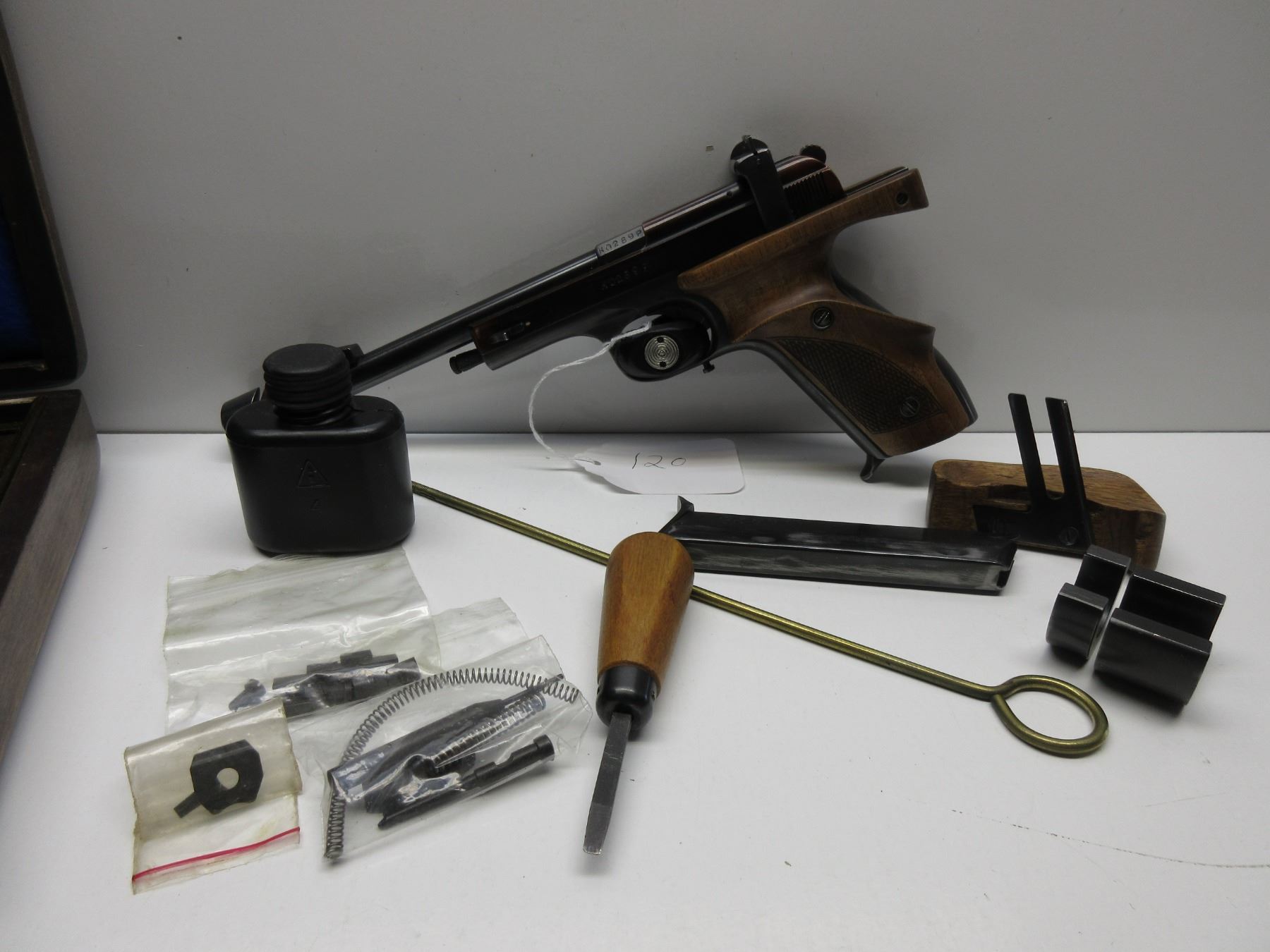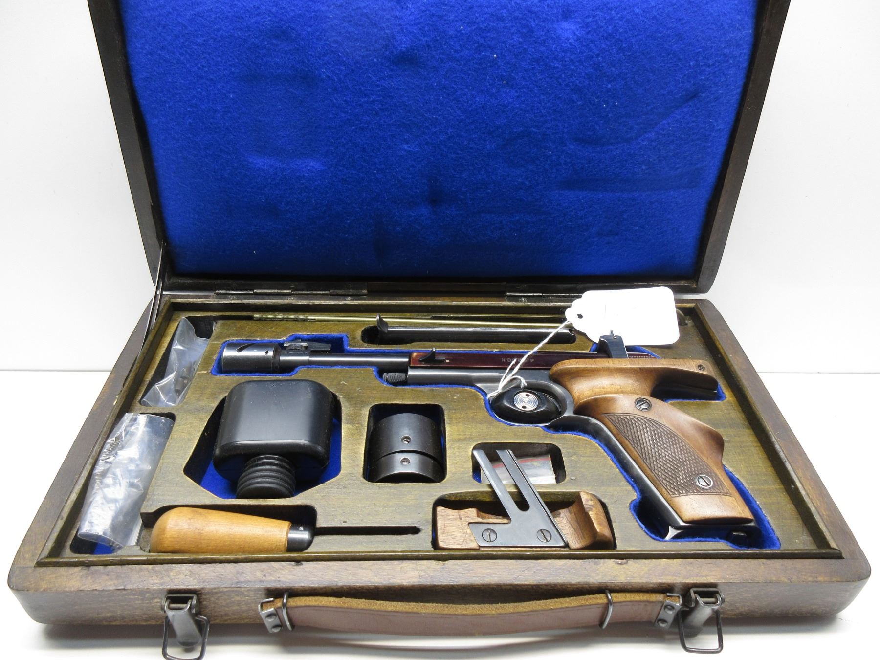Restricted - Vostock Model Margolin in 22 Short. This semi-auto target pistol comes with case, extra magazine, barrel weights, various parts, cleaning rod, oil container, screw driver and palm grip. Gun is in good to very good condition