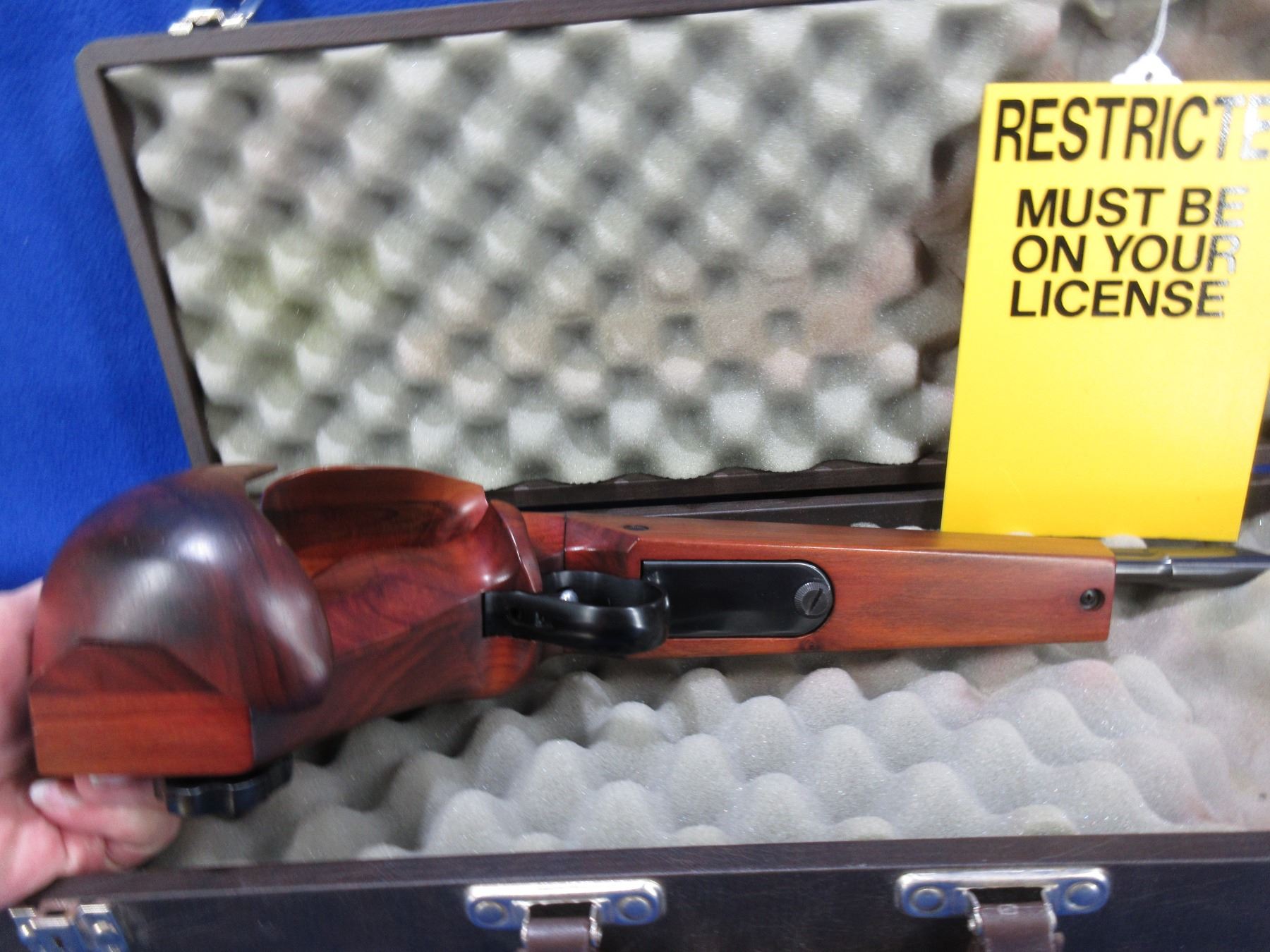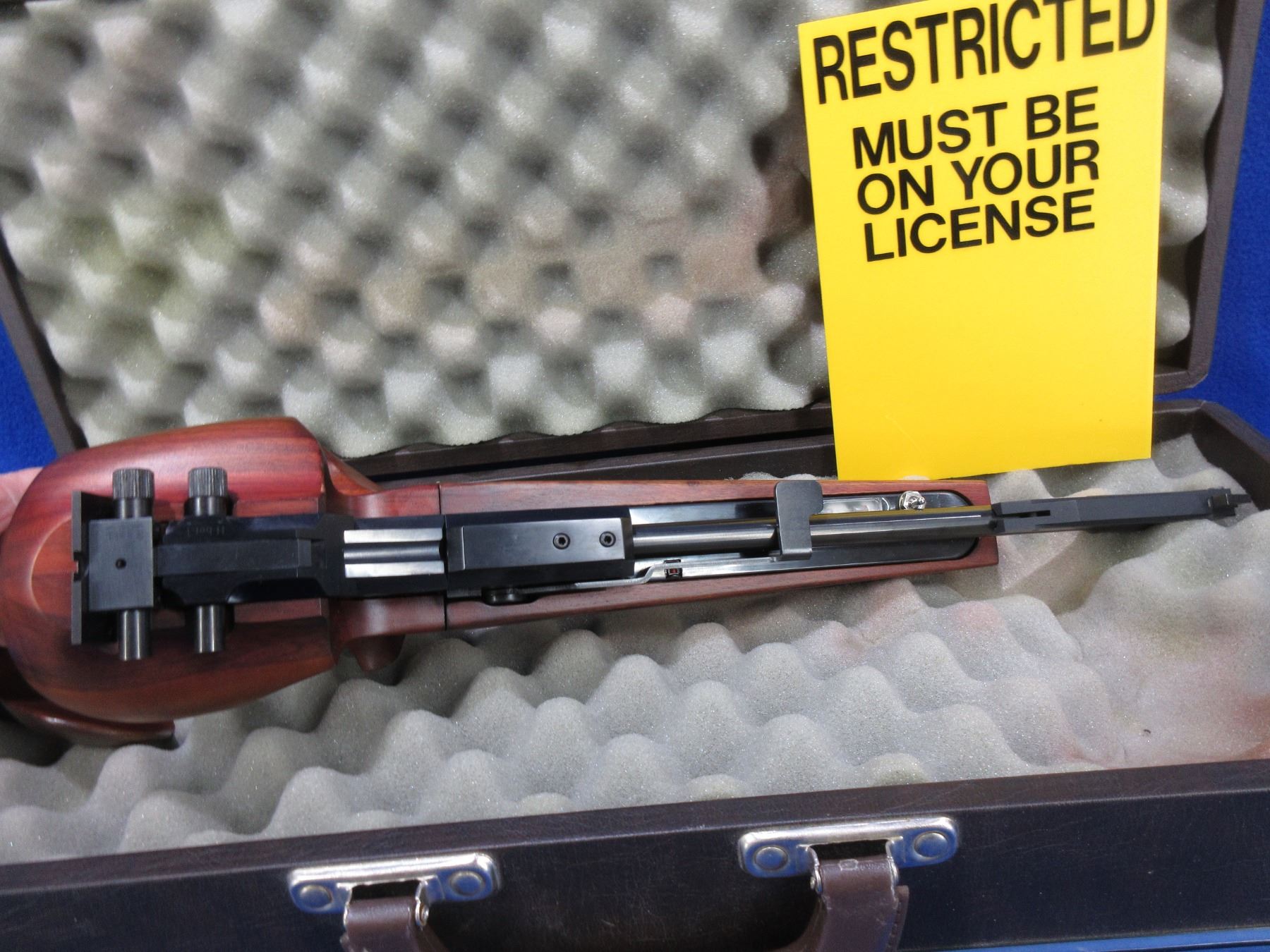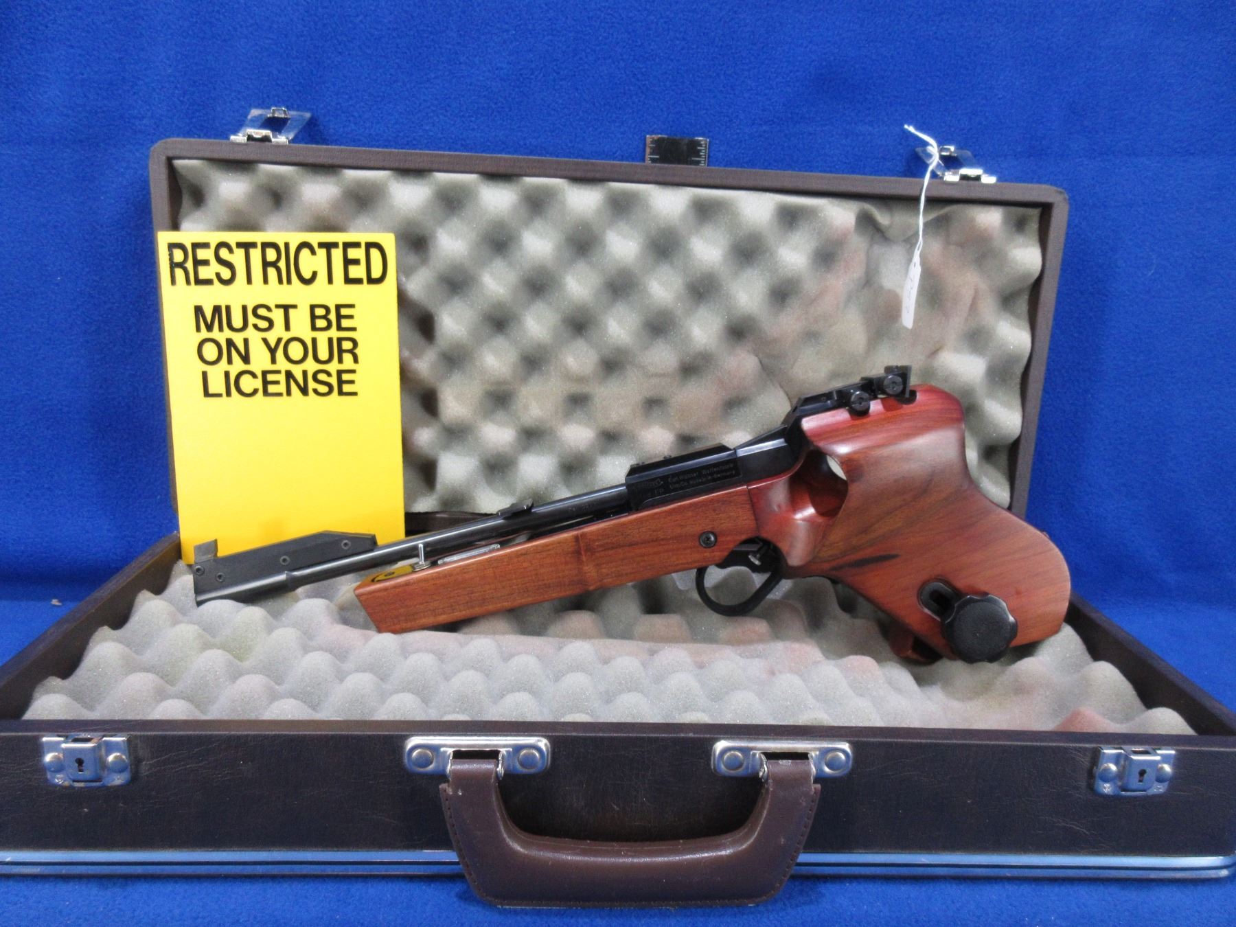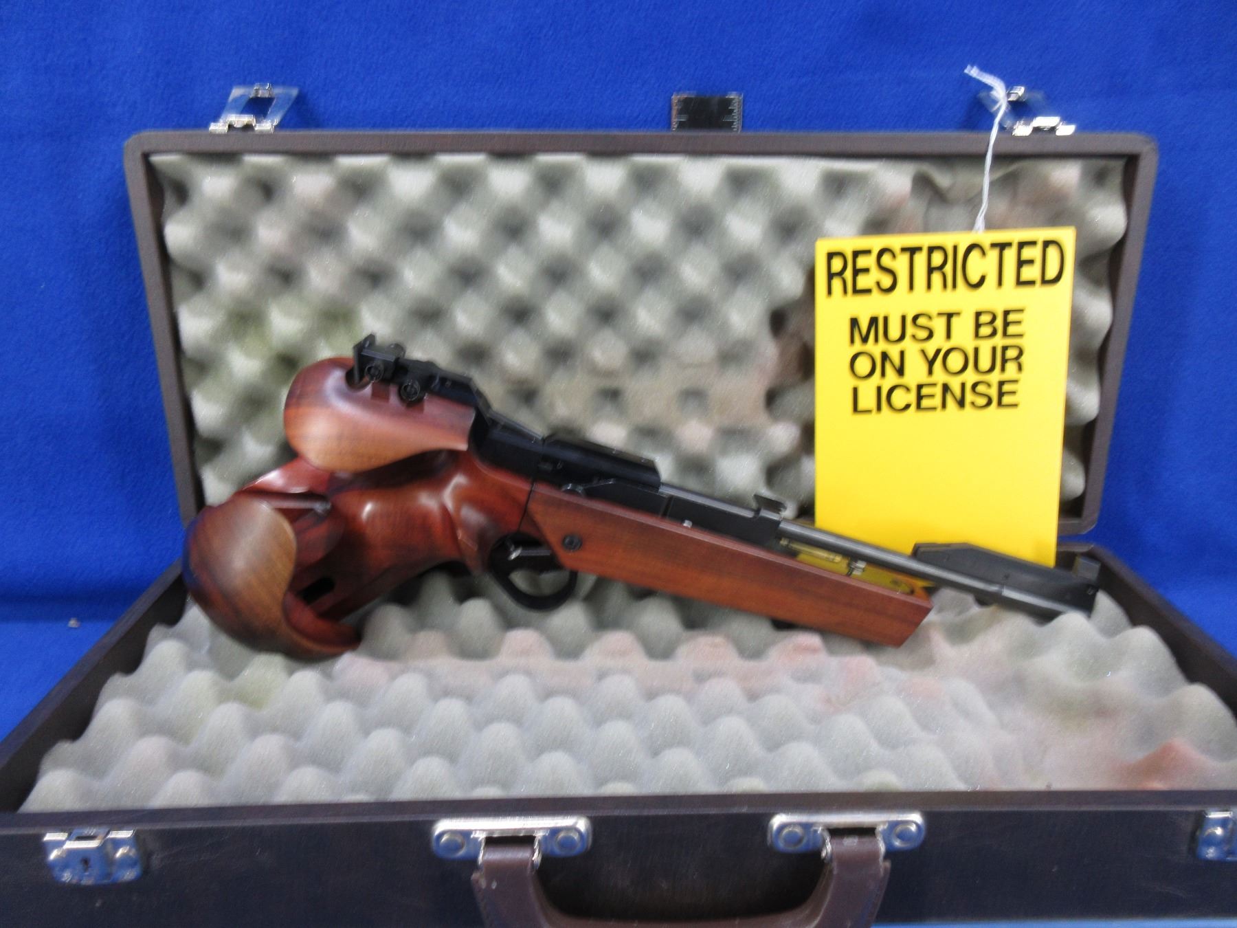 Restricted - Walther Model FP in 22 LR - This breach load single shot pistol with electronic trigger appears to be in NEW condition. Barrel is 297MM, has front sight, adjustable rear sight, adjustable wood grips, comes with original case, Ser # 1424