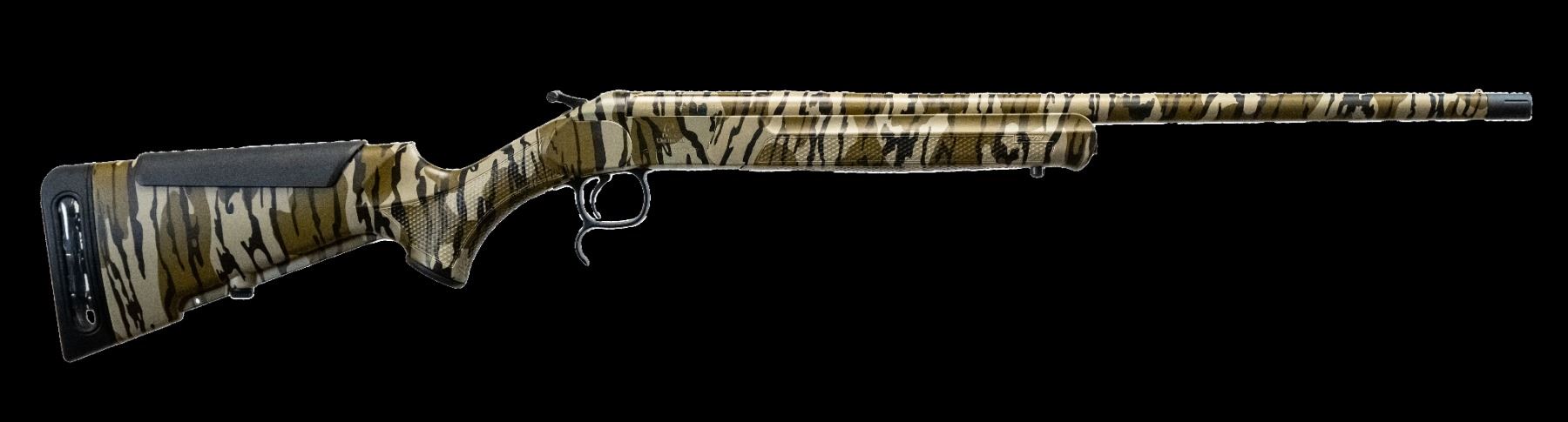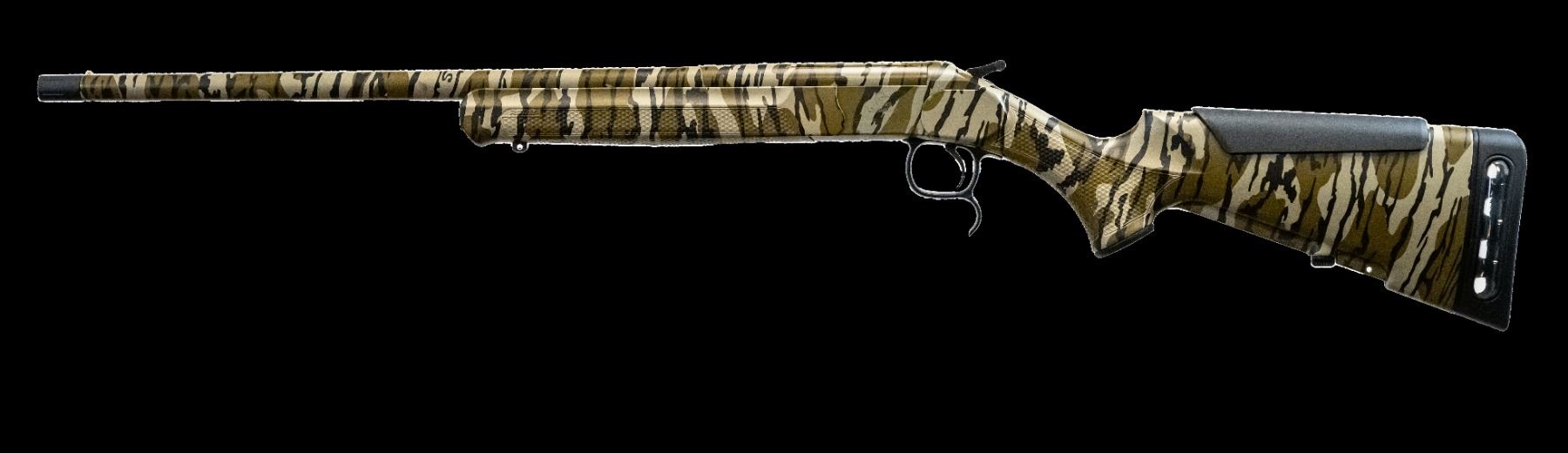 This single-shot .410 gauge shotgun features the Mossy Oak Bottomland camo pattern for a classic outdoor look. It includes a 3” chamber, AIRY Recoil Reduction Pad System for added comfort, a brass front bead for aiming, and a modified choke for versatile performance.