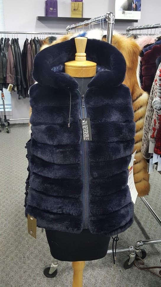 Feel luxurious in a rex rabbit reversible fur lined down vest. This hooded navy vest is available in sizes small through large. Wear it with a cocktail dress for a night out or pair it with jeans for a more casual look. This vest is extremely versatile and will make you feel glamourous. Thank you to Ron Cohle for this repeat 100% donation. www.muscalusfurs.com