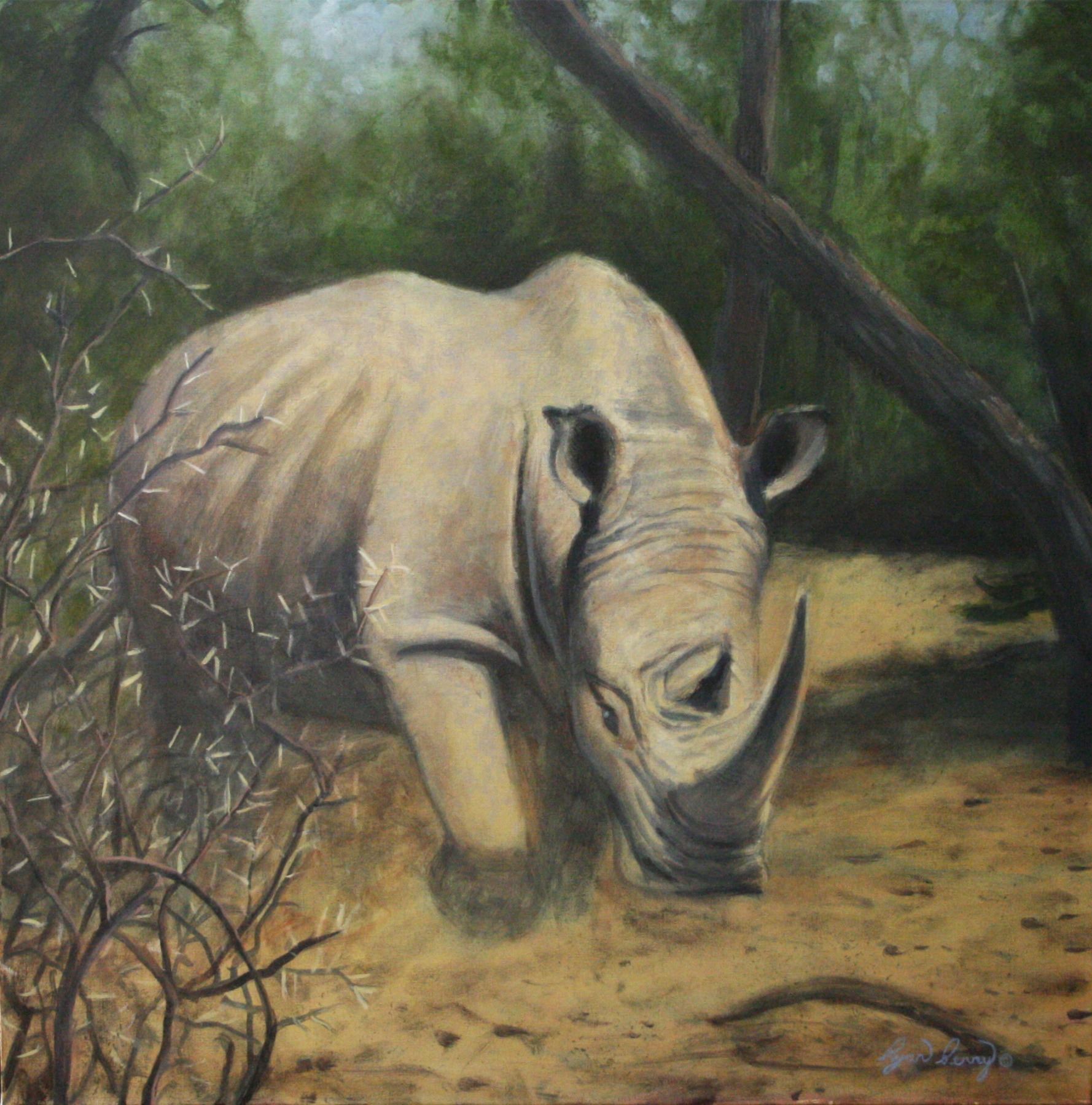 Rhino Charging 30X30 Original Oil on Canvas, edges are painted, 2021. By Ryan Perry. We thank Ryan for his donation!