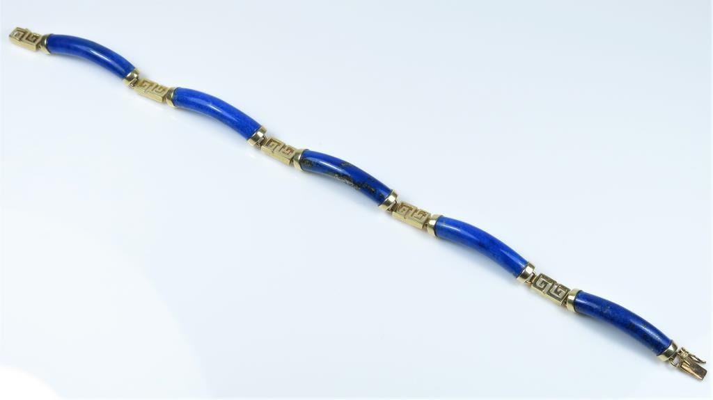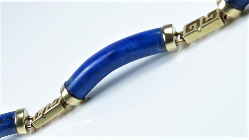 featuring 5 carved pieces of Lapis accented with 4 Greek Key design links crafted in 14 karat yellow gold.