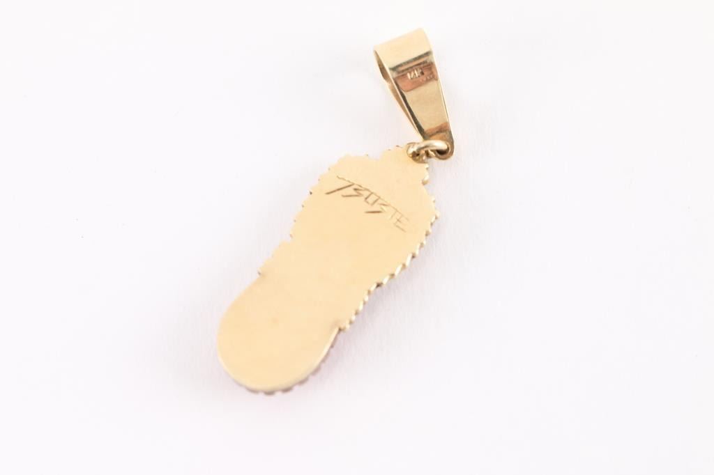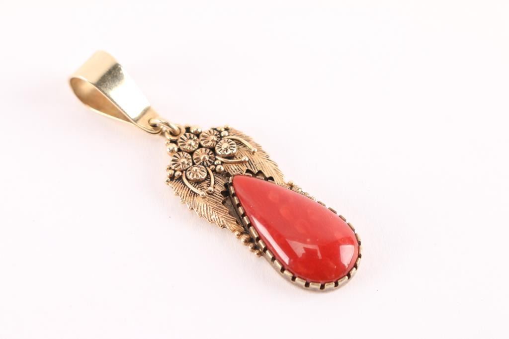 Arizona Navajo artist made by Richard Tsosie signed on back with tear drop shaped coral stone set in 14kt yellow gold with foral motif./ Retail 3200.00