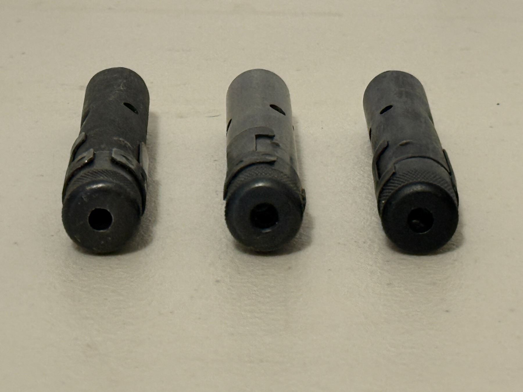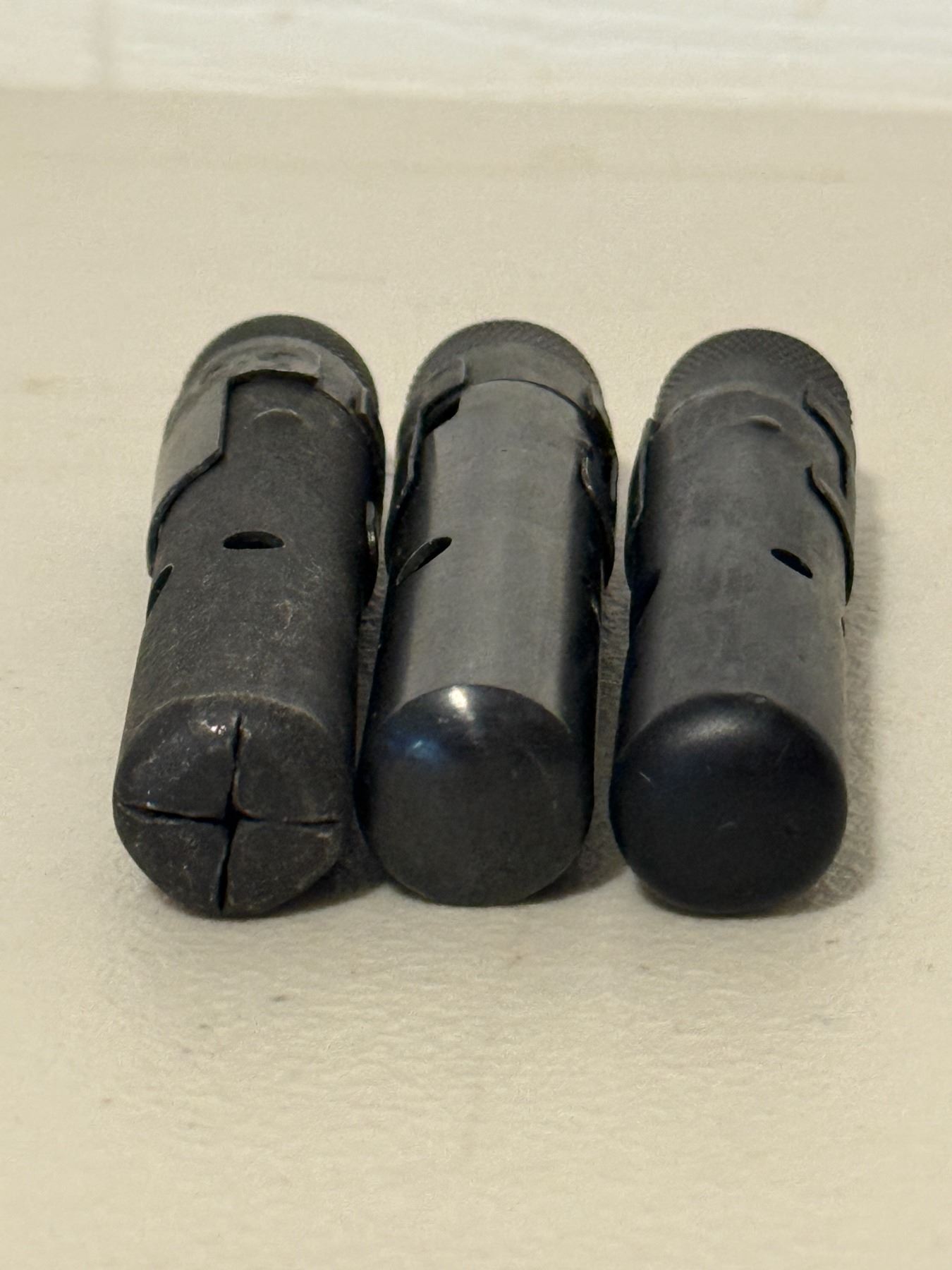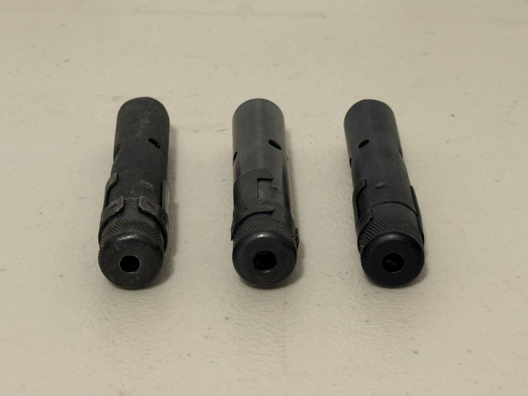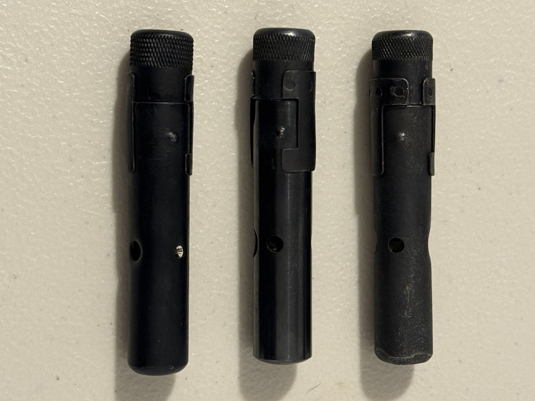 Lot of three rifle bolt assemblies or bolt-related components. Mixed condition with visible wear. Exact firearm models unknown. As pictured. Sold as-is.