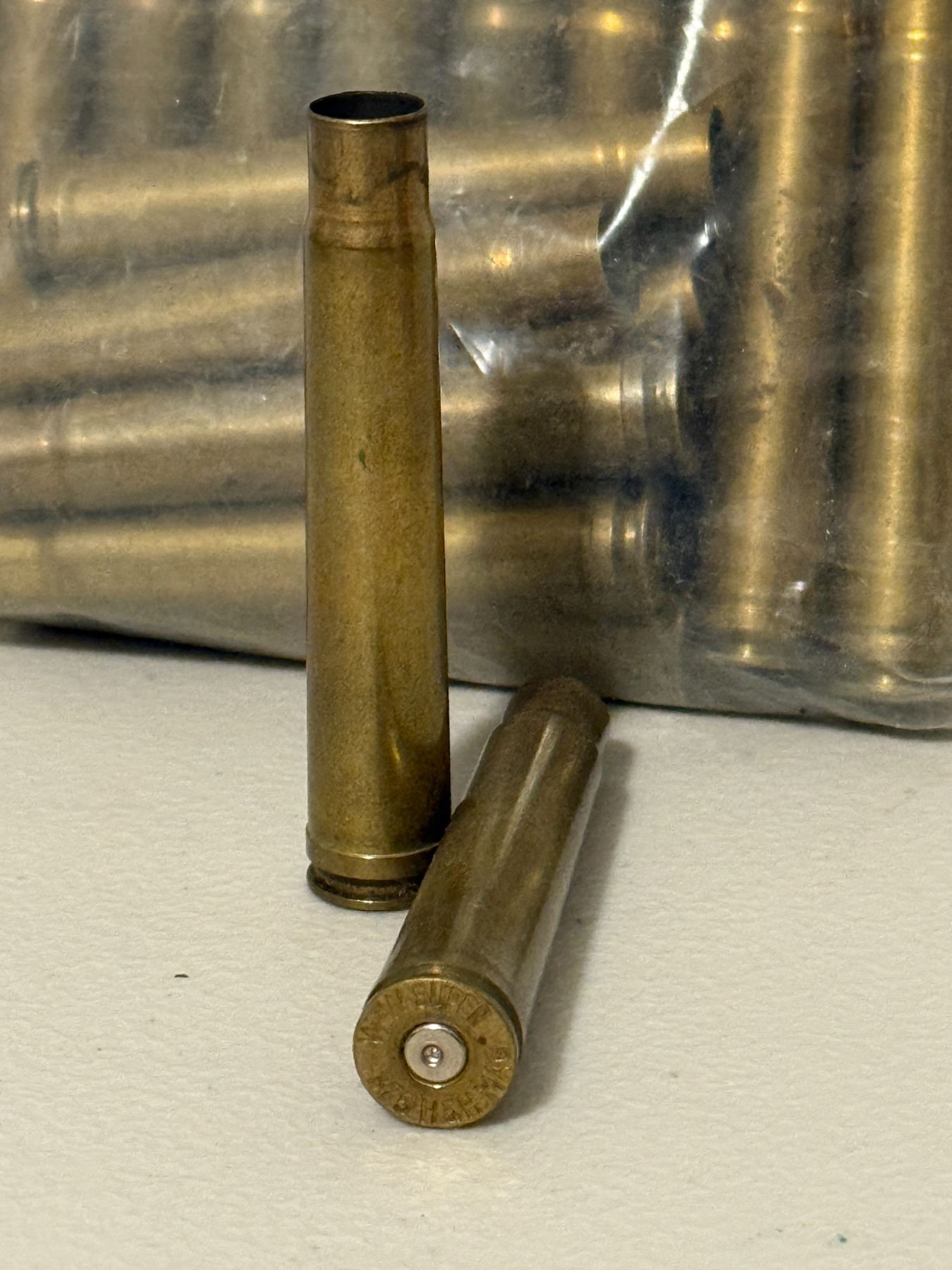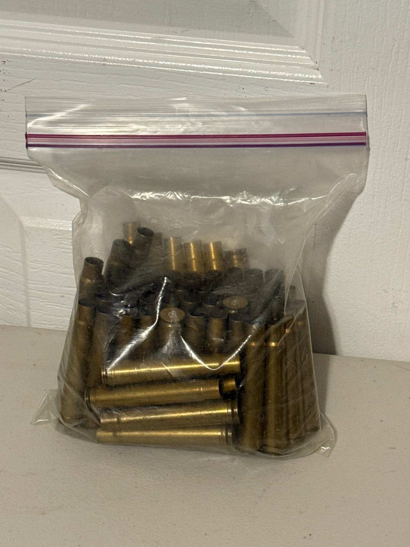 Bagged lot of fired rifle brass casings. Mixed headstamps and conditions. Previously fired, unprocessed. Suitable for reloading or brass scrap. Quantity as shown (Approx. 56 fired rifle brass casings estimate). Sold as-is.
