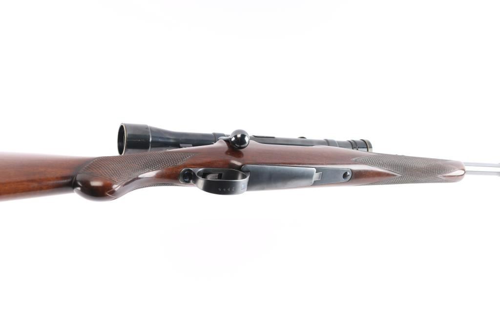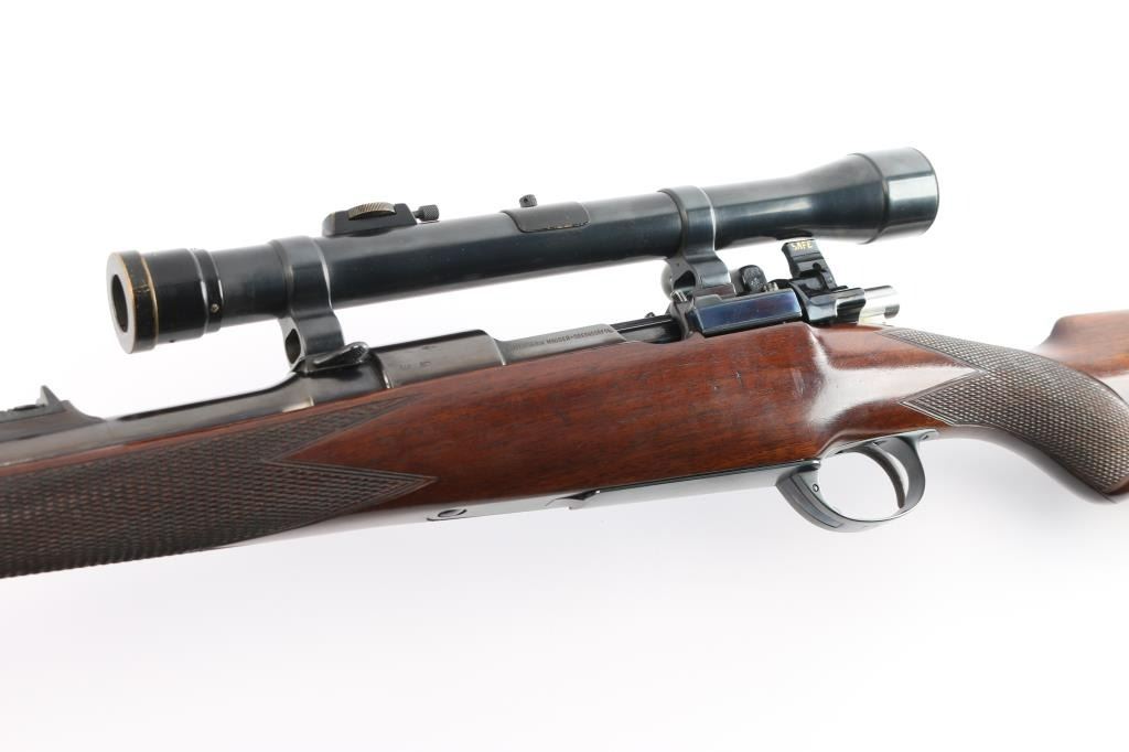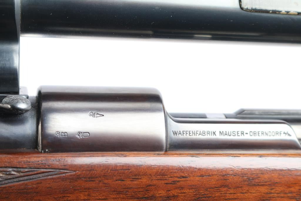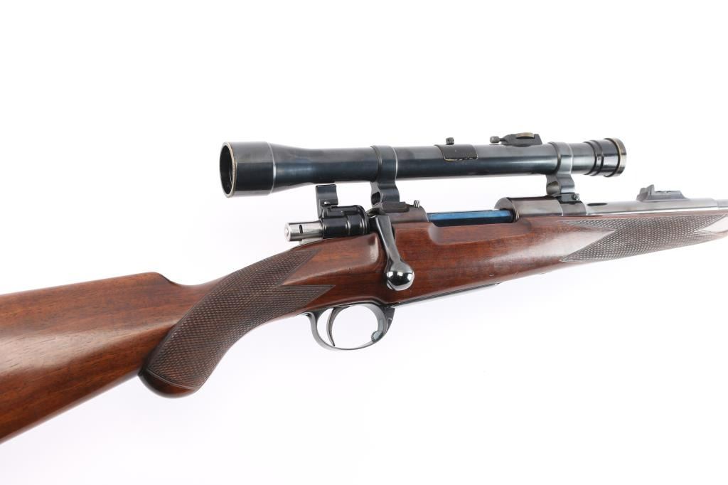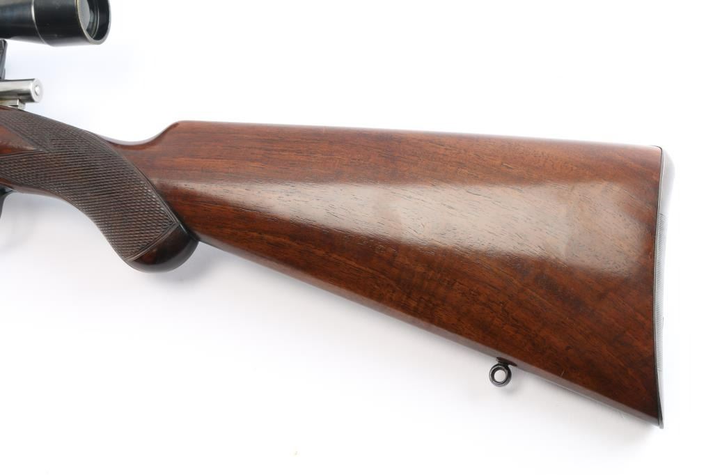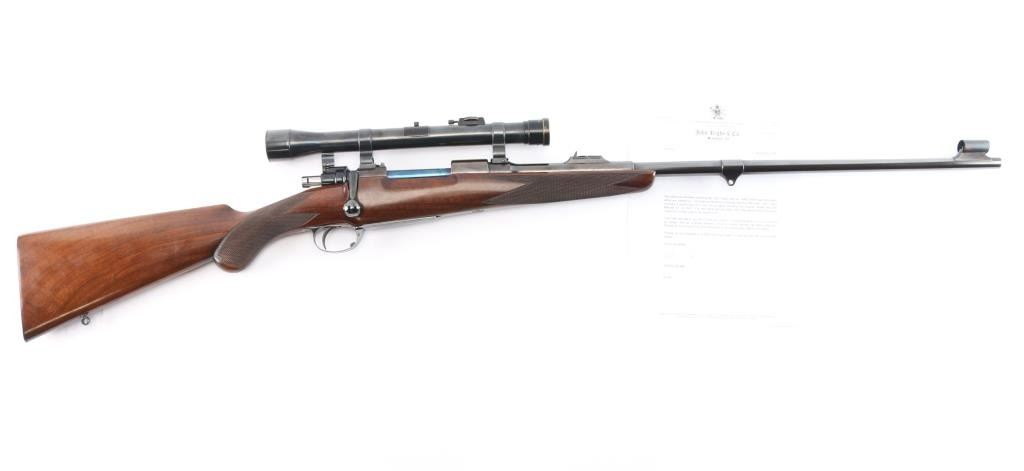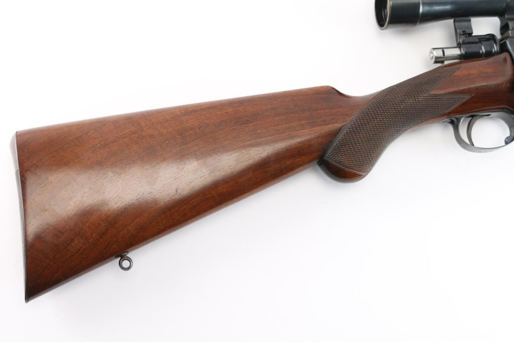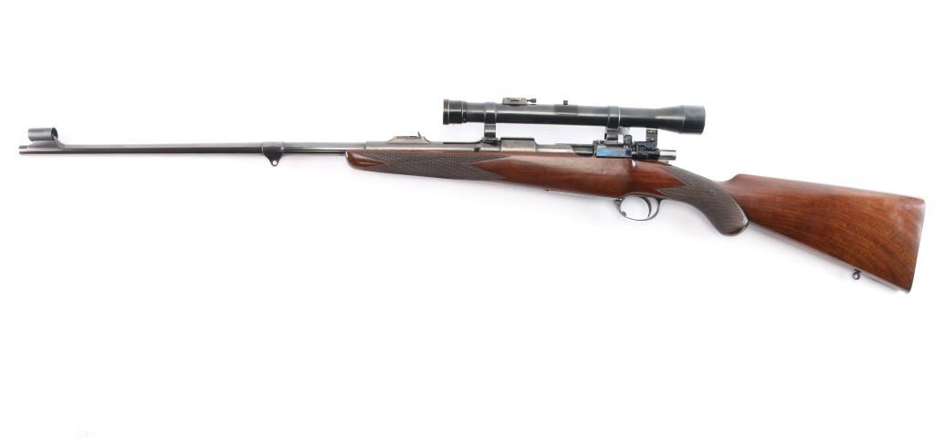 Configuration: Blued finish, 25" round tapered barrel with sleeved-on island rear sight base with fixed 150yd leaf & folding 350yd leaf, soldered-on raised front sight base with hooded barley corn sight, sleeved-on sling eye, Aldis Brother fixed power scope mounted with Rigby style see-through claw mount rings, curved stippled trigger, three-position safety with gold inlayed "SAFE", turned down bolt handle with smooth pear shaped knob, Mauser standard length action with thumb cut & modified charge loading bridge, internal box magazine with polished follower & hinged floorplate, and point checkered fiddle figured European walnut round knob pistol grip shoulder stock with hand rubbed oil finish, installed sling eye & serrated steel buttplate.