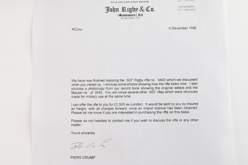 Includes several documents between Ribgy and one of the rifles former owners. Also Includes a copy of the ledger from 1915 showing the original factory details.