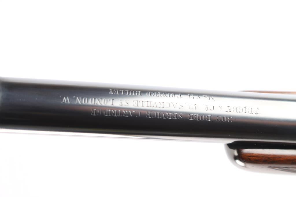 Markings: The top of the barrel is engraved ".303 BORE SERVICE CARTRIDGE / J RIGBY & CO 43, SACKVILLE St LONDON, W. / Mk VII POINTED BULLET". The top of the scope is engraved “J.RIGBY & Co. / 43 SACKVILLE St. / LONDON, W.”. & The rear scope ring & trigger bow are both marked “4442”.