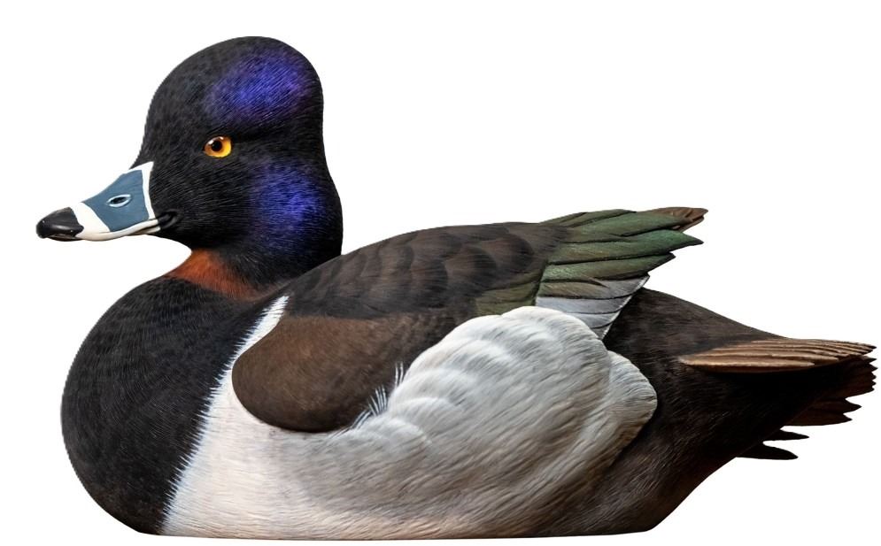 The Ringneck Decoy of the Year is a finely crafted cast resin collectible, designed in exacting detail by renowned carver Jude Brunet. Measuring 16” x 8” x 8”, this stunning piece showcases the artistry and precision that has earned Jude his third Decoy of the Year in the Ducks Unlimited national package. Each decoy features a Ducks Unlimited cloisonné medallion inlaid into the felt-covered bottom, signifying authenticity and adding to its collectible value. This distinguished ringneck decoy is both a tribute to waterfowling heritage and a striking display piece for any collection.