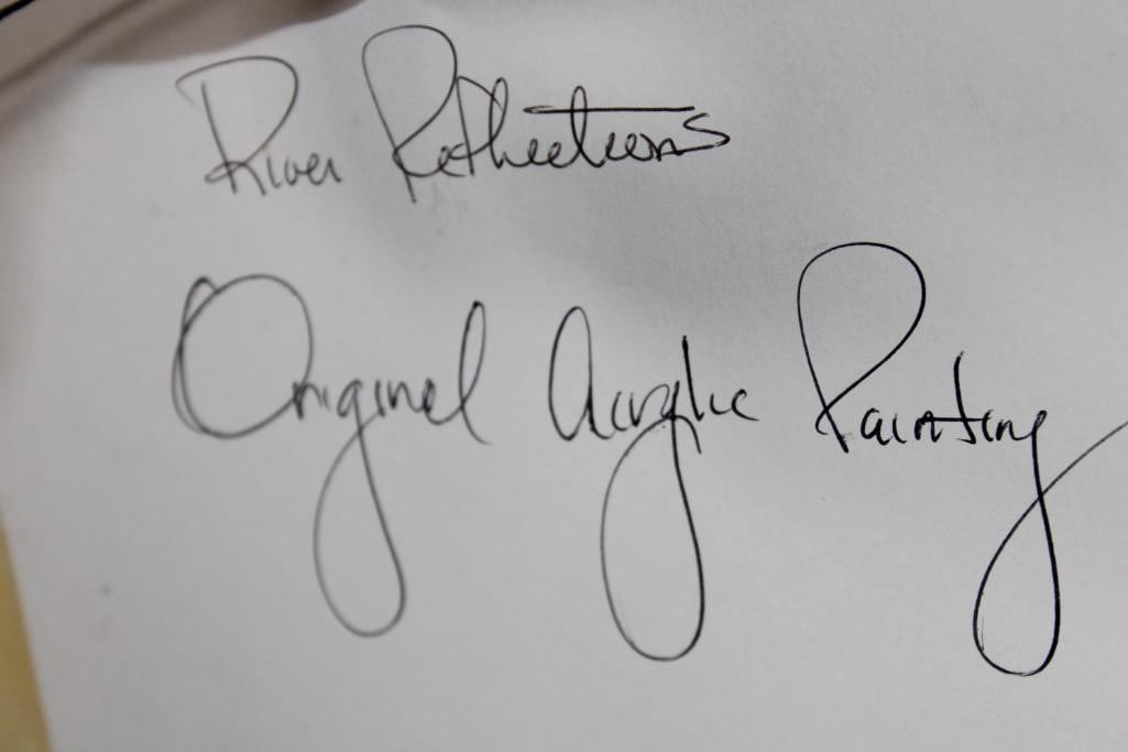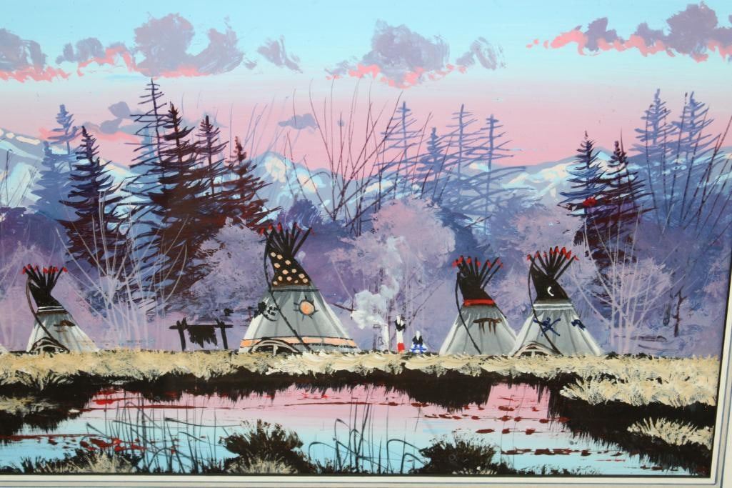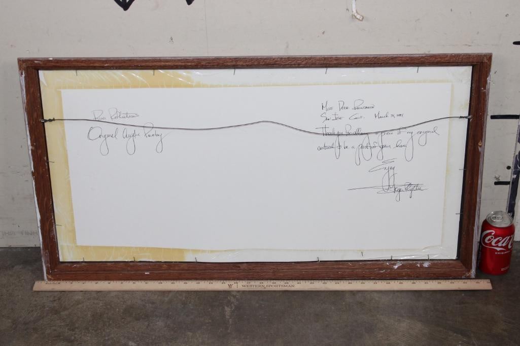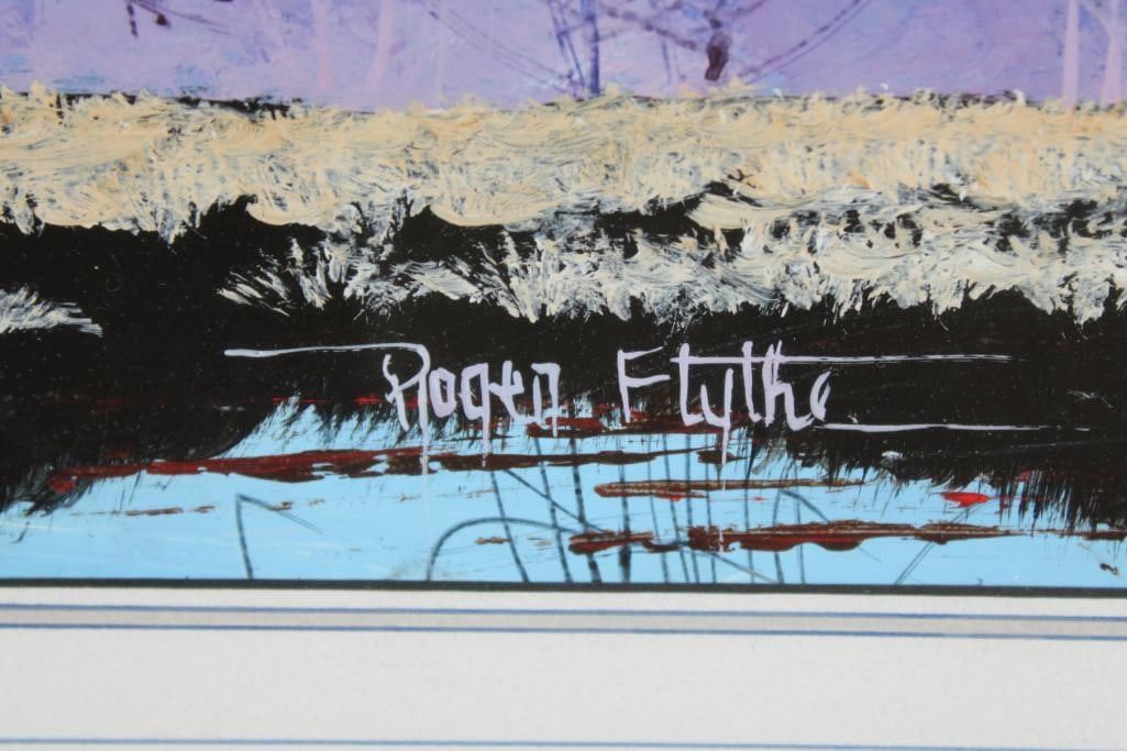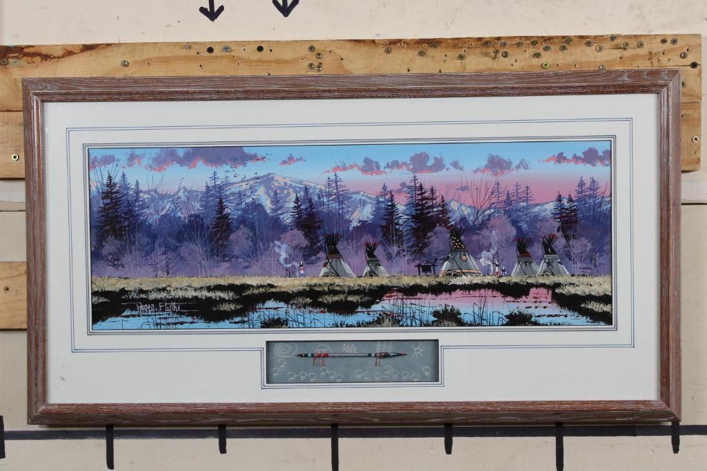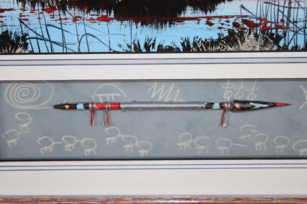 "River Reflections" Original Acrylic Painting. It has been Personalized and signed by the artist Roger Flythe. It is in a very nice wooden frame with glass that measures 34.25" Wide x 18.25" Tall. At the bottom of the painting is a shadowbox that contains a hand painted and decorated Native American Spear. This is a beautiful and colorful piece, a wonderful addition to any collection. Roger Flythe is a well collected Colorado and New Mexico artist specializing in Western and Wildlife art. COLLECTIBLE PAINTINGS AND ART