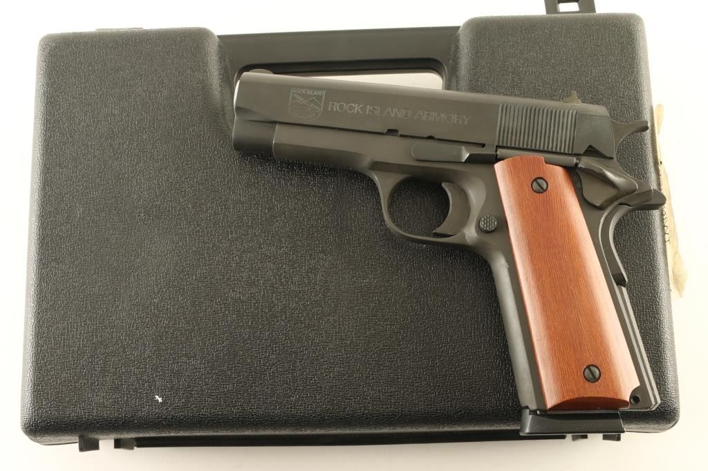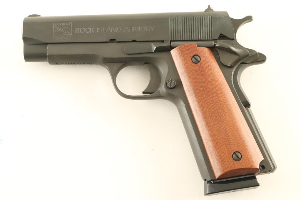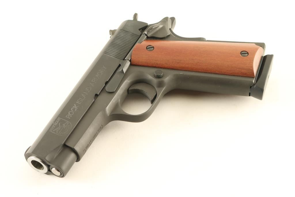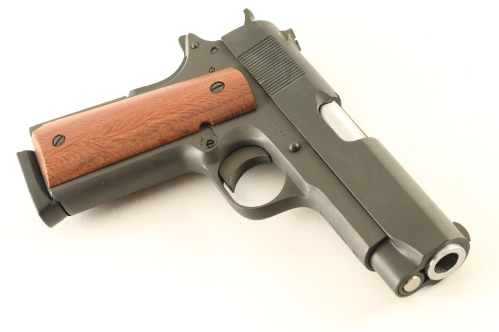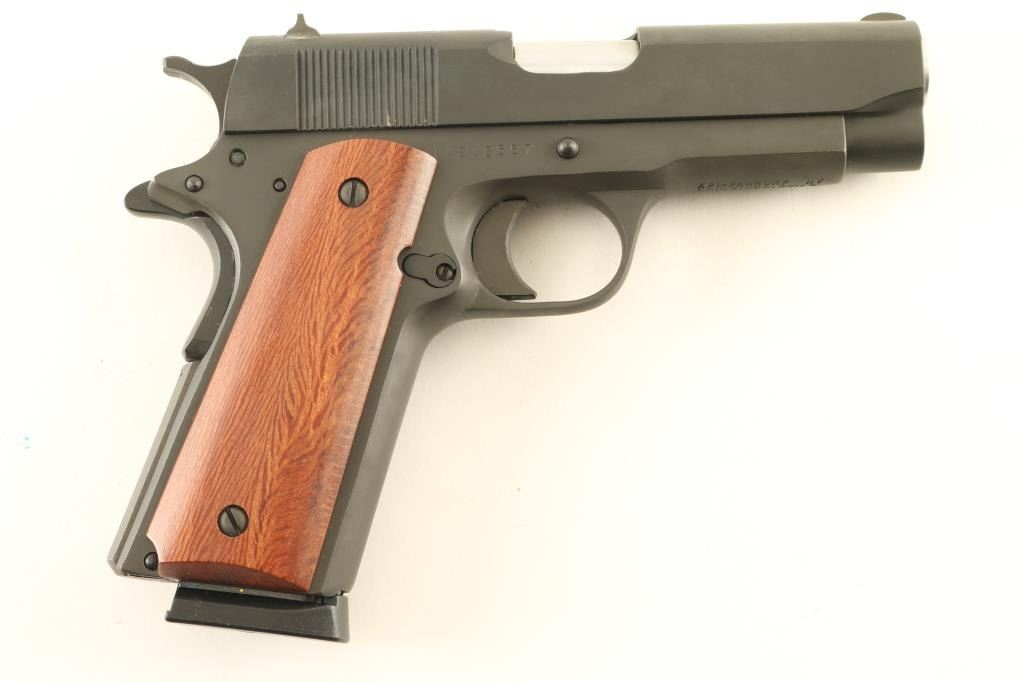 SN: RIA912557 'GI Series - MSP' Semiautomatic pistol made in the Philippines, imported by API, Pahrump NV. Features parkerized finish, 4" barrel. fixed sights, thumb safety, grip safety, full length (Government model) frame, flat serrated mainspring housing, smooth wood grips. Uses bushing-less design with reverse plug at muzzle. Bore is very good, needs cleaning. Overall condition is excellent with few signs of handling. Includes (1) magazine, factory plastic case. Condition is NRA Excellent *** Modern Firearm ***