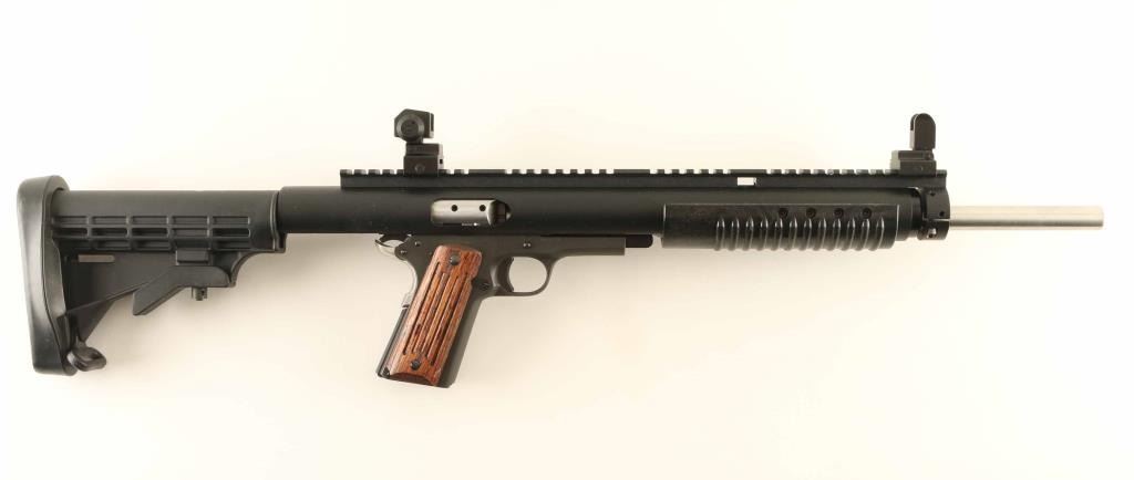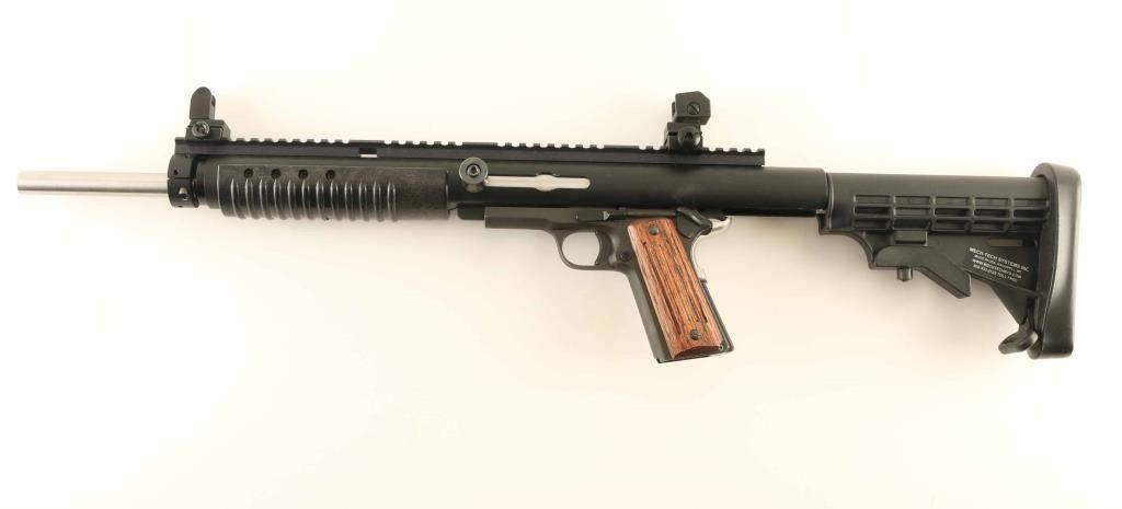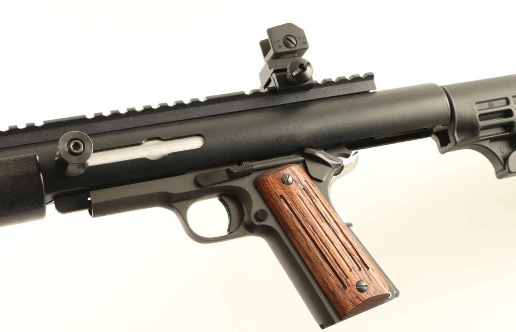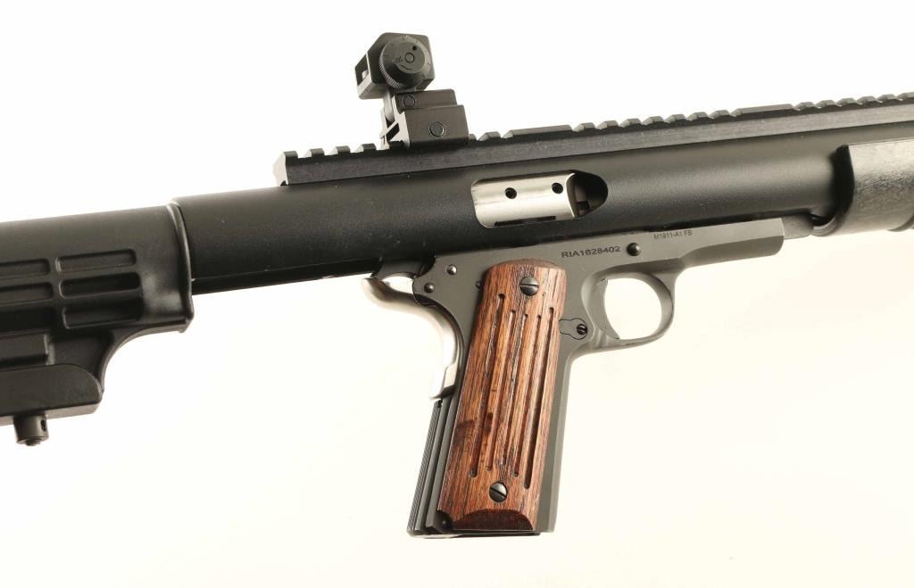 SN: RIA1628402 Phillipine Island manufactured semiautomatic carbine imported by AP INTL, Pahrump NV, consisting of the Rock Island 1911 style frame mated to a MechTech Systems Carbine Conversion Unit (CCU). Features matte blued frame, black painted CCU upper, 16" stainless steel barrel, 16" long Picatinny rail on top, flip-up detachable iron sights with protected front post and adjustable peep rear, manual safety, stainless beavertail grip safety with memory bump, grooved wood grips on pistol grip. Buttstock is a M4 style collapsing stock with removable rubber butt pad, does not collapse or adjust. Accepts 1911 style magazines. Bore is excellent. Overall appearance is like new with few signs of handling. No magazines included. Condition is NRA Excellent *** Modern Firearm ***