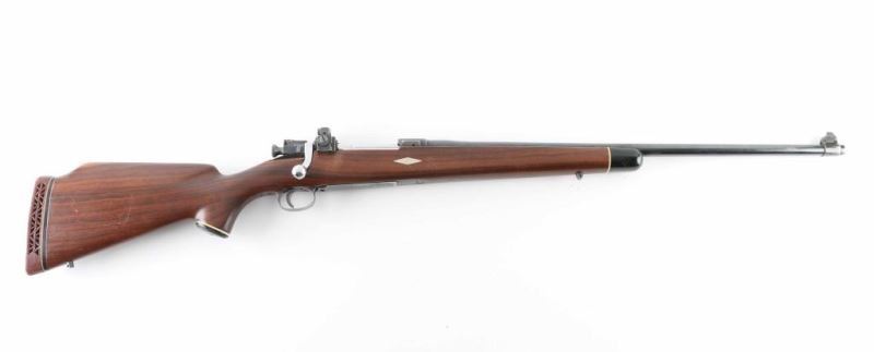 Sporterized US Military bolt action rifle features 24" barrel, blade front sight, receiver mounted rear peep sight, manual safety, blued finish, semi-pistol grip wood sporter stock, right hand cheekpiece with high comb, ventilated rubber recoil pad, sling studs, black forend tip & grip cap. Bore is fair to good condition, appears frosted or dirty, strong rifling, may improve with cleaning. Metal surfaces retain 50% bluing with much fading especially at receiver and over chamber, bare metal on edges and corners. Moderate sized gouge in barrel in chamber area, Bolt body is chromed or nickel plated, with swept back handle. Wood is good condition, vintage commercial sporter stock similar to a Fajen or Bishop, with many small scratches & nicks. Recoil pad is hard. Condition is NRA Good++ *** C&R Firearm ***