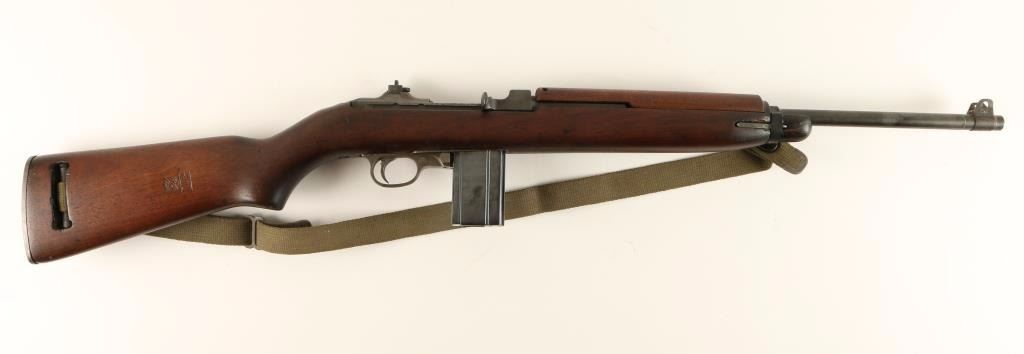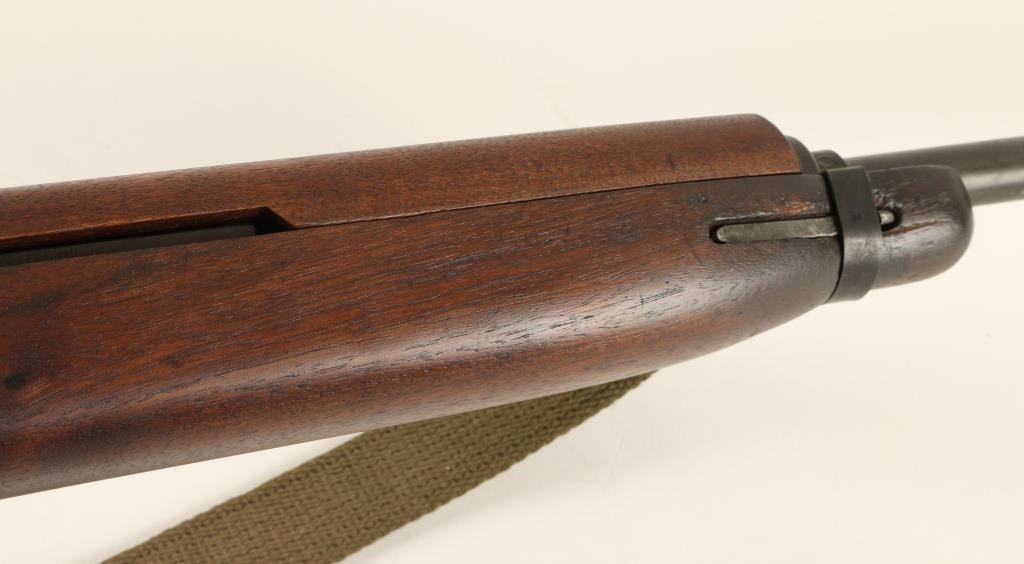 Rare early production U.S. Military contracted semi-automatic rifle chambered in .30 Carbine, circa 1942. Features a parkerized finish, 18" Rock-Ola barrel, winged front sight, flip-up dual aperture rear sight, slim barrel band with sling swivel, high-wood hand guard with wide groove, "I" cut oiler slot, push button safety, 15 round magazine, smooth trigger, flat bolt, and wood pistol grip stock with "RMC" cartouche & 'Crossed Cannons'. Includes period oiler and sling. Rifle retains 60% parkerized finish with wear from handling and use. Action is smooth, bore is excellent, and wood stock is very good with minimal blemishes. Condition is very good as vintage. ***C&R Firearm*** ***Modern Firearm***