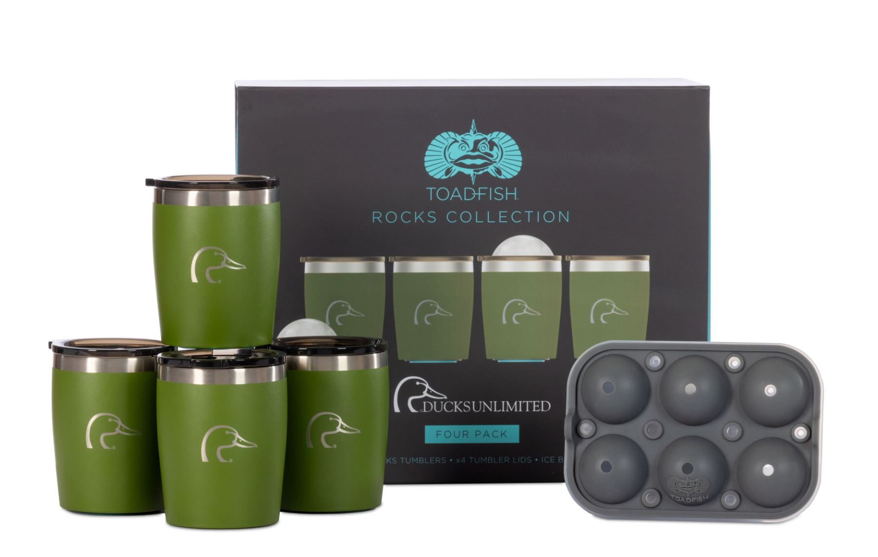The Rock Tumbler Set by Toadfish introduces both elegance and practicality to your beverage experience. This set features four non-tipping, stainless steel, double-walled tumblers, each holding 10 ounces of either hot or cold drinks. The tumblers come with a shatter-proof lid, removable slider, and built-in graduated measurements, ensuring a versatile and convenient drinking experience. Exclusively designed in a custom green color for Ducks Unlimited, each tumbler bears the laser-engraved duckhead logo, a mark of distinction. The set is complemented by a food-safe, silicone ice ball tray with six compartments, adding a touch of sophistication to your drinks. Housed in a co-branded custom box, the Rock Tumbler Set harmoniously blends functionality and style, offering a refined and practical solution for both your indoor and outdoor adventures.