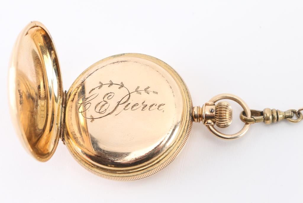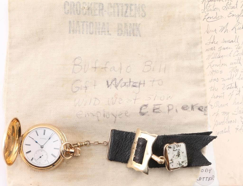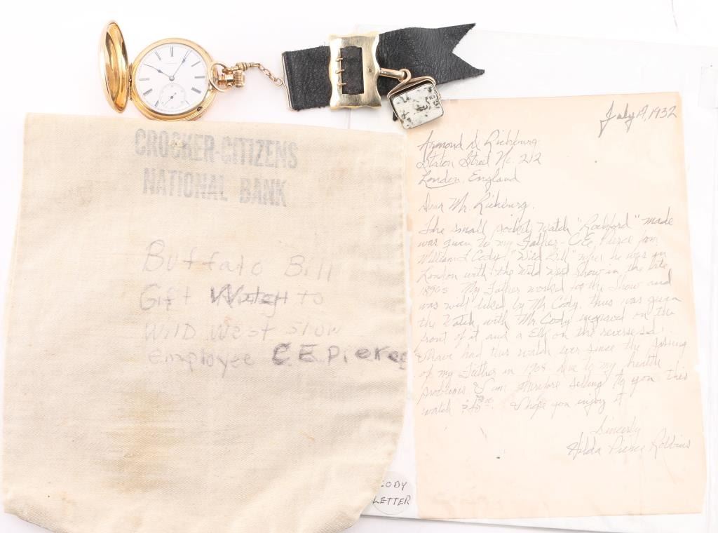 Rockford hunting case pocket watch inscribed in 19th Century period script on dust cover. C.E. Pierce with documenting letter, dated July 17, 1932, signed by Hilda Pierce Robbins addressed London, England to Mr. Richburg stating in summary, that this watch was given by Buffalo Bill Cody to her father, whom he worked on the Wild West Show and that he was well liked by Cody. There is also a beautifully engraved scene of Cody shooting an antelope on horseback with mountains in the background, on cover and an elk drinking at a stream, on back. Not a "Stock" engraving, custom ordered. Case shows anchor and gold marking with period fob included.