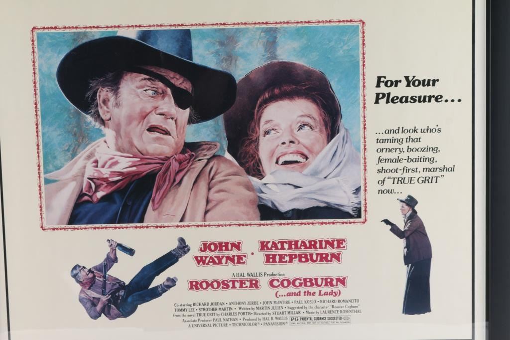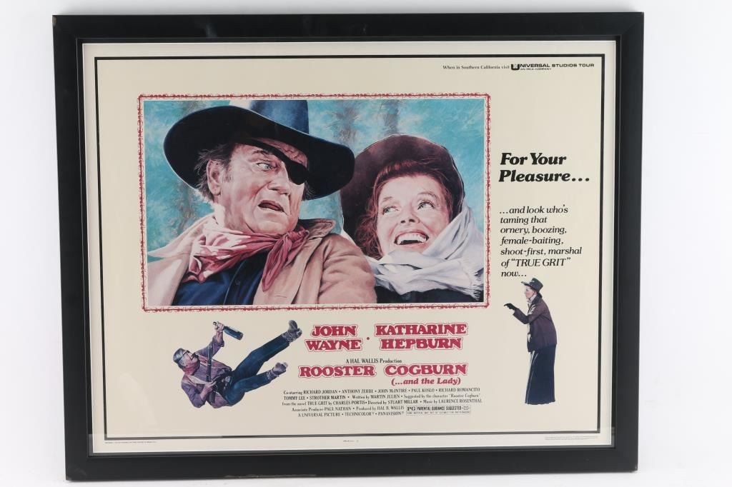 Starring John Wayne and Katherine Hepburn. Copyright 1975, Universal Pictures County of Origin USA. Measures 21 1/2" x 27 1/2", framed. One inch width black frame has some wear on its four corners.