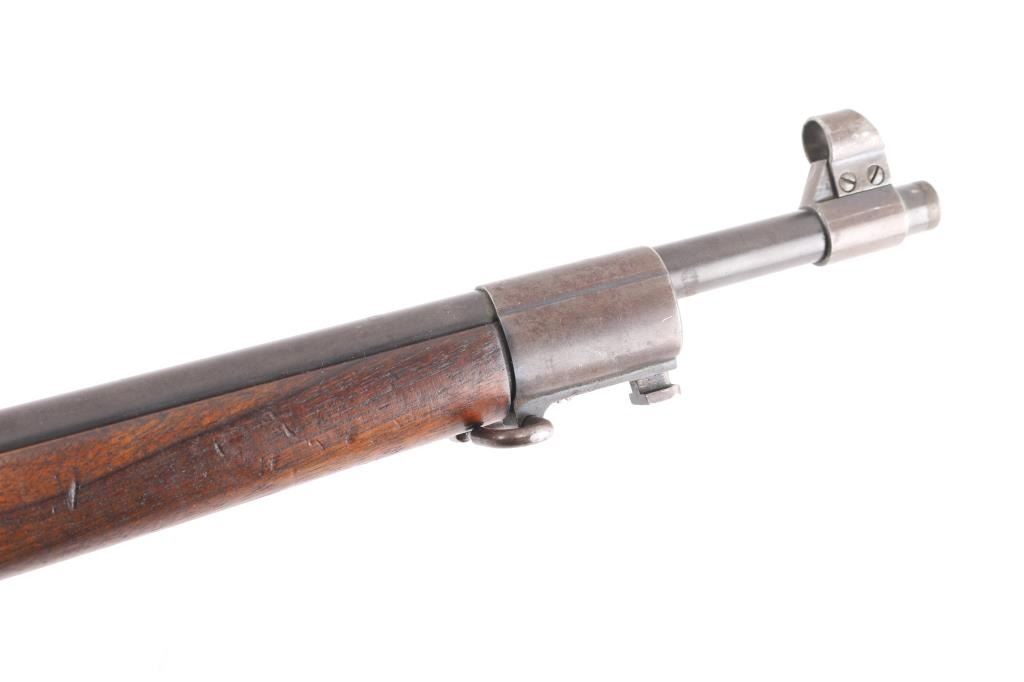 M1905' WW 1 era Canadian military rifle chambered for the 303 British cartridge. Straight pull. Features a right side mounted lever for depressing the magazine follower, bolt catch lever on rear left side of receiver, and a lever in the triggerguard that retracts the cartridge stop to allow rapid unloading. Barrel length is 28 inches, with hooded blade front, and adjustable Pilbald rear sights. Sliding trap door in butt. Bore is ok, with strong rifling, dark frosting in the grooves. Metal finish has thinned with areas turning a gray patina with some scattered areas of light pitting on the chamber. Stock is very good with the usual scratches/dings. Right buttstock has Quebec cartouche with Canadian proofs, 1908 date, unit markings. Left receiver rail marked "Ross Rifle Co. Quebec, Canada, 1905". Action is smooth/tight. The underside of the grip is stamped "U.S." with flaming bomb, and the serial number 6176, Ross rifles did not stamp the SN on metal, just the stock. But for ATF purposes we could not use it. No import marks observed. Comes with green canvass sling. In1917, the U.S. Government purchased 20,000 Ross rifles and bayonets from Canada.