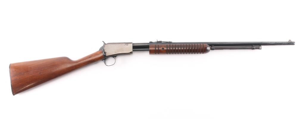 Reproduction of the Winchester Model 62 slide action repeating rifle, manufactured in Brazil by Amadeo Rossi SA. Imported by Interarms of Alexandria, VA with import stamp on the left side of the barrel. Features a blued finish with plum colored receiver, 23" octagonal barrel, 4/5 length tube magazine, dovetailed blade front sight, elevation adjustable rear sporting sight, serrated trigger, exposed hammer with serrated spur, take-down steel receiver, large grooved wood slide handle and straight grip shoulder stock with factory buttplate. Rifle retains approximately 90% of its original blued finish showing light edge wear and slide wear on the tube, action bar. Action is smooth, the bore is fair to good with some light pin-prick pitting towards the muzzle and wood stocks are very good with some blemishes.Condition is near NRA Good. Modern Firearm.
