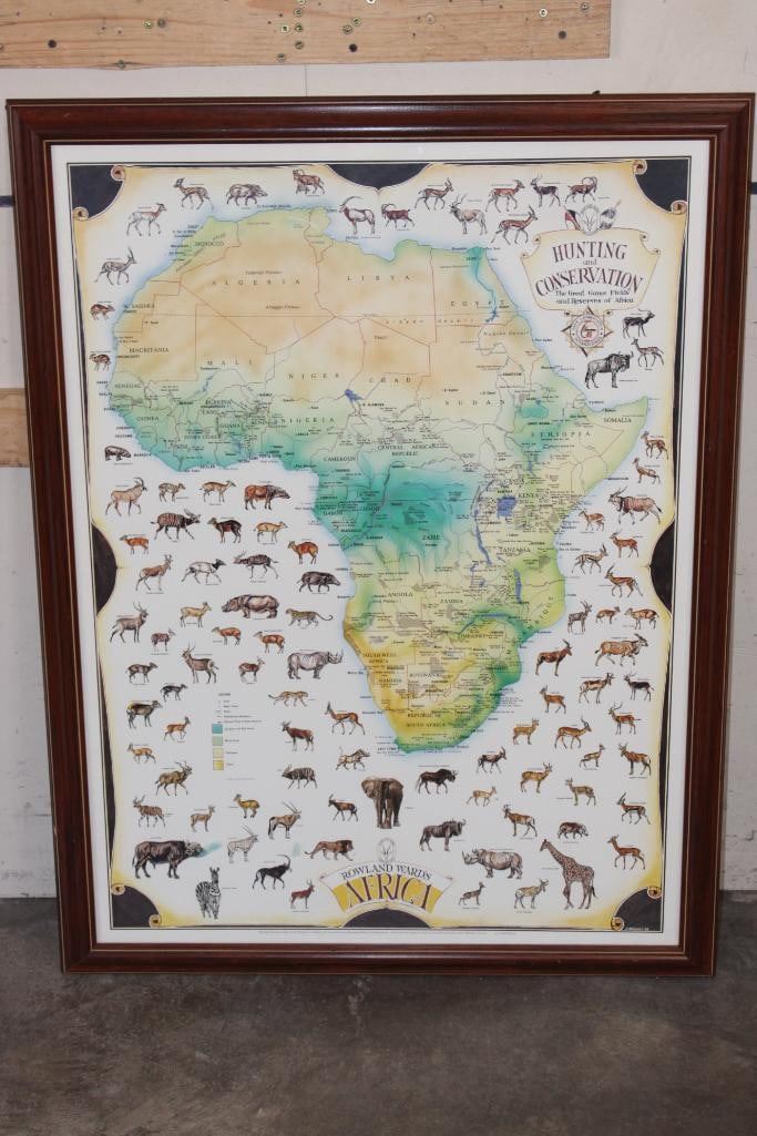 "Rowland Ward's Africa" "The great game fields and reserves of Africa" Map Print by artist E. Buckley 1988. It is displayed in a Wood and Glass Frame that measures 41" Tall x 31" Wide. This Map has incredible artwork of the African animals with their proper name underneath. It was "Designed and produced by Stephen J. Smith and Associates for Rowland Ward Publications, a division of game conservation international San Antonio, Texas 1988". COLLECTIBLE AFRICA MAPS AND AFRICAN ART