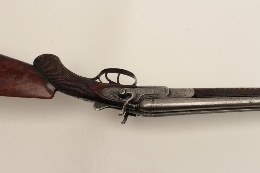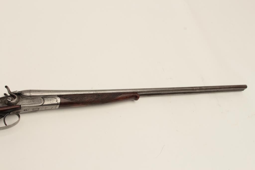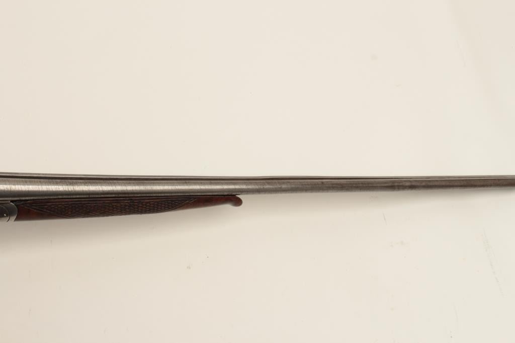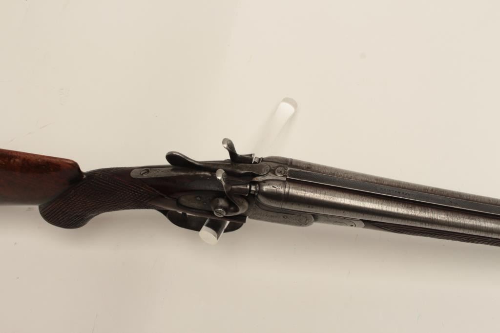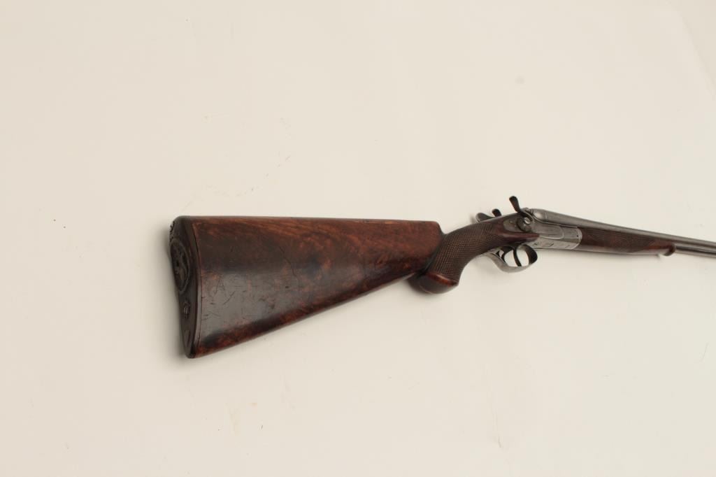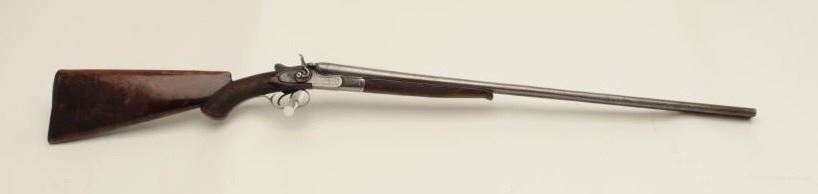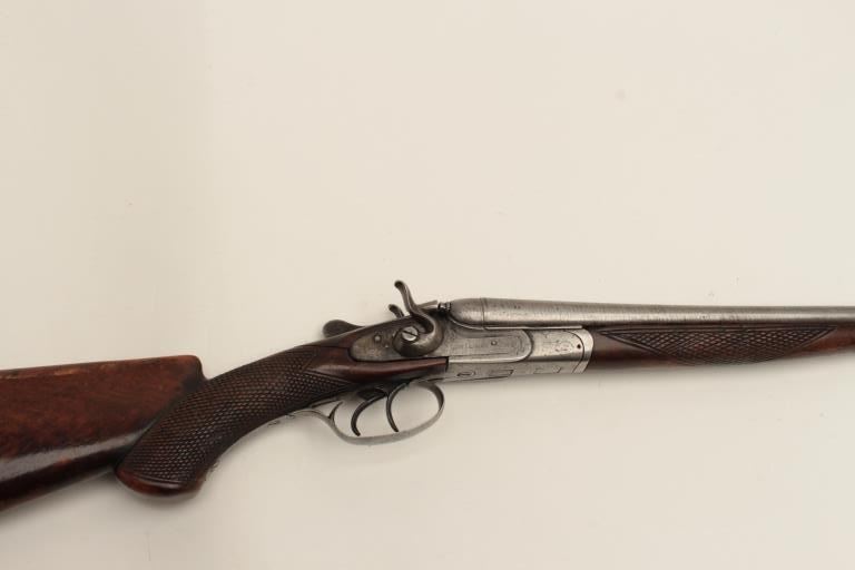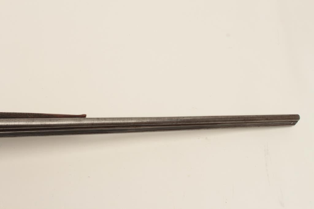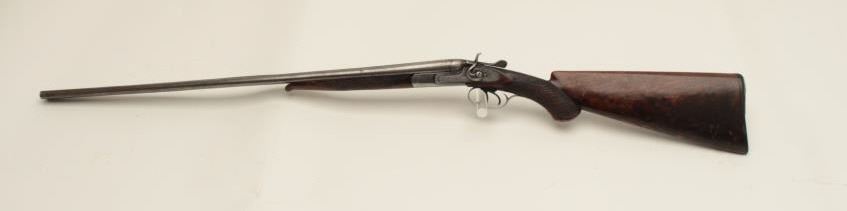 Royal Gun Works “Little Pet” Model SxS exposed hammers shotgun, .410 gauge, 24” damascene barrels, checkered wood stocks, no visible S/N, in overall fair to good condition with light grey patina to metalsurfaces, good actions, barrel release needs adjustment, butt stock is cracked at top of wrist area. (Antique). Est.: $200-$400.