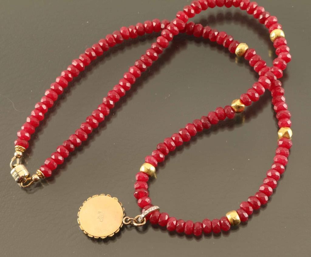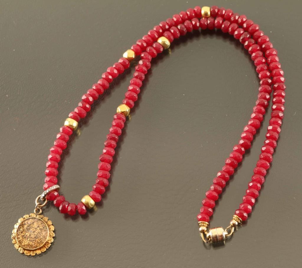 round cut ruby and gold beads with a 10Kt gold pendant with gold flakes inside small crack to pendant glass with diamonds set in hanger measures 18" end to end.
