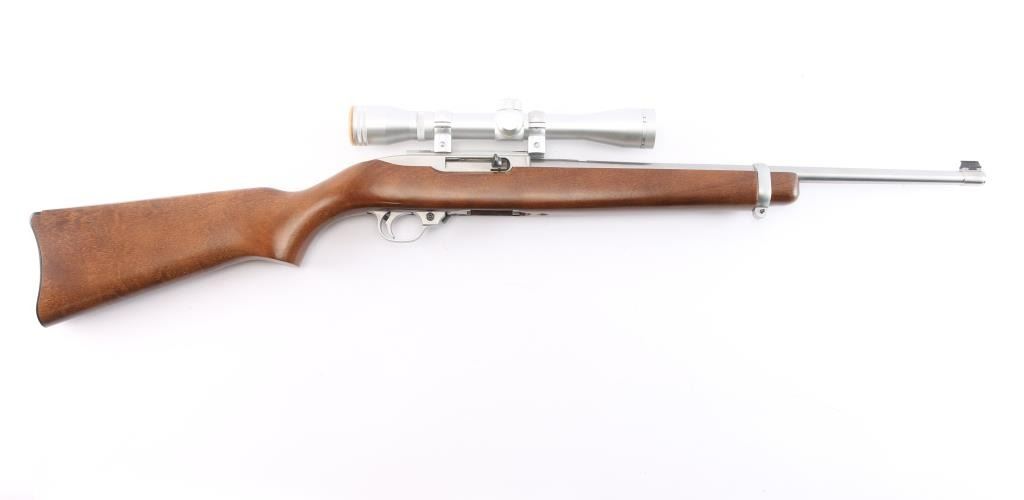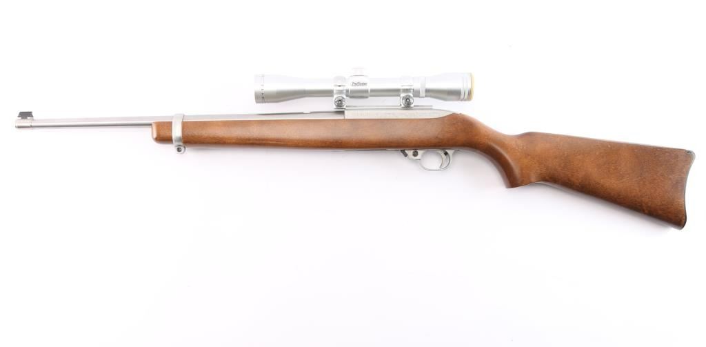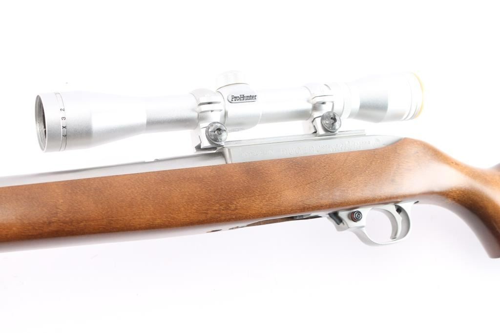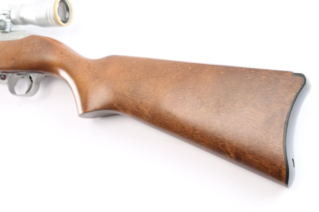 American made semi-automatic rimfire rifle. Features18.5" barrel, stainless steel upper receiver, smooth walnut stock with curved grip, curved black plastic buttplate, bead blade front sight, rear sight removed, push button manual safety, stainless trigger guard, barrel, and barrel band. Mounted with a Simmons ProHunter 4x32 scope, duplex reticle with factory base & rings. Metal finish is excellent. Stock is excellent and the bore is excellent/bright. Scope has clear optics. No Magazine.