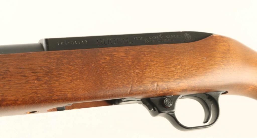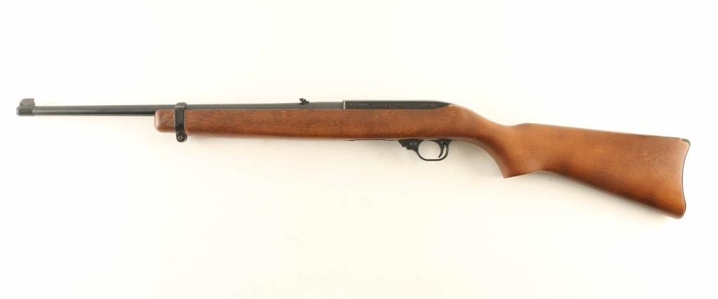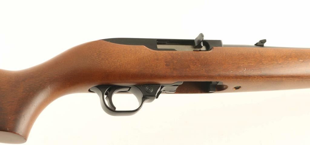 Semiautomatic rimfire rifle features 18.5" barrel, adjustable sights, manual safety, blued finish, wood stock. Bore is very good, needs cleaning. Retains 80% blued finish with scrapes and scratches on barrel and receiver, areas of patina and some pitting on barrel. Stock is very good condition with scratches, creases, dents. No magazine included. Condition is NRA Good *** Modern Firearm ***