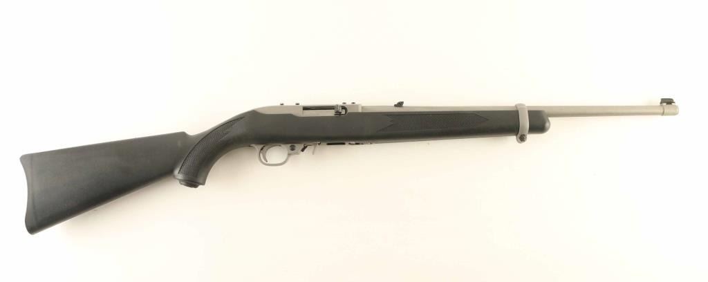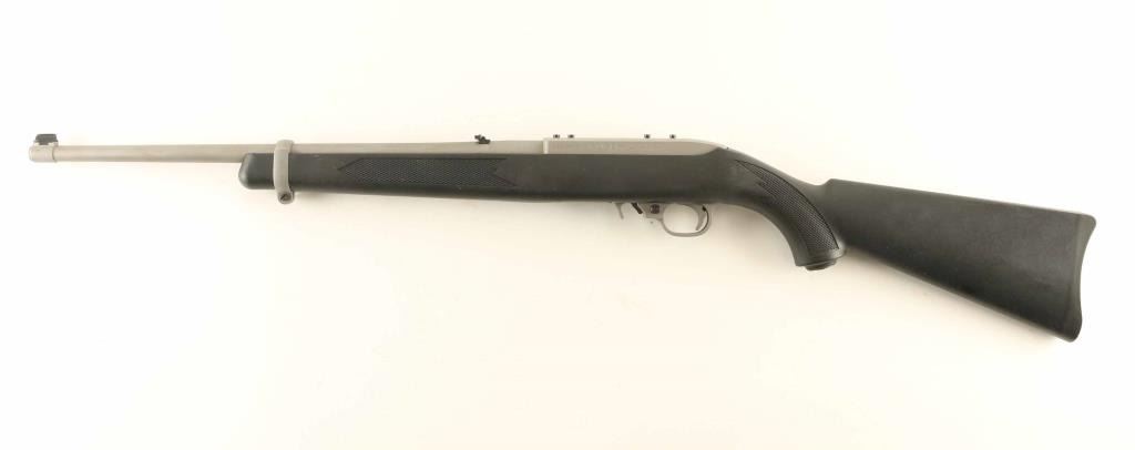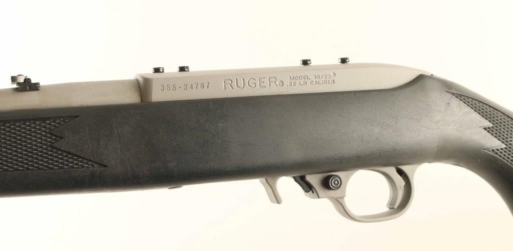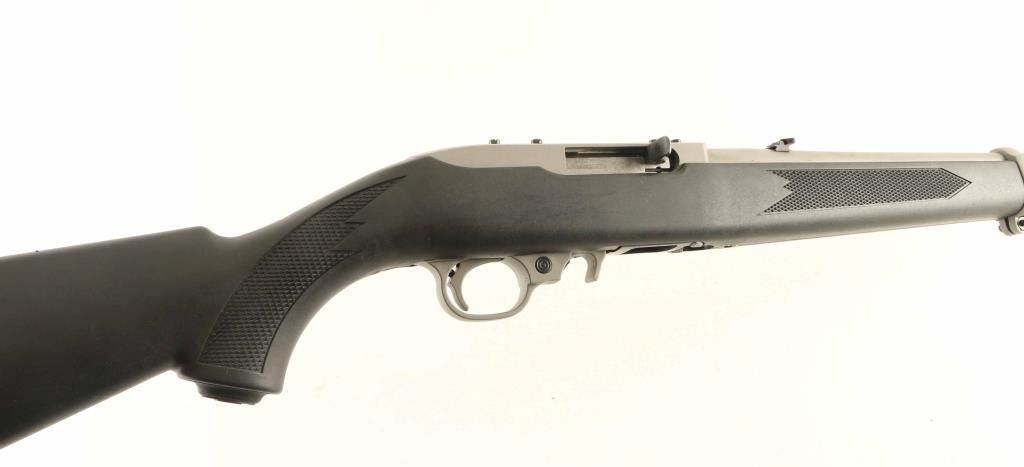 Semiautomatic rimfire rifle features 18.5" barrel, adjustable sights, manual safety, extended magazine release lever, medium gray satin finished metal, black polymer stock. Bore is very good or better, needs cleaning. Overall condition is near excellent with some handling marks and other signs of use, small scrapes to side of barrel. Includes one good condition 10 shot magazine. Condition is NRA Very Good+ *** Modern Firearm ***