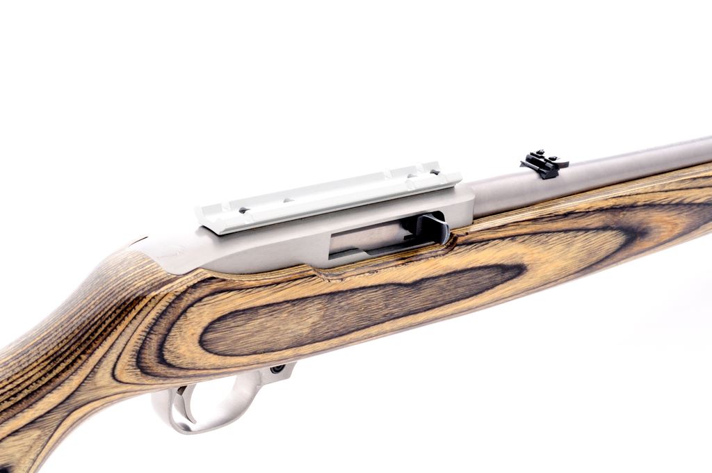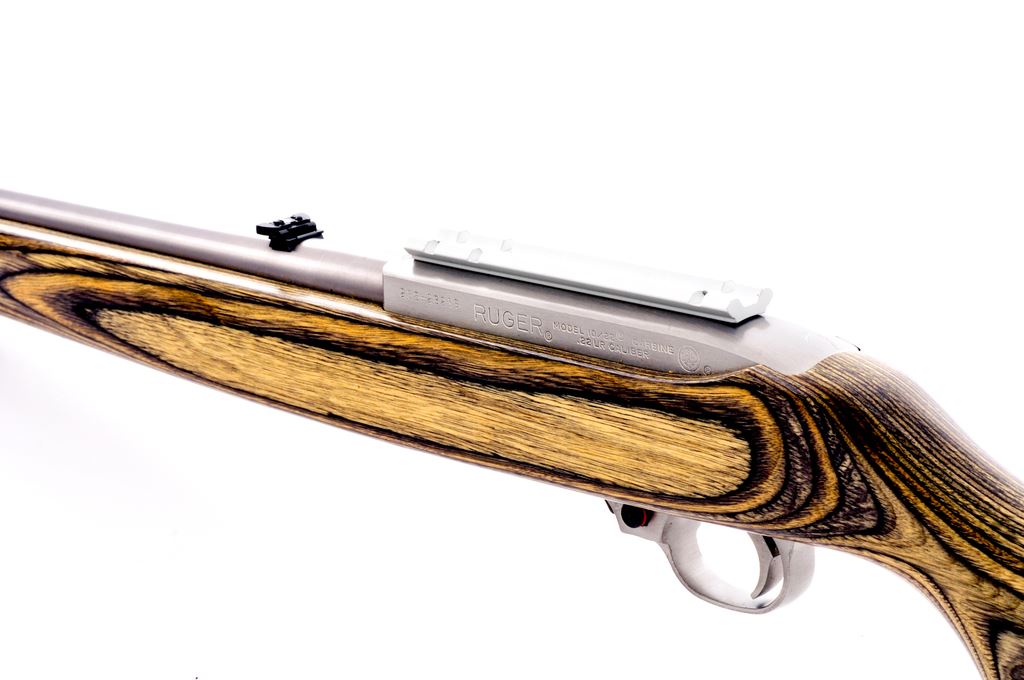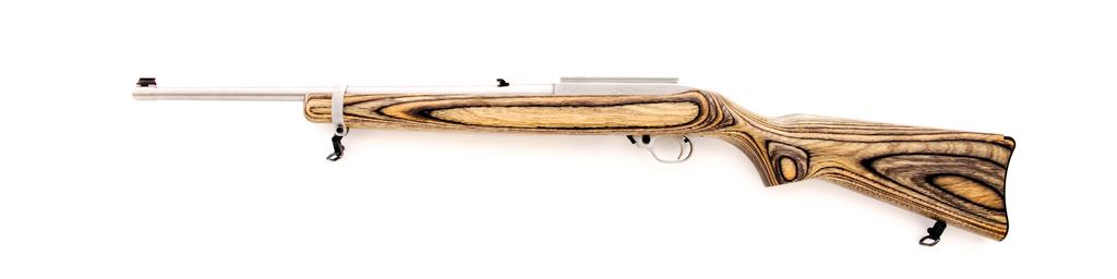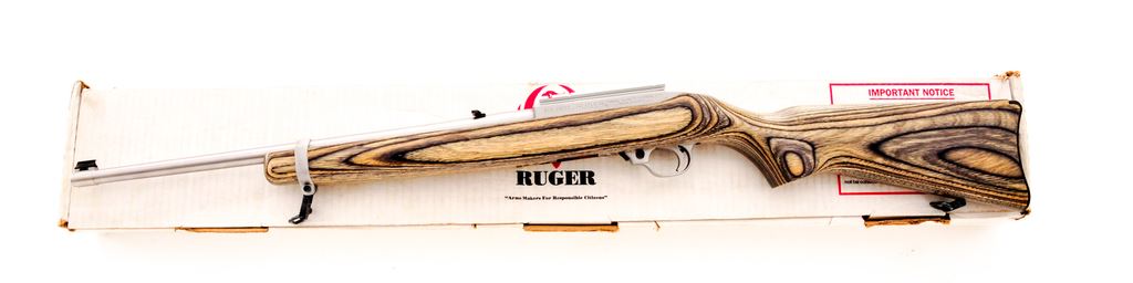 Ruger 10/22 Semi-Automatic Rifle, #238-23219, .22 LR cal., 18.5'' barrel, satin stainless finish, black laminate stock, quick-release sling swivels, standard sights, with one factory 10-round magazine. Topped with a one-piece silver scope base. In a Ruger box that is numbered to another gun with gun lock and muzzle brake. In excellent overall condition. Rear of receiver with a few scratches. Stock shows intermittent very light marks from handling. Action is smooth with a bright bore. Est.: $200-$300. (Modern)