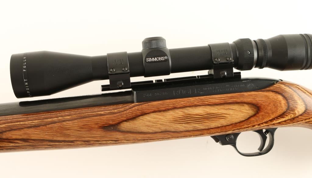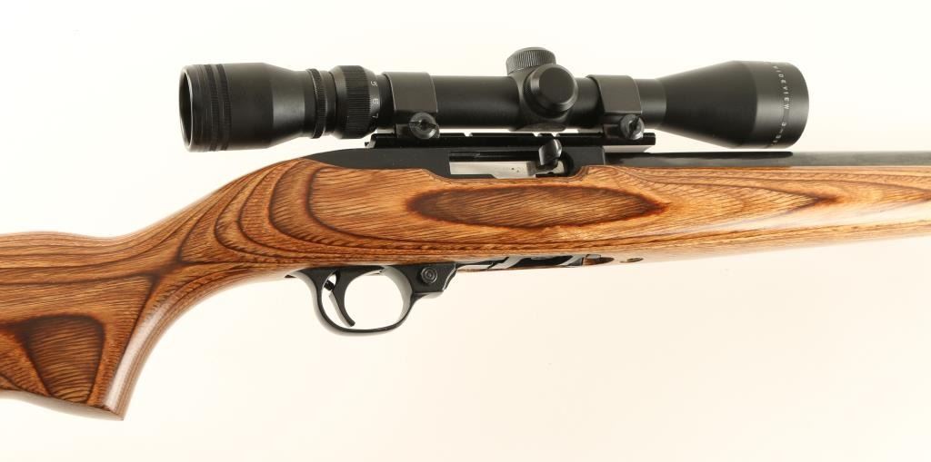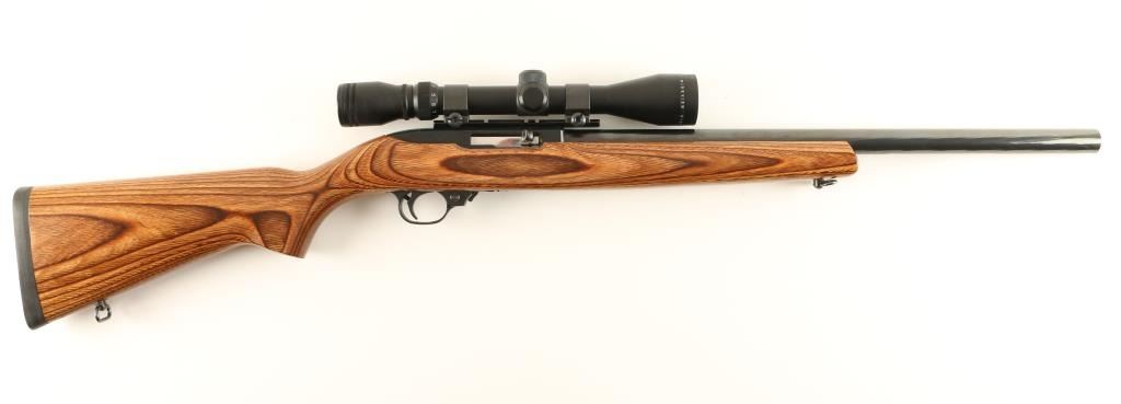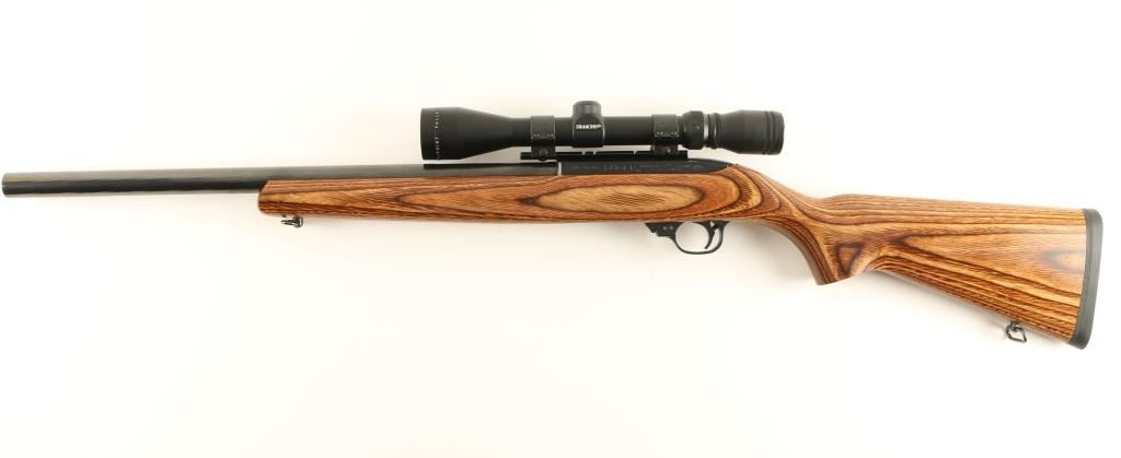 Premium semi-automatic target 10/22 rifle chambered in .22 Long Rifle. Features a blued finish, 20" hammer forged bull barrel with recessed crown, no sights, Simmons 3-9x 40mm scope, 10 round factory magazine, push button safety, two stage trigger, polished bolt, sling swivels, and brown laminated wood pistol grip shoulder stock with rubber recoil pad. Safety appears to be stuck in the 'safe position'. Rifle bares a few moderate scratches to the blued finish with 96% overall finish intact. Action is crisp, bore is excellent and wood stock is fine with minimal blemishes. Condition is very good. ***Modern Firearm***