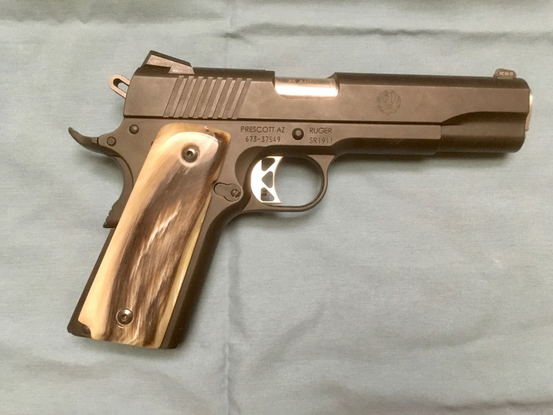 This beautiful Ruger 1910 black Nitrade model #6709 .45 caliber automatic pistol features an authentic and highly unique desert bighorn sheep horn grip designed and constructed by Life Member Brian Jansen, the Arizona Game and Fish Department employee responsible for overseeing the highly successful desert bighorn recovery program on the Kofa National Wildlife Refuge. Since the gun handle was made from genuine animal products and fashioned by hand in the field rather than being tooled by machine in a factory, some slight imperfections should be expected. This is truly one of a kind. The pictures do not do justice... To quote Johnny Lawrence, this is BITCHIN!