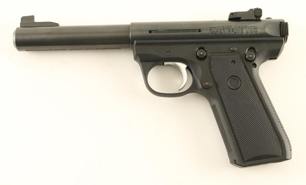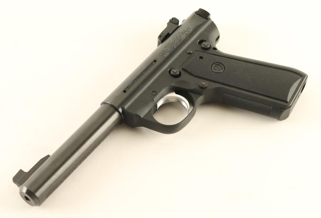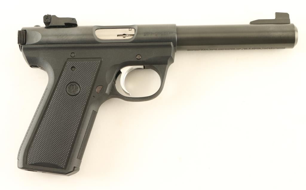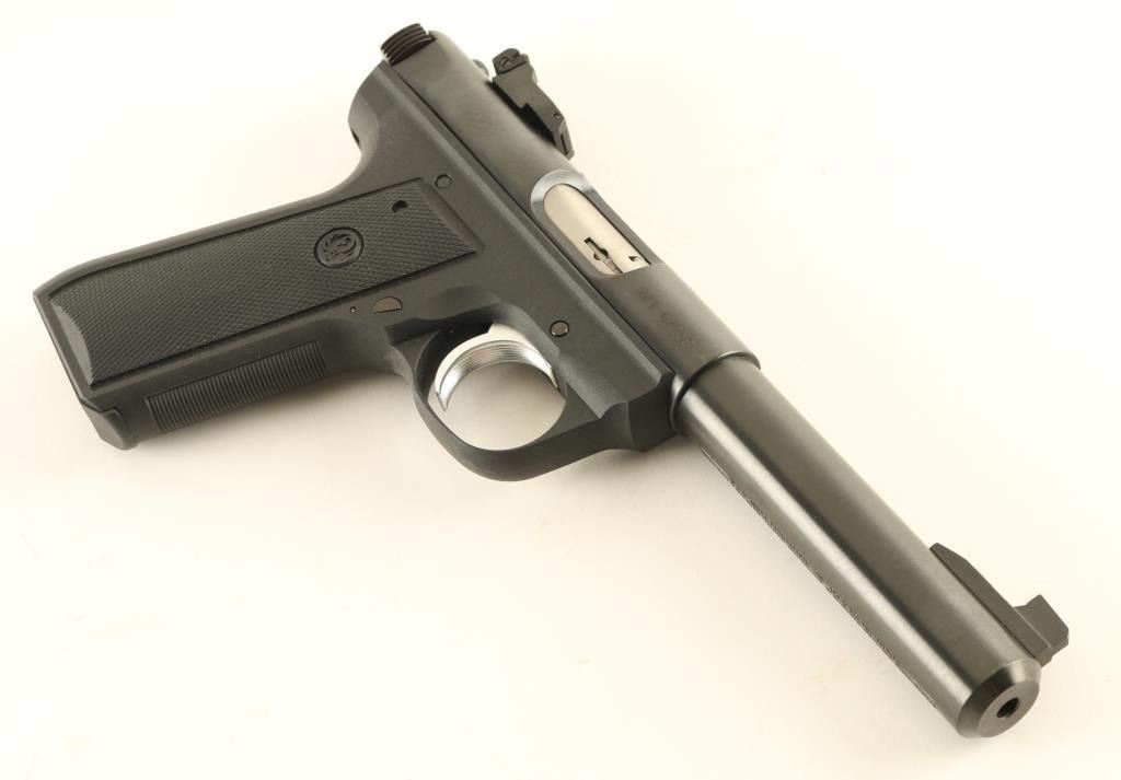Semiautomatic rimfire pistol features blued finish, black polymer frame with checkered panels, 5.5" heavy barrel, adjustable sights, push button magazine release, manual safety, nickel plated trigger, loaded chamber indicator. Bore is excellent. Overall condition is almost like new with few signs of handling. Includes one magazine. Condition is NRA Excellent *** Modern Firearm ***