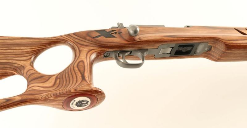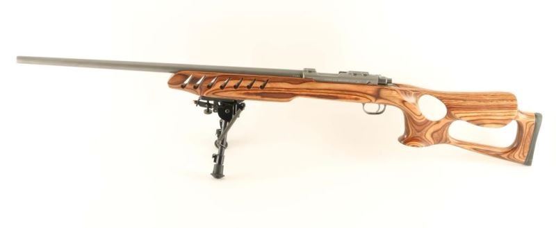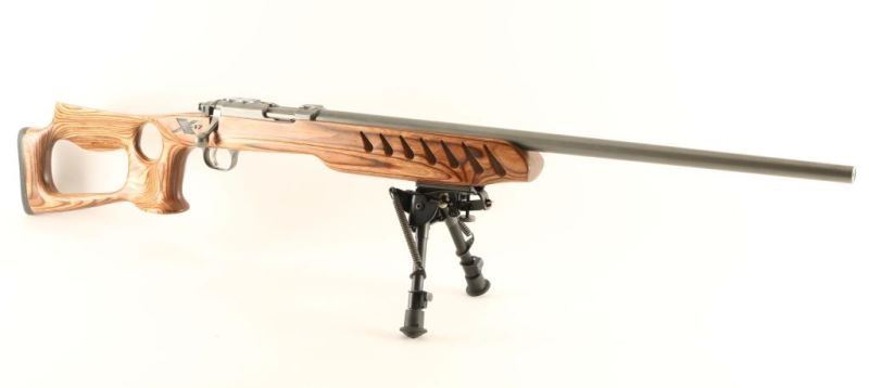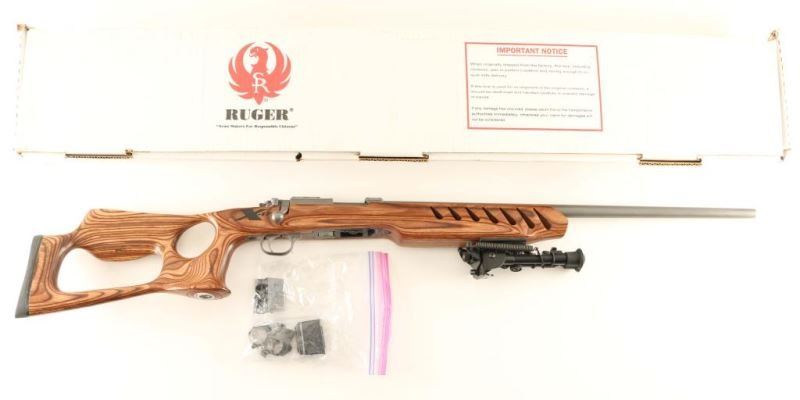 Talo limited edition stainless steel bolt action target rifle chambered in .17 Hornady Magnum Rimfire, circa 2006. Target grey finish, 24" barrel with no provisions for sights, integral scope rail cuts in the receiver, factory rotary magazine, smooth trigger, Harris S BRM 6-9" bipod, manual safety, and X-17 brown laminated wood thumb hole pistol grip shoulder stock with vented forend, Ruger inlay in the bottom of the grip & recoil pad. Includes the original factory cardboard box with documents, rings, and two extra magazines. Rifle shows little to no visible wear. Action is very smooth, bore is excellent and wood stock is fine. Condition is near new in box. ***Modern Firearm***